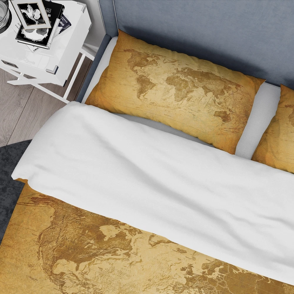 Transform your bedroom into a stylish and inviting sanctuary with this luxurious Designart 'Vintage Classic Map' Contemporary Bedding Set. Printed with high-density Italian ink, this global-inspired set features an ultra-soft and lightweight 100% microfiber polyester material that is wrinkle-resistant and odorless, ensuring a comfortable and restful night's sleep. This set includes 1 Duvet Cover and 2 Shams, available in twin, queen, and king sizes, making it a perfect addition to any bedroom decor.Features: Vibrant colors printed using High Density Italian Ink Ultra-soft, lightweight, and wrinkle-resistant 100% microfiber polyester material Global-inspired design with 1 bed cover and 2 pillow shams Trendy and fun elegant colors to brighten and update your bedroom Made in Canada Free Shipping Over $49.99* Details Designart 'Vintage Classic Map' Contemporary Bedding Set - Duvet Cover & Shams Product Description: Transform your bedroom into a stylish and inviting sanctuary with this luxurious Designart 'Vintage Classic Map' Contemporary Bedding Set. Printed with high-density Italian ink, this global-inspired set features an ultra-soft and lightweight 100% microfiber polyester material that is wrinkle-resistant and odorless, ensuring a comfortable and restful night's sleep. This set includes 1 Duvet Cover and 2 Shams, available in twin, queen, and king sizes, making it a perfect addition to any bedroom decor. Features: Vibrant colors printed using High Density Italian Ink Ultra-soft, lightweight, and wrinkle-resistant 100% microfiber polyester material Global-inspired design with 1 bed cover and 2 pillow shams Trendy and fun elegant colors to brighten and update your bedroom Made in Canada Comforter inserts and pillow inserts not included Product Details: MaterialPolyester PatternGeometric ColorBeige StyleGeometric Map, Global Inspired, Map ReversibleNo King: 1 Duvet Cover104 inches wide x 88 inches long 2 King Shams20 inches wide x 36 inches long Queen: 1 Duvet Cover88 inches wide x 88 inches long 2 Standard Shams16 inches wide x 26 inches long Twin: 1 Duvet Cover68 inches wide x 88 inches long 1 Standard Sham16 inches wide x 26 inches long Care Instructions: Machine wash on cold gentle cycle. Wash separately on first wash. Use only non-chlorine bleach when needed. Tumble dry low. Remove promptly.