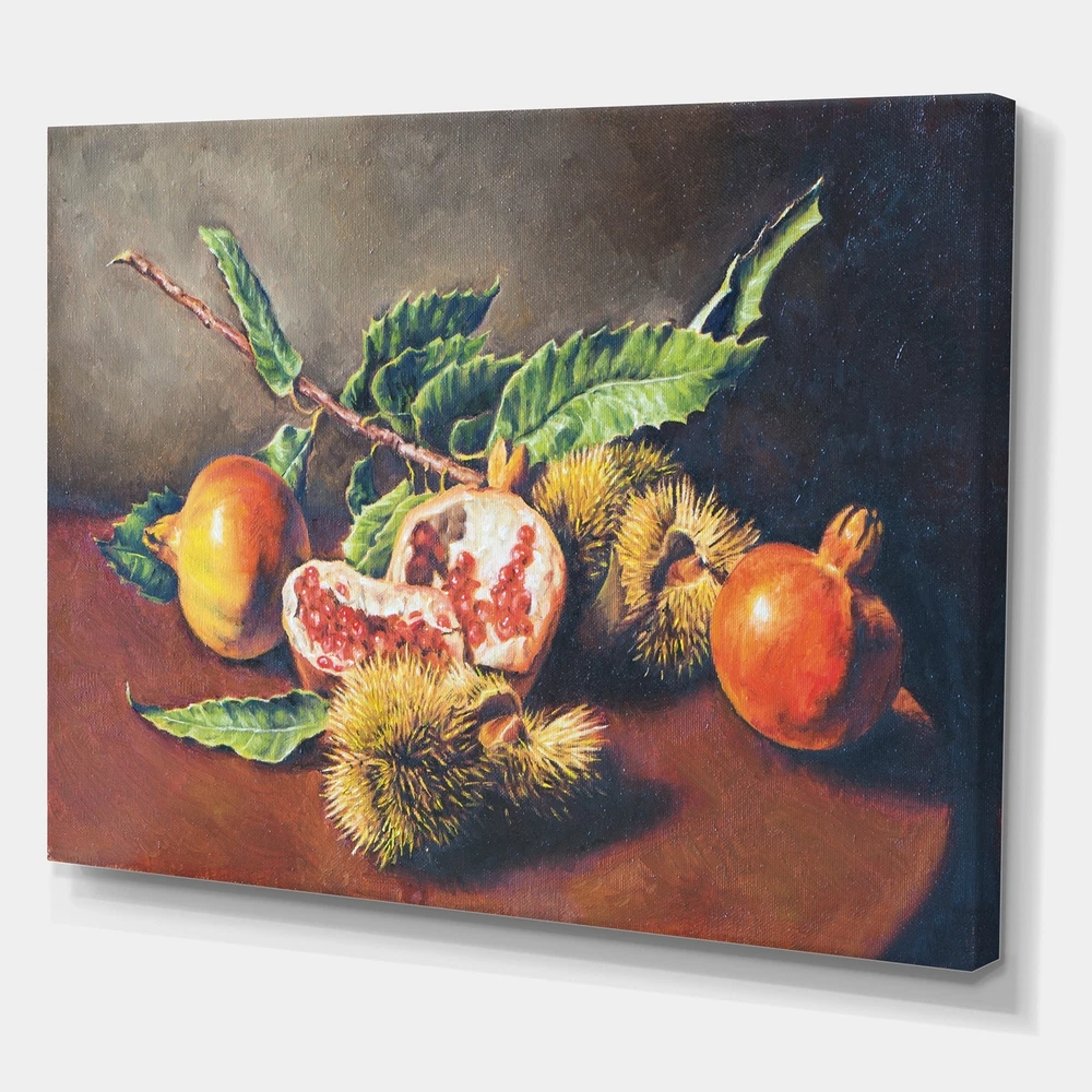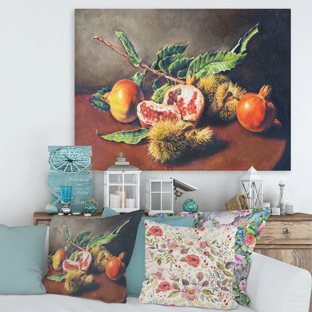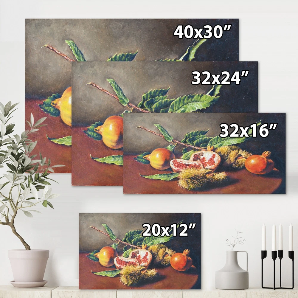 This beautiful Traditional Canvas Art is printed using the highest quality fade resistant ink on canvas. Every one of our fine art giclee canvas prints is printed on premium quality cotton canvas, using the finest quality inks which will not fade over time. Each giclee print is stretched tightly over a 1 inch wood sub frame for small size prints or a 1.5 inch wood sub frame for large size prints (40x30 36x36 ...) ensuring the canvas is taught and does not buckle. This canvas art print is gallery-wrapped (the design continues on the sides) , giving it a real art gallery feel. All of our canvas prints are carefully packaged with plastic protection, fragile labeling and sturdy boxes to ensure a safe delivery. Every canvas print arrives ready to hang on the wall, with the hanging kits Free Shipping Over $49.99* Details Designart "Vintage Still Life of Orange Fruits" Traditional Canvas Wall Art Product Description: This beautiful Traditional Canvas Art is printed using the highest quality fade resistant ink on canvas. Every one of our fine art giclee canvas prints is printed on premium quality cotton canvas, using the finest quality inks which will not fade over time. Each giclee print is stretched tightly over a 1 inch wood sub frame for small size prints or a 1.5 inch wood sub frame for large size prints (40x30 36x36 ...) ensuring the canvas is taught and does not buckle. This canvas art print is gallery-wrapped (the design continues on the sides) , giving it a real art gallery feel. All of our canvas prints are carefully packaged with plastic protection, fragile labeling and sturdy boxes to ensure a safe delivery. Every canvas print arrives ready to hang on the wall, with the hanging kits included. - Style Traditional,Farmhouse - Subject Food & Beverage, Country Charm - Color Yellow, - This canvas giclee print is gallery-wrapped (the design continues on the sides) , giving it a real art gallery feel. - Premium quality cotton canvas. - Arrives ready to hang on the wall - Easy to Hang