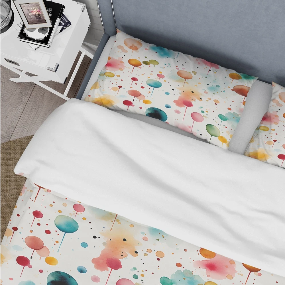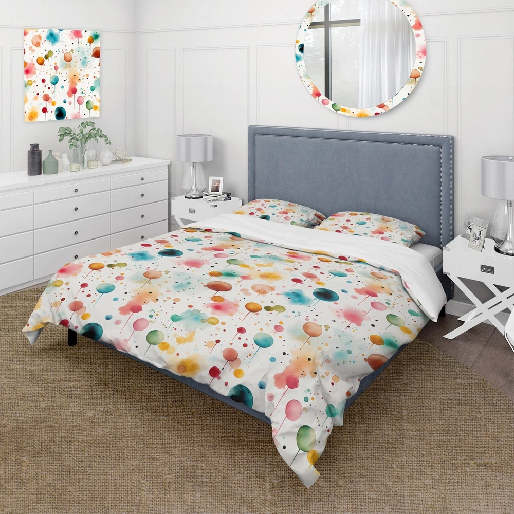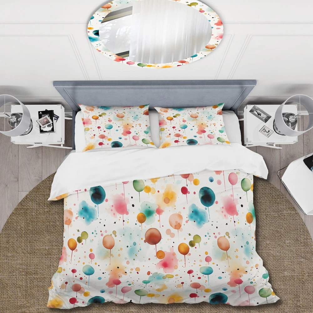 There is just nothing better than a beautiful, inviting comfortable bed after a long day. This Graphic Print, Geometric bed set is created using the richest colors stemming from high density Italian ink and the softest fabrics making it the perfect way to spruce up your bedroom, while keeping it ultra-comfortable. This luxurious Watercolor Dreams Polka Dots Pattern II bed design is made with 100% microfiber polyester, making it ultra-soft to ensure you sleep comfortably all night long. This Modern & Contemporary set includes 1 Bed Cover and 2 Shams and is available in twin, queen and king sizes.This Bedding Set is easily integrated into your already decorated space.What's Included? - Duvet Cover - Shams - Pillow Cases not included but can be buy separately - Comforter Free Shipping Over $49.99* Details Designart "Watercolor Dreams Polka Dots Pattern II" Modern Bed Cover Set With 2 Product Description: There is just nothing better than a beautiful, inviting comfortable bed after a long day. This Graphic Print, Geometric bed set is created using the richest colors stemming from high density Italian ink and the softest fabrics making it the perfect way to spruce up your bedroom, while keeping it ultra-comfortable. This luxurious Watercolor Dreams Polka Dots Pattern II bed design is made with 100% microfiber polyester, making it ultra-soft to ensure you sleep comfortably all night long. This Modern & Contemporary set includes 1 Bed Cover and 2 Shams and is available in twin, queen and king sizes. This Bedding Set is easily integrated into your already decorated space. What's Included? - Duvet Cover - Shams - Pillow Cases not included but can be buy separately - Comforter Insert NOT INCLUDED Features - Printed using High Density Italian Ink making the colors extra vibrant. - Made from ultra-soft, lightweight 100% microfiber polyester. Wrinkle resistant fabric. Down-like comfort, odorless. - The Modern & Contemporary bed set includes one bed cover and two standard pillow shams to create a complete and stylish look. - The elegant and soft colors are both trendy and fun to brighten and update your bedroom. - Made in Canada - Decorative Wall Art and throw pillows to match this set are available but sold separately. - Actual comforter inserts and pillow inserts are not included. This set includes the two pillow shams and comforter cover only. King Dimensions: - 1 Duvet Cover104 inches wide x 88 inches long - 2 King Shams20 inches wide x 36 inches long Queen Dimensions: - 1 Duvet Cover88 inches wide x 88 inches long - 2 Standard Shams16 inches wide x 26 inches long Twin Dimensions: - 1 Duvet Cover68 inches wide x 88 inches long - 1 Standard Sham16 inches wide x 26 inches long Product Details - MaterialPolyester. - PatternPolka Dots - ColorTeal - StyleModern & Contemporary - ReversibleNo Directions: Fabric Care InstructionsMachine wash on cold gentle cycle. Wash separately on first wash. Use only non- chlorine bleach when needed. Tumble dry low. Remove promptly.