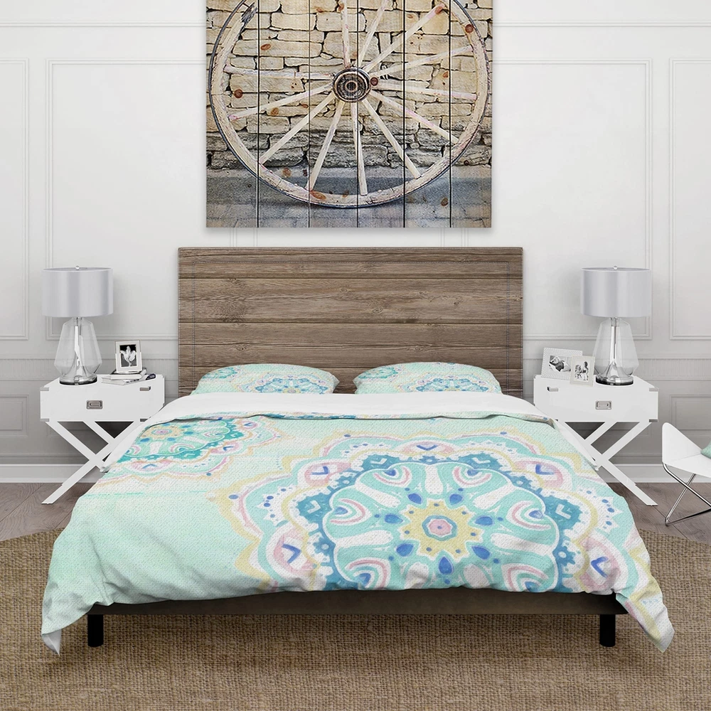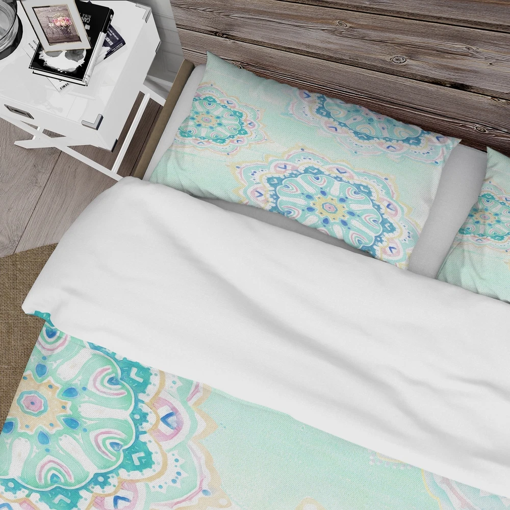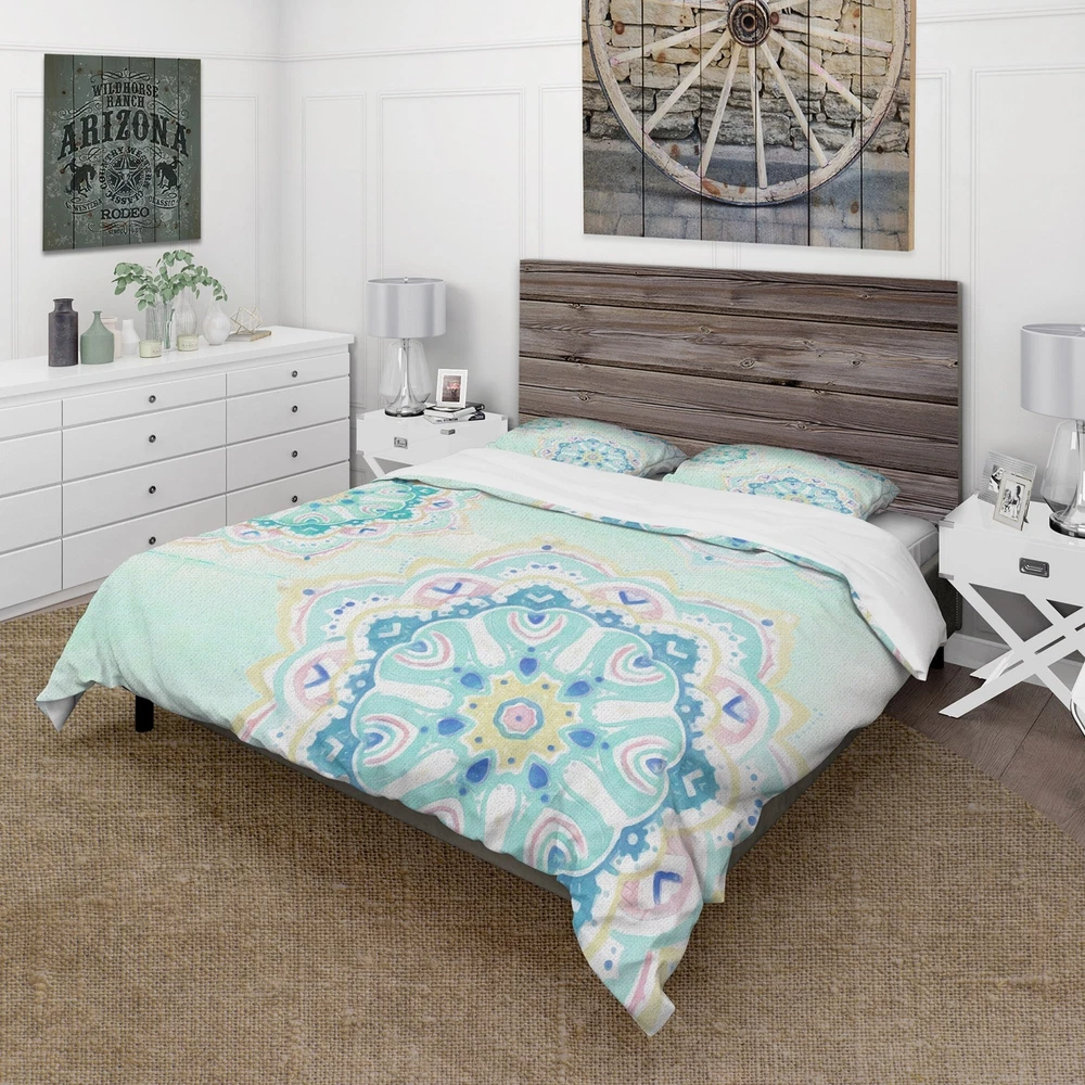 Bring a touch of charm to your bedroom with this beautiful watercolor mandalas bedding set. This set includes a duvet cover and matching shams, adding an organized and stylish look to your bedding. Made from soft and durable microfiber, this bedding set offers long-lasting comfort and easy maintenance. The duvet cover features a simple tie closure that keeps it securely in place. The elegant colors of this Farmhouse bedding set are both trendy and fun, brightening up your bedroom effortlessly.Features: High-density Italian ink printing results in vibrant colors. Made from ultra-soft, lightweight 100% microfiber polyester that is wrinkle-resistant and odorless. This Farmhouse bed set includes one duvet cover and two standard pillow shams, creating a complete and stylish look. The Free Shipping Over $49.99* Details Designart 'Watercolor mandalas IV' Cottage Bedding Set - Duvet Cover & Shams Product Description: Bring a touch of charm to your bedroom with this beautiful watercolor mandalas bedding set. This set includes a duvet cover and matching shams, adding an organized and stylish look to your bedding. Made from soft and durable microfiber, this bedding set offers long-lasting comfort and easy maintenance. The duvet cover features a simple tie closure that keeps it securely in place. The elegant colors of this Farmhouse bedding set are both trendy and fun, brightening up your bedroom effortlessly. Features: High-density Italian ink printing results in vibrant colors. Made from ultra-soft, lightweight 100% microfiber polyester that is wrinkle-resistant and odorless. This Farmhouse bed set includes one duvet cover and two standard pillow shams, creating a complete and stylish look. The elegant and soft colors are both trendy and fun to brighten and update your bedroom. Made in Canada. Decorative wall art and throw pillows are available to match this set (sold separately). This set includes the duvet cover and two standard pillow shams only. Comforter insert and pillow inserts are not included. Dimensions: King1 Duvet Cover104 inches wide x 88 inches long, 2 King Shams20 inches wide x 36 inches long. Queen1 Duvet Cover88 inches wide x 88 inches long, 2 Standard Shams16 inches wide x 26 inches long. Twin1 Duvet Cover68 inches wide x 88 inches long, 1 Standard Sham16 inches wide x 26 inches long. Product Details: MaterialPolyester. PatternFloral/Flower. ColorBlue. StyleFloral & Botanical, Cottage/Country, Floral. ReversibleNo. Directions: Machine wash on cold gentle cycle. Wash separately on first wash. Use only non-chlorine bleach when needed. Tumble dry low. Remove promptly.
