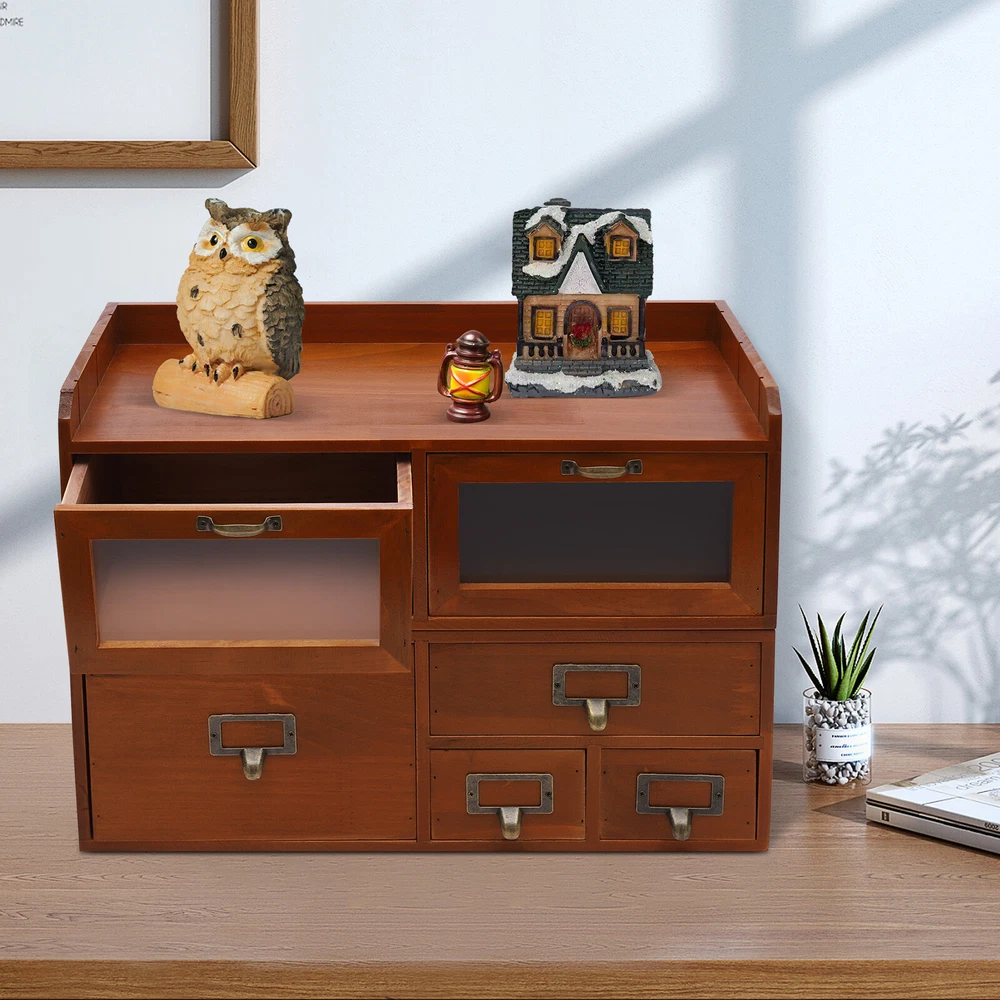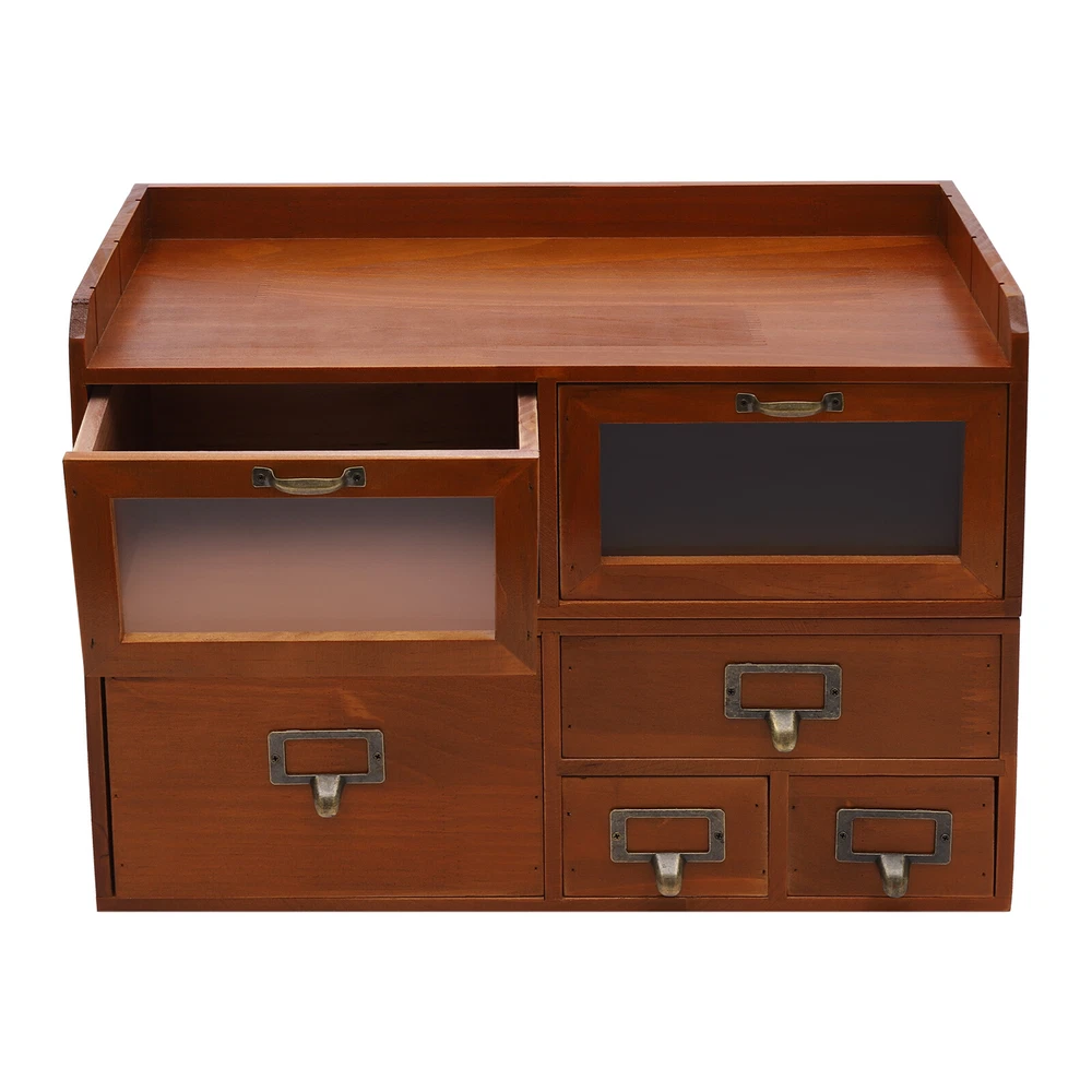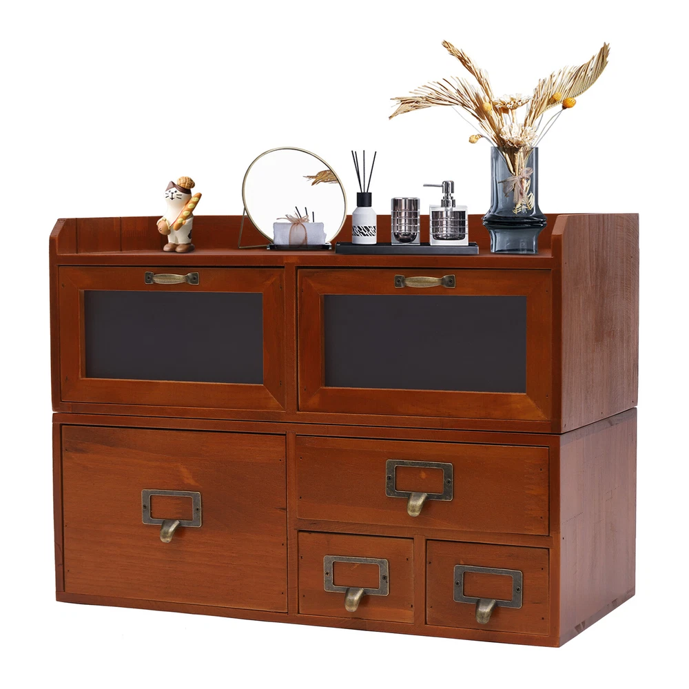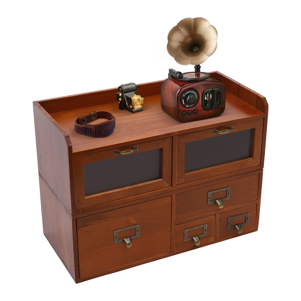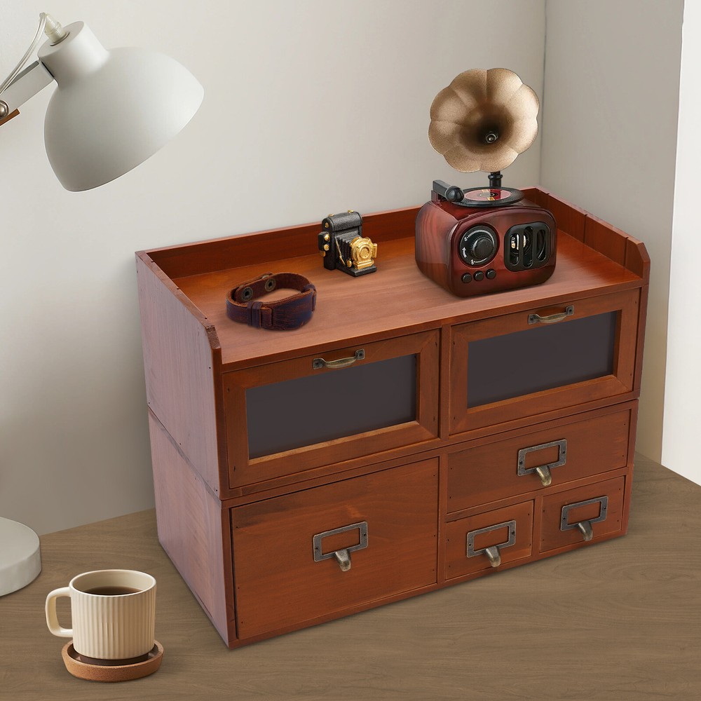 Description This desktop organizing cabinet is designed to make full use of space and achieves fine classification storage so that it will make your life and work more orderly. The retro style shows an antique charm, which can express a refined sense of fashion. It will become your ideal storage assistant. Key Features Long Service Life: Made of high-quality pine wood panels after spray painting and hand sanding, it is impact-resistant and not easily to damaged in the long run. Storage Assistant: The 6-drawer design and top-shelf allow you to easily sort and organize various small items such as stationery, cosmetics, jewelry, chargers, office supplies, kitchen utensils, or other tools to keep your desktop in order. Stable Construction: Thanks to its thickened material (8mm pine wood) a Desktop Organizing Cabinet, Supplies Organizer, Vintage Drawers for Desk Description This desktop organizing cabinet is designed to make full use of space and achieves fine classification storage so that it will make your life and work more orderly. The retro style shows an antique charm, which can express a refined sense of fashion. It will become your ideal storage assistant. Key Features Long Service Life: Made of high-quality pine wood panels after spray painting and hand sanding, it is impact-resistant and not easily to damaged in the long run. Storage Assistant: The 6-drawer design and top-shelf allow you to easily sort and organize various small items such as stationery, cosmetics, jewelry, chargers, office supplies, kitchen utensils, or other tools to keep your desktop in order. Stable Construction: Thanks to its thickened material (8mm pine wood) and rectangular structure, it can hold about 22.05 lbs of items, so you can use it with confidence. Space Saving: The compact structure (18.5*8.66*12.6in) is suitable for putting on a desk, office table, or dressing table. You can also use it stacked together to further save space while maximizing storage efficiency. User Friendly: The acrylic cabinet door allows you to see the contents of the box at a glance, making it easy to access quickly without rummaging. Easy to Clean: The smooth surface allows you to simply wipe with a damp cloth (not included) to remove stains and keep the organizer clean. Vintage Appearance: The brown color, vintage metal handle, rectangular structure, and smooth lines give it a retro style, adding beauty and vintage elements to your room. It plays a unique decorative role while using, bringing an old-world charm into your new-world home. Ready to Use: It does not need assembly, so you can directly use it after receiving and cleaning it, greatly saving time and effort. Customer Service: We aim to provide quality products and services. If you have any problems, please feel free to contact us. We will reply and solve the problem for you as soon as possible. Details Thoughtful Handles: They are made of zinc alloy, not easy to be damaged, and also provide a smoother way to open the drawer door, making it convenient for you to quickly access and organize. Raised Edges: They can effectively prevent the items placed on top from falling off. Smooth Edges: The smooth and burr-free edges not only increase the beauty of the product but also improve the safety of use. Application This product can be used in living rooms, bedrooms, study rooms, offices, dormitories, kitchens, schools, coffee and tea bars, and other places. It can be used to store cosmetics, jewelry, tea bags, sugar packets, necklaces, earrings, bracelets, rings, perfumes, lipsticks, household medications, herbs, nutrition-related capsules, and other items. Specification Mount Type: Free Standing, Tabletop Assembly Required: No Material: Pine Wood, Acrylic, Zinc Alloy Process: Spray Painting, Hand Sanding Color: Brown, Clear Style: Retro Shape: Rectangular Number of Drawers: 6 Maximum Overall Load-bearing Capacity: 10kg/22.05lbs Raised Edge Height: 3cm/1.18in Board Thickness: 8mm/0.31in Drawer Size: 22*11.5cm/8.66*4.53in, 22*14cm/8.66*5.51in, 22*7cm/8.66*2.76in, 10.5*7cm/4.13*2.76in Overall Product Size: 47*22*32cm/18.5*8.66*12.6in Package Size: 52*40*26cm/20.47*15.75*10.24in Gross Weight: 6.5kg/14.33lbs Net Weight: 6kg/13.23lbs Package Included 1* Desktop Organizing Cabinet Notes Please check the style and size before purchasing. Please note that this product does not include other items shown in the picture. Please do not place items that exceed its load-bearing capacity. Please do not place it in a damp place or near an ignition source. Please allow the slight color difference caused by the shooting light and 1-3cm error due to manual measurement and make sure you do not mind before ordering. https://image.pushauction.com/0/0/548d9de0-d28e-4a5a-9f1b-de1fd6e274a4/dfe4bf42-f598-4c65-b86e-6b20ea8cd11c.JPG Payment Delivery details Terms of sales About us Contact us Payment We accept ebay payment 。 Fees such as import duties, taxes are not included in the item price or shipping costs. These charges are the buyer's responsibility. Delivery details Shipping: 2-9 working days to: USA Terms of sales We maintain high standards of excellence and strive for hundred percent customer satisfaction. Feedback is very important to us. We hope that you contact us immediately before you give neutral or negative feedback, so that we can address your concerns. It is impossible to address issues if we do not know about them! About us Your satis faction is our ultimate goal. We work hard to earn your trust and future business. Our certified technicians have tested each item before shipping. The unit comes with 1 year limited warranty on all manufacturing defects. a) If you receive a defective item, you may return it or ask for a discount. Please contact us within 14 days after you receive the package. b) What you returned must be intact and in its original packaging as re? u. Customer is responsible for shipping costs of the returned item. c) We will cover the cost of shipping back t with the s