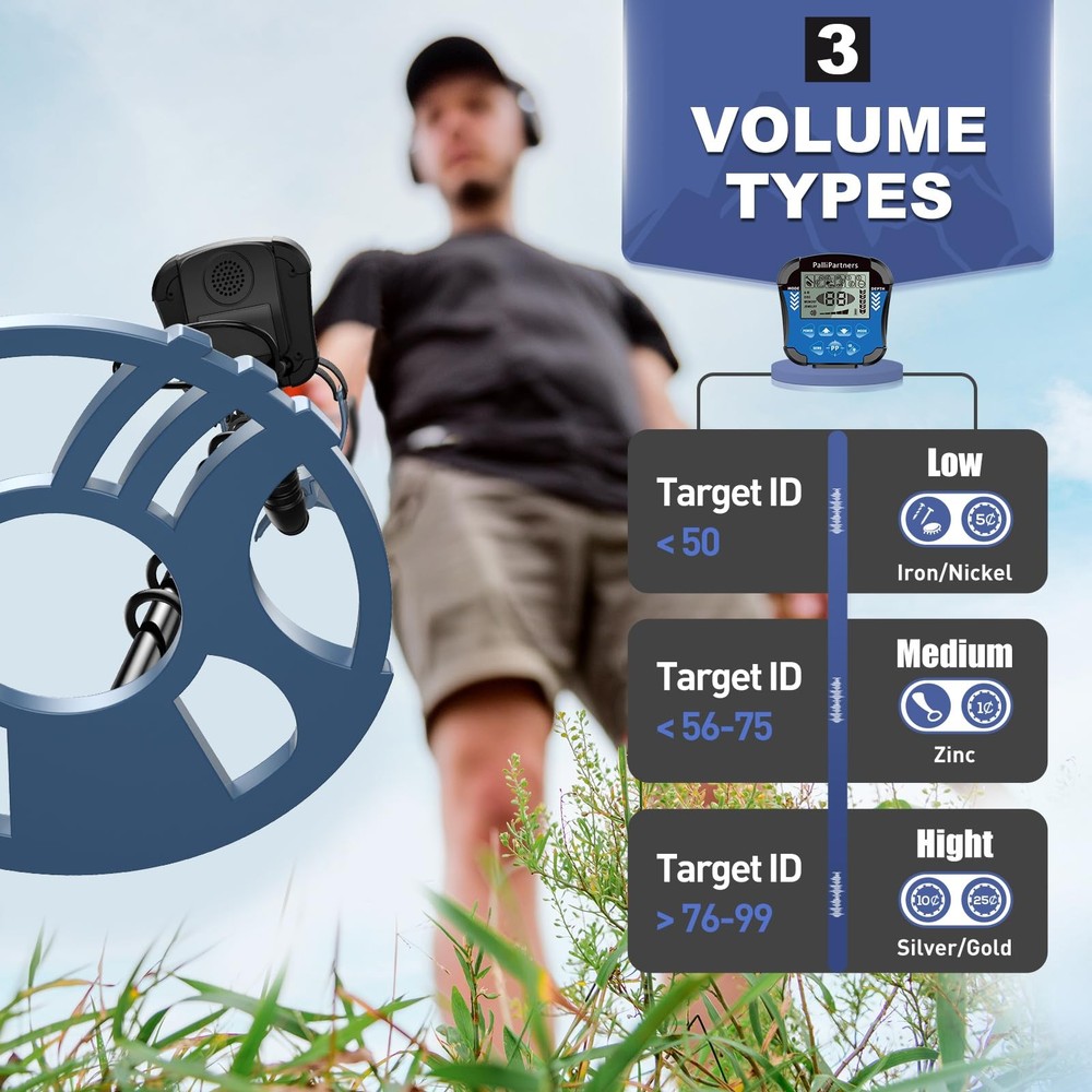 Detector De Metales Oro Y Plata Display Deep Ground Gold Finder Waterproof NUEVO Description: HIGH ACCURACY & WATERPROOF SEARCH COIL: The diameter of this metal detector’s search coil is 10 inches. As you know, the bigger the search coil is, the higher the sensitivity, let you detecting more efficient and time-saving. Waterproof search coil enables you to use detecting to underwater, perfect for outdoor, like beach, stream, backyard. (Note: the control box is not waterproof) THREE STRONG MODES & TRUE DISCRIMINATION MODE - metal detector has three operation models: ① All Metal Mode - the metal detector notifies you whenever it sees any metal. ② Disc Mode - you can utilize this metal detector to discriminate against other types of metal for a specific one. ③ Notch mode –press “NOTCH”, then press “+”or ”-” button to select the target to be notched(eliminated). And you can simply eliminate the metal you don’t want through Discrimination Mode & Notch mode. FULL ACCESSORIES & YOU WORTH TO OWN IT: not only you can get 1×Metal Detector but also have 1×Carrying Bag, 1× Shovel(more durable & strong than other shovels), it has a headset jack that can be used with conventional headsets, two batteries are included. Whatever you're a beginner or advanced metal detectorist, PalliPartners metal detector is always suitable for you. If you have any questions about metal detector or metal detecting technicality, please feel free to contact us. ADJUSTABLE & HUMANITY DESIGN – metal detector from 41.3 inch to 47.6 inch adjustable stem, suitable for both adults and kids. Save more effort with arm rest design, makes you more comfortable and less stressful. Let's start your treasure hunting with this lovely PalliPartners metal detector. INTUITIVE LCD DISPLAY & DEEPER DETECTION - it is obviously more accurate and convenient that you can see the detection mode, sensitivity level, battery condition, and volume level. Even in the night time or dark light area. You can get information intuitively from the LCD screen and it can detect metals up to 8.7 inch depth.