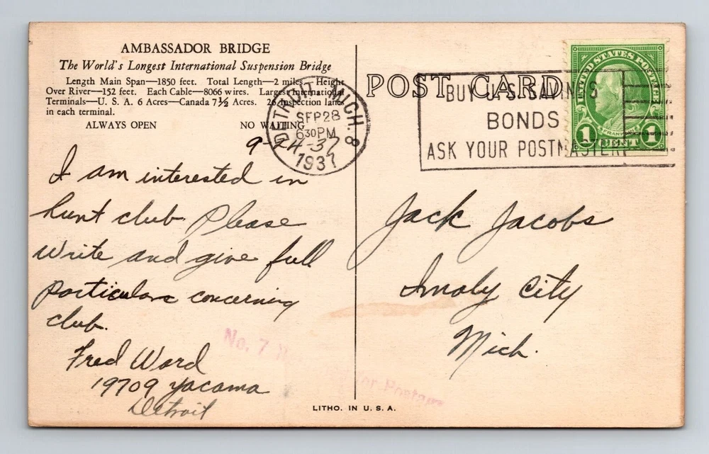 Country: USA Region: Michigan Theme: Cities & Towns Unit of Sale: Single Unit Country/Region of Manufacture: Unknown Era: Vintage Subject: Cities & Towns Type: Printed (Lithograph) Postage Condition: See Image Original/Licensed Reprint: Original City: Detroit