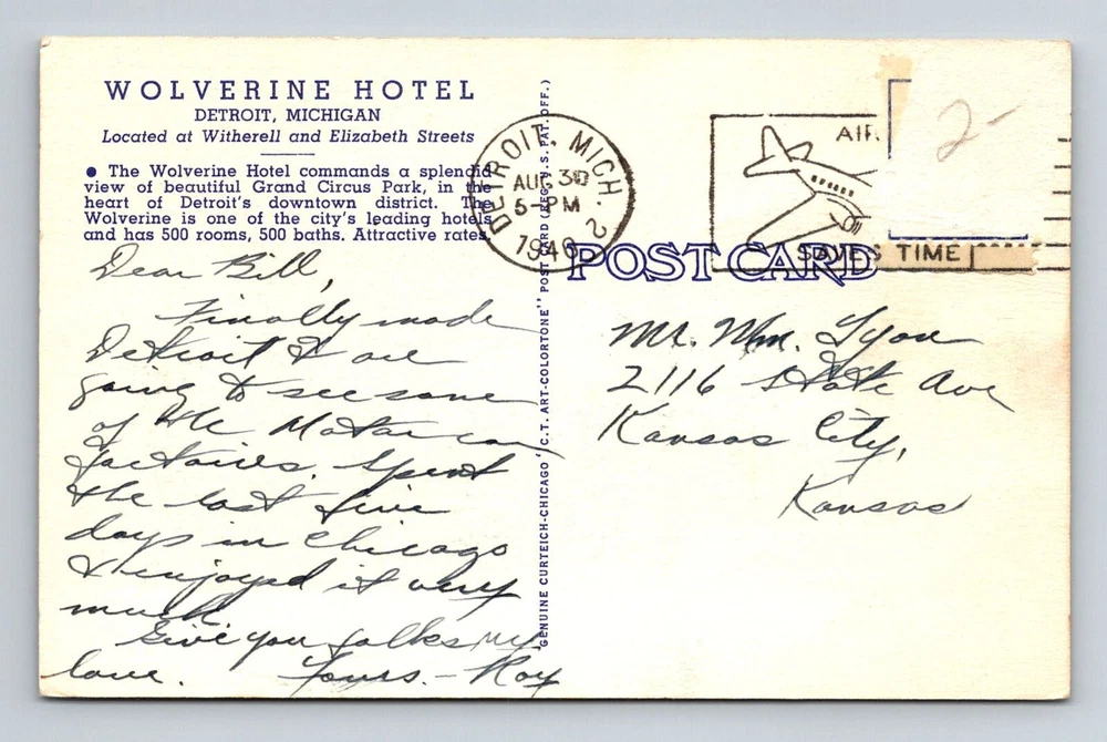 Detroit MI-Michigan, Wolverine Hotel, Antique, c1940 Vintage Souvenir Postcard