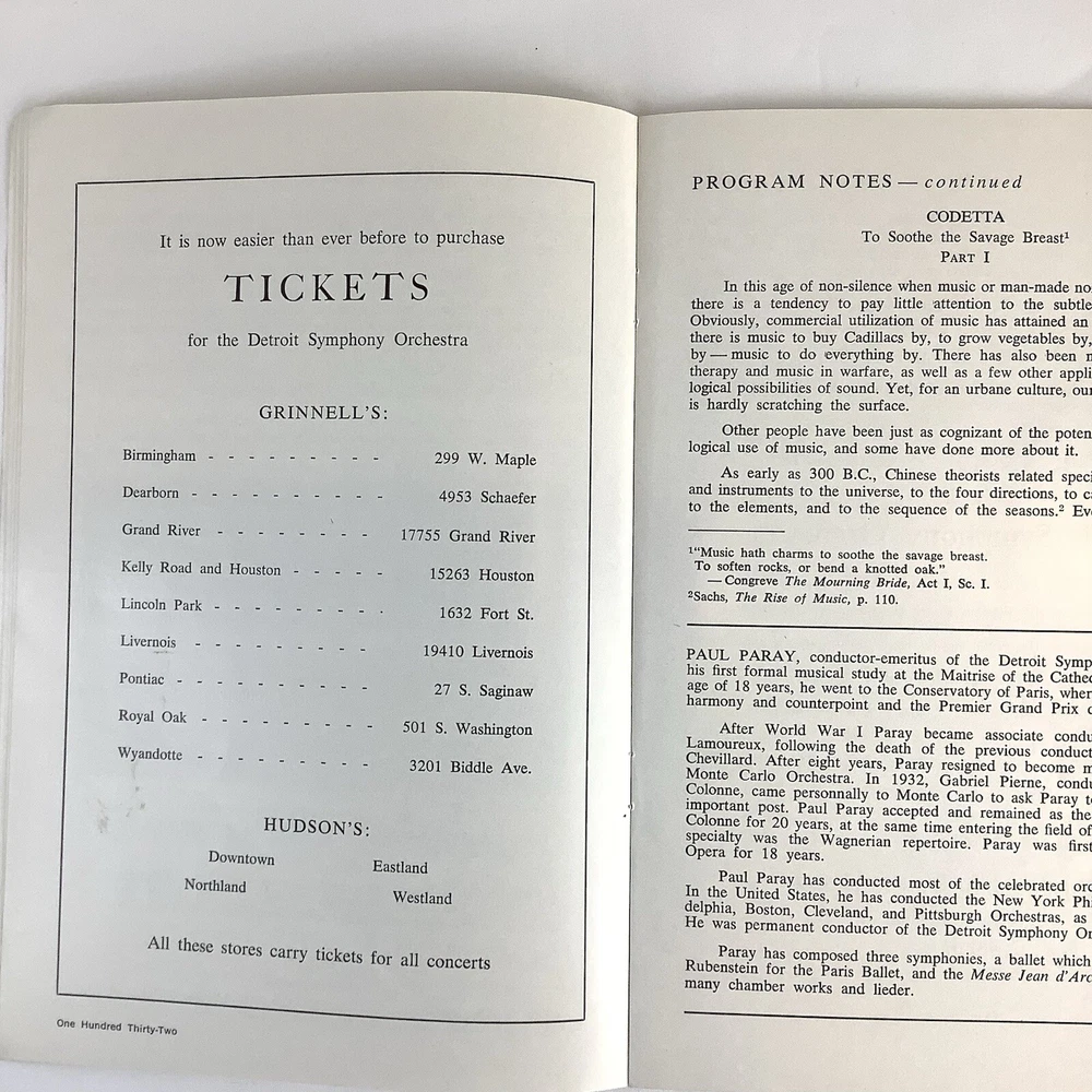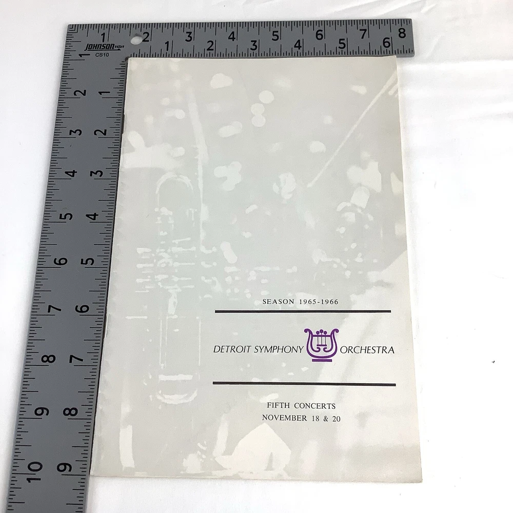 Detroit Symphony Orchestra Season Program 1965-1966 Sixten Ehrling, Paul Paray. In good condition. The back cover and about half the pages have that wavy look paper has when it's been damp (see the last two pictures). The tip of the top right cover and most of the pages have a bit of a curl. Very light wear along the spine. No one signs of wear or aging. Thanks for looking at my item, and we hope you come back to Dry Creek often. We ask for two business days to get an item shipped, and will accept returns for thirty days after purchase. We happily bundle and offer a discount for multiple purchases. We like all our items, but we're not in love with any of them- we've got them here to sell. Make an offer, and we'll work something out. I'd love to hear from you if you have questions or comments- message me, and I'll usually respond in just a few moments.