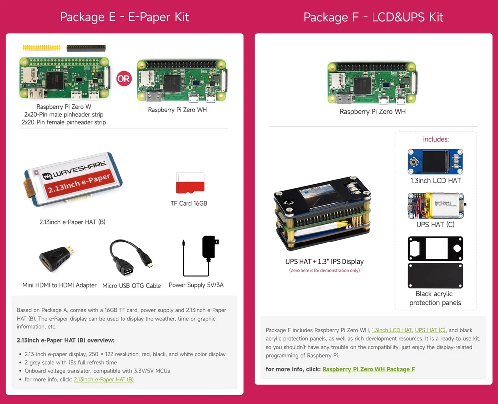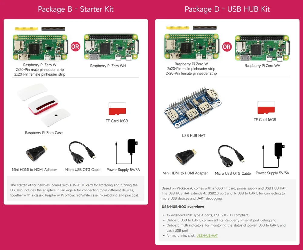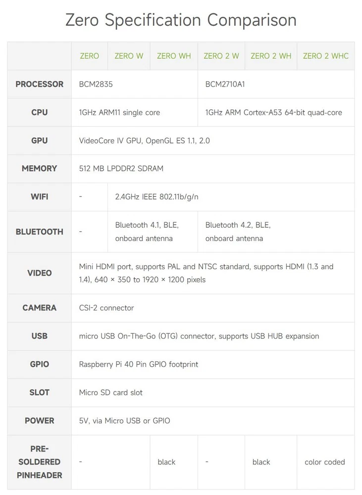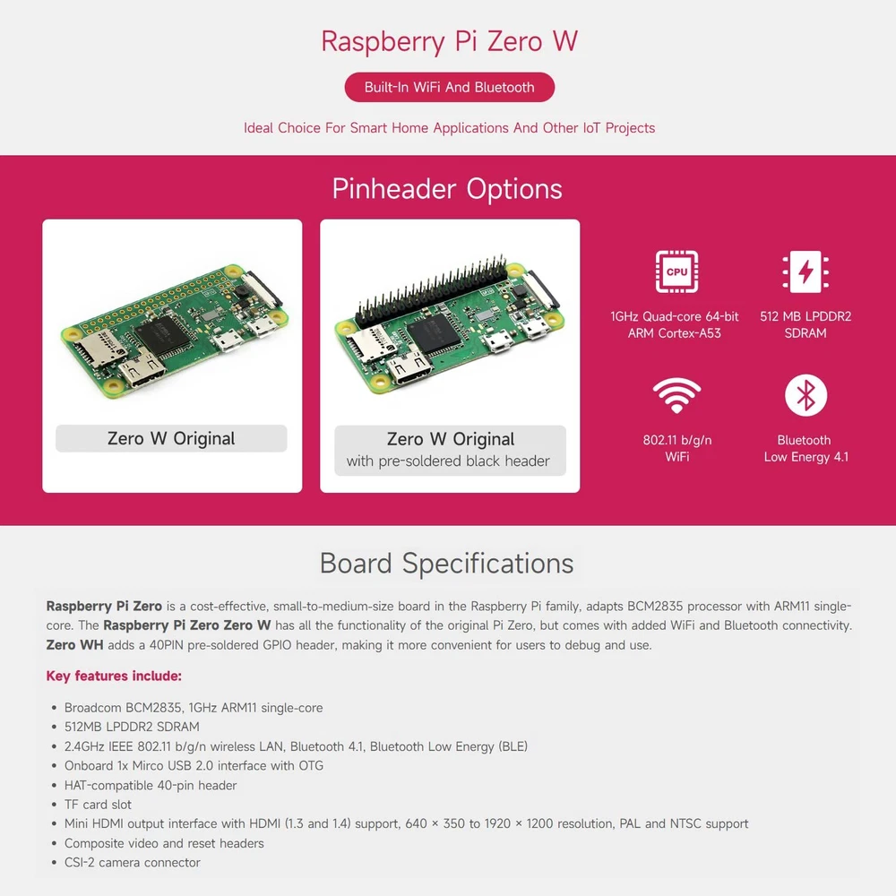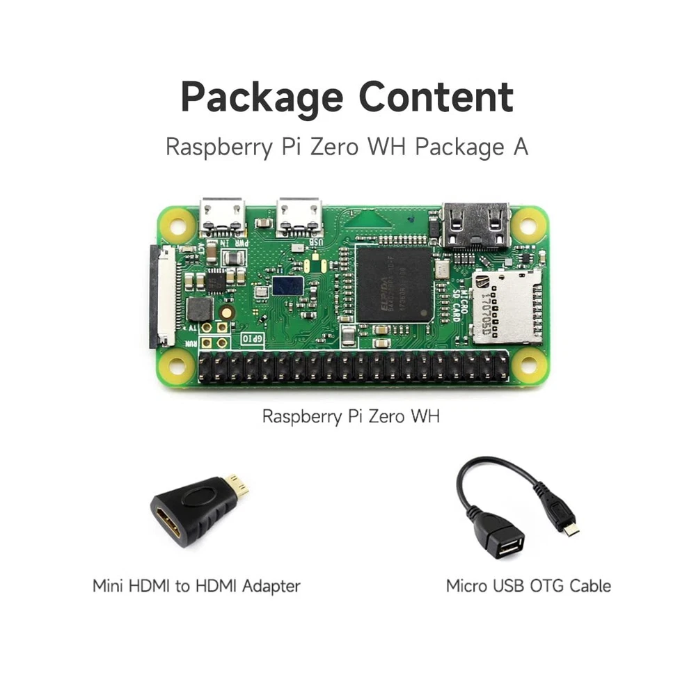 Overview This development kit includes: the Raspberry Pi Zero WH (built-in WiFi, pre-soldered headers), and some most basic components you may need to get going with your Pi Zero: Mini HDMI to HDMI Adapter, Micro USB OTG Cable. Raspberry Pi Zero WH Features Broadcom BCM2835 1GHz ARM11 single-core processor 512MB RAM Added wireless connectivity 802.11 b/g/n wireless LAN Bluetooth 4.1 Bluetooth Low Energy (BLE) 40PIN pre-soldered GPIO headers Micro SD card slot Mini-HDMI port (1080p60 video output) Micro-USB power Micro-USB OTG port CSI connector Composite video header Composite reset header Dimension: 65mm x 30mm x 11.6mm PACKAGE CONTENT Raspberry Pi Zero WH x1 Mini HDMI to HDMI Adapter x1 Micro USB OTG Cable x1 This development kit includes: the Raspberry Pi Zero WH (built-in WiFi, pre-soldered headers), and some most basic components you may need to get going with your Pi Zero: Mini HDMI to HDMI Adapter, Micro USB OTG Cable. Broadcom BCM2835 : 1GHz ARM11 single-core processor Added wireless connectivity : 802.11 b/g/n wireless LAN;Bluetooth 4.1;Bluetooth Low Energy (BLE) Mini-HDMI port (1080p60 video output) 40PIN pre-soldered GPIO headers