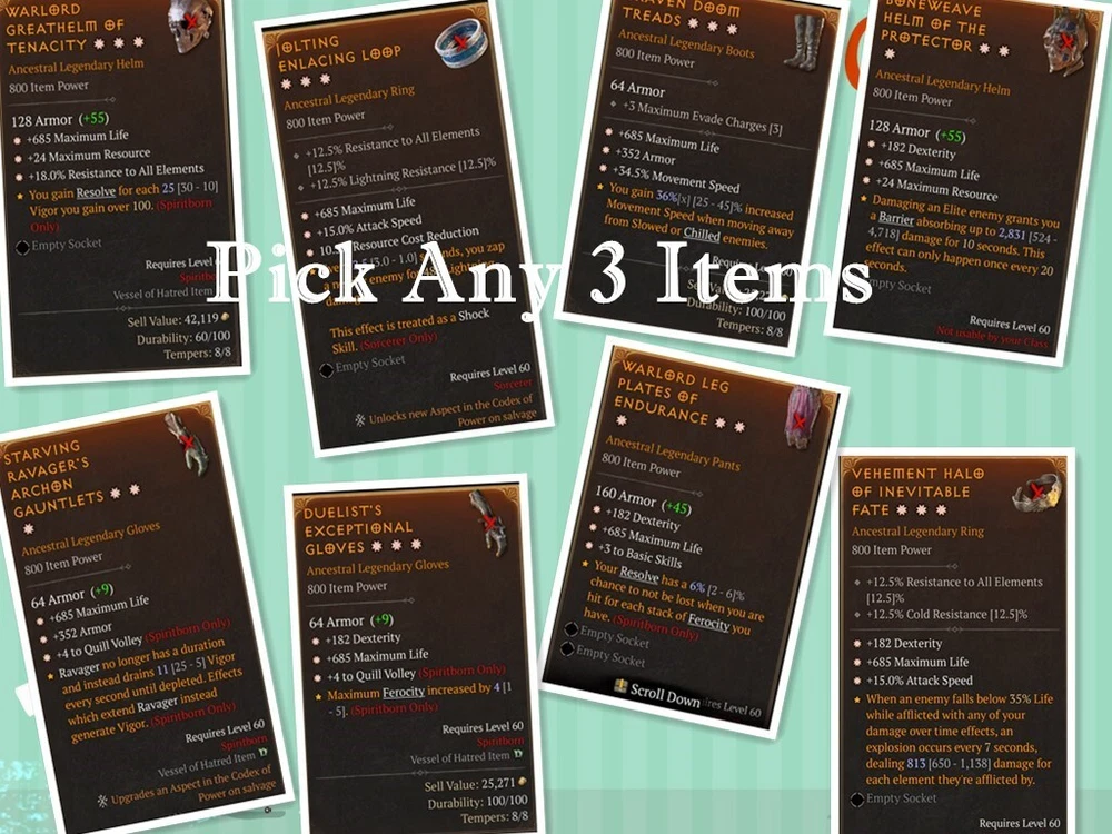 All gears listed are 800Item Power 3GA Ancestral Legendary. There are other 3GA perfect gears not listed, please msg. Please send me your battle tag after placing the order. I will friend you and deliver in 24 hours.