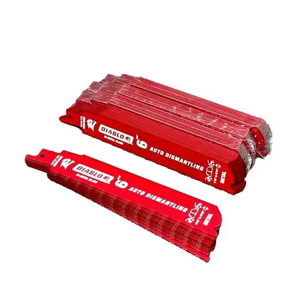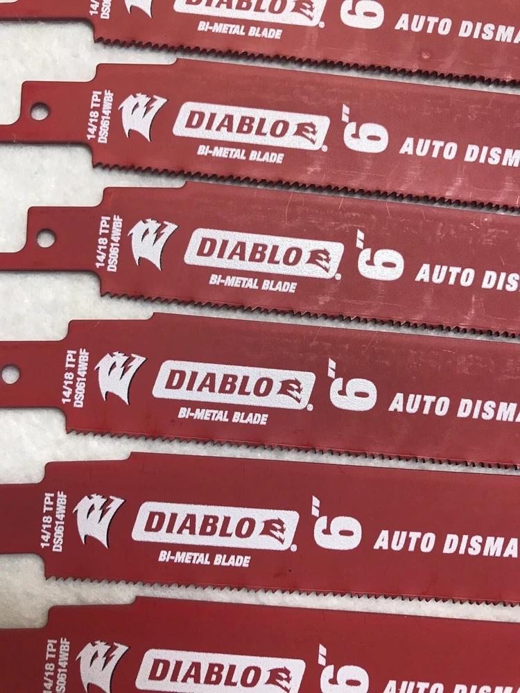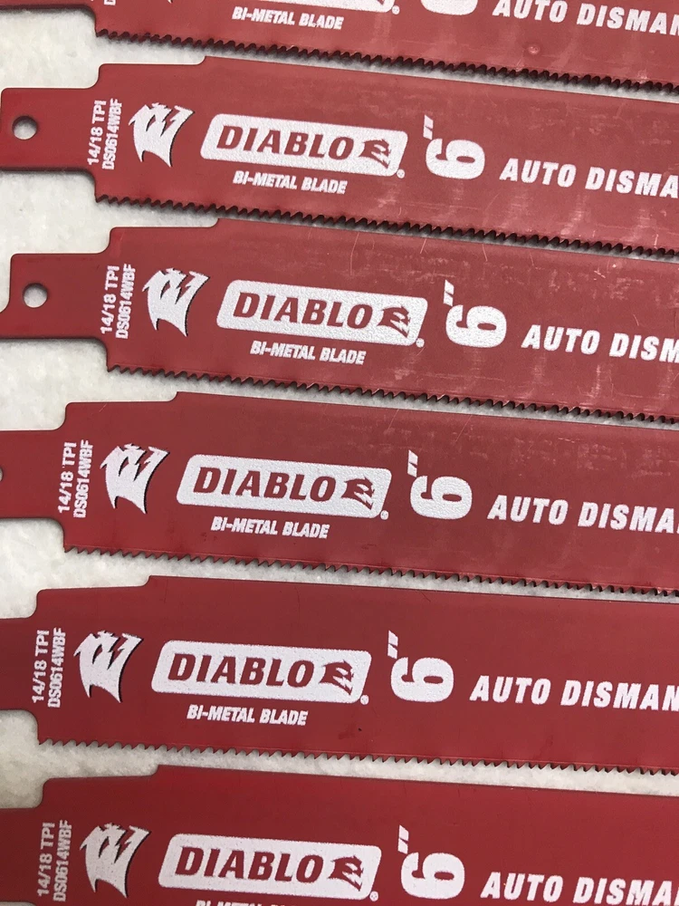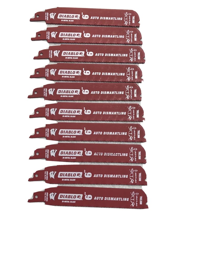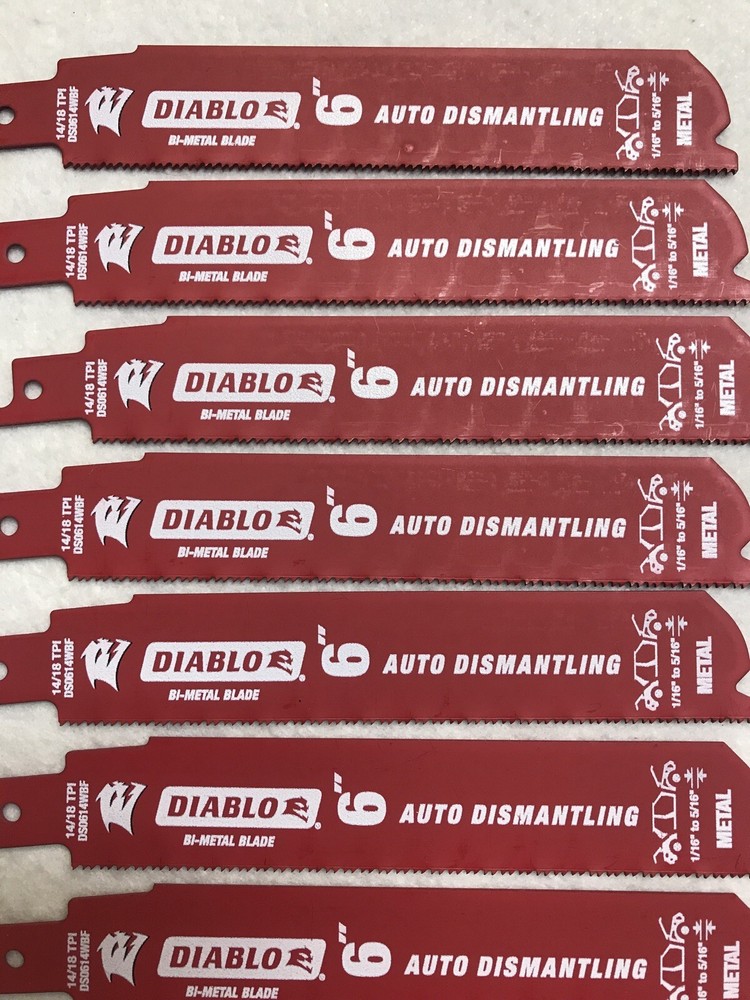 50 Pack Diablo 6” Reciprocating Sawzall Saw Blades 14/18 TPI Auto Dismantling Diablo next generation Steel Demon reciprocating saw blades are specifically designed for maximum performance in metal cutting applications. • Dual Tooth design features a double tooth configuration with small gullets for faster material removal and extra durability. • Perma-shield coating protects the blade from heat, gumming and corrosion • 1 in. Demolition body for straighter cuts with less vibration. Features: • Diablo Steel Demon • Bi-Metal Cobalt • 6-inch • 14/18 Teeth per Inch • 3/32-inch to 5/16-inch • Fire and Rescue Auto-Dismantling • Swiss Made