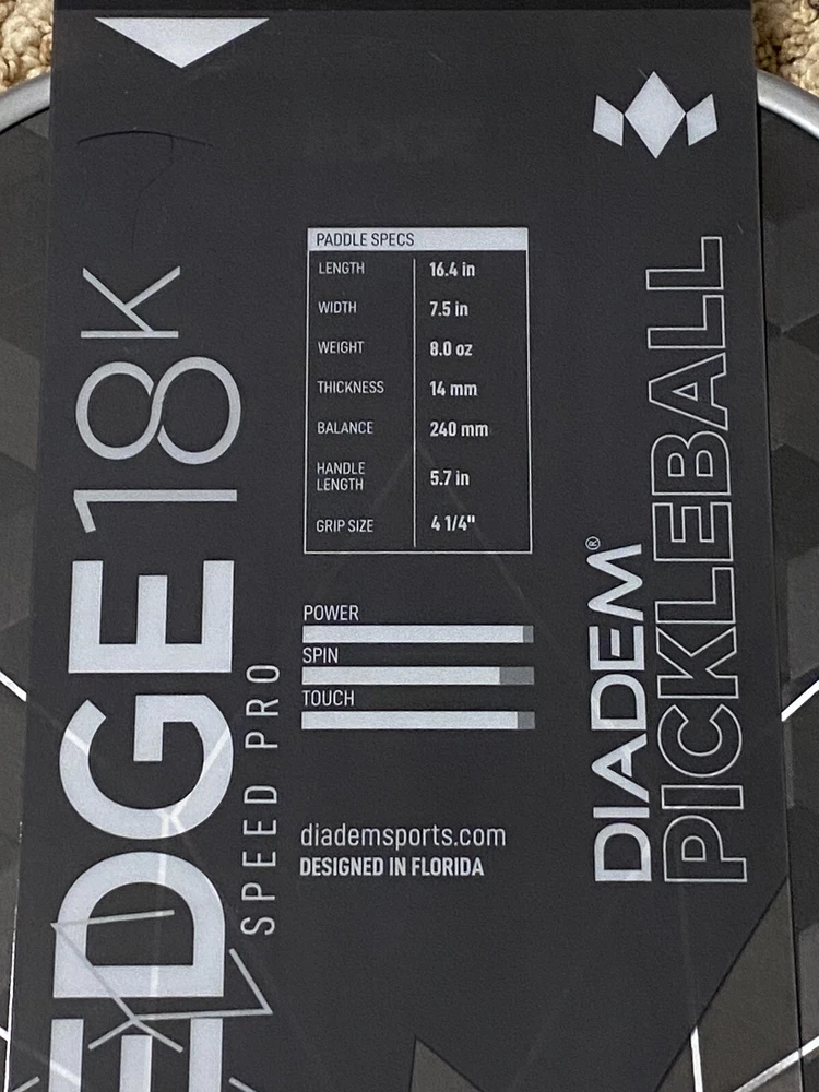 Diadem Edge 18K speed Pro model pickleball paddle - as shown in picture - New in original package. 14mm This paddle is fu****g fast! Crafted with precision and engineered for speed, this paddle combines cutting-edge technology with meticulous construction to deliver speed and pop to your game. At the heart of the Edge 18k Speed Pro lies its revolutionary and unique design, featuring a 14mm thickness and a 10mm cell core. Combining that with our only paddle with a molded handle, this unique configuration maximizes power and responsiveness, allowing players to unleash their full potential with every shot. Built for the high level players, the Edge 18k Speed Pro also utilizes thermoformed construction ensuring durability and stability along with power and pop, making it the ideal choice for competitive play.