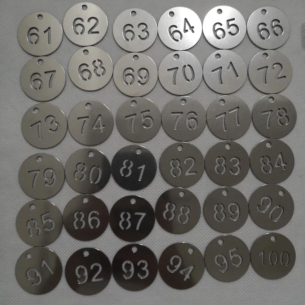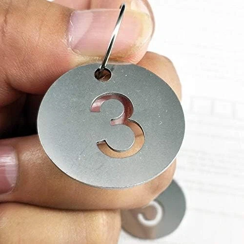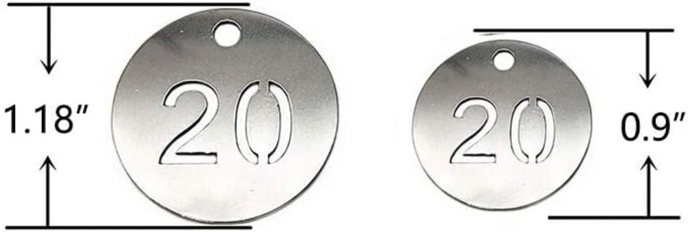 Diameter Inches Bigger Hollowed Stainless Steel Number Tags Key Tags with Rings 1-100 Material: 304 Stainless Steel Tag Size: " DIA . It's a bigger and heavier edition compared to size ". These tags can withstand corrosion, general handling, extreme can even be burnt in fire and boiled in water. The number will never fade because it's hollowed. Idea for gyms、sauna rooms 、 hotels、schools、office and etc.. Notice: Tags and key rings are not assembled. Need to be assembled yourself.