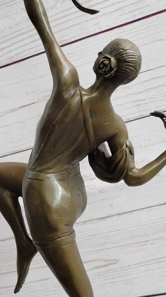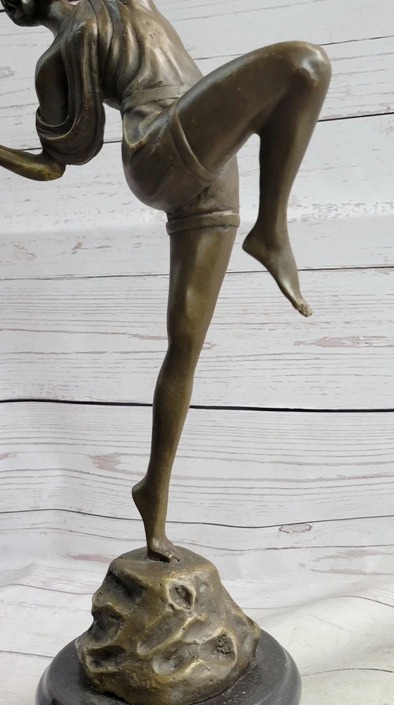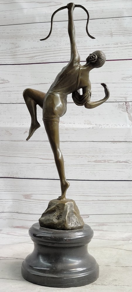 Condition : This sculpture is in perfect condition Bronze Dimensions with Marble Base: Height 17.5" X Width 7" Marble Dimensions: Diameter 5.5" Height without base:14" Weight:9 LBS Inventory:93YRD12434139 Dive into the rich artistic portrayal of the Greek goddess Diana with this intricately detailed sculpture by American artisan Fisher. Diana, a prominent figure in Roman mythology, embodies the spirit of the hunt, symbolizing a profound connection to the wilderness, wildlife, and the lunar sphere. Initially revered as the goddess of hunting, Diana was often accompanied by her youthful and graceful attendants, who joined her in the pursuit of prey. Over time, the Romans equated Diana with the Greek goddess Artemis, expanding her divine attributes to include those of a Moon goddess, complementing the domain of Luna. Honored in ancient Roman religion and revered in contemporary Religio Romana Neopaganism and Stregheria, Diana's influence remains significant, with dedicated shrines in Capua and Aricia, near Rome, serving as testaments to her enduring legacy. Regarded as the twin sister of the god Apollo, Diana is the daughter of Jupiter and Latona, exemplifying a formidable and respected deity within the Roman pantheon. Crafted with meticulous attention to detail, this stunning sculpture captures the essence of the legendary Diana, bringing to life the goddess's strength and grace. With a keen focus on artistic precision, the sculpture embodies the spirit of the hunt, showcasing Diana's connection to the untamed wilderness and her role as the protector of the woodlands. The intricate craftsmanship of the piece reflects the timeless allure and significance of Diana in Roman mythology, depicting her surrounded by the captivating energy of the hunt and the profound reverence for the natural world. As a powerful representation of divine femininity, Diana's portrayal in this sculpture is a testament to her enduring influence and cultural significance throughout history. Elevate your appreciation for classical mythology with this exquisite sculpture, a homage to the revered Greek goddess Diana. Crafted with the utmost dedication to artistic detail by American artisan Fisher, this masterpiece captures the essence of Diana's multifaceted persona, embodying her role as the goddess of the hunt, the protector of wildlife, and the revered lunar figure. The sculpture's intricate design and lifelike representation convey Diana's prowess and elegance, highlighting her influence over the natural world and her significance within ancient Roman mythology. With every meticulously sculpted detail, the sculpture pays homage to Diana's enduring legacy and her lasting impact on the realms of nature and the divine. Artemis Diana the Huntress Archer w/ Bow Bronze Sculpture Statue Figure YRD-1243nbsp; Video will open in a new window Using the eBay App? Paste link into a browser window: [isdntekvideo]