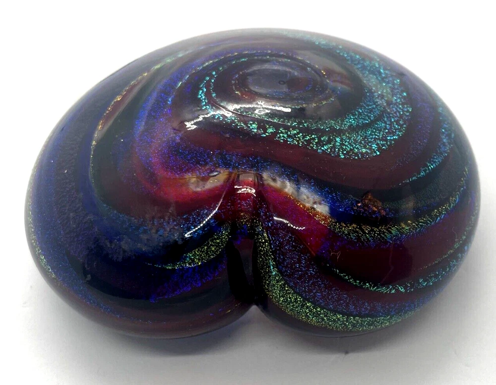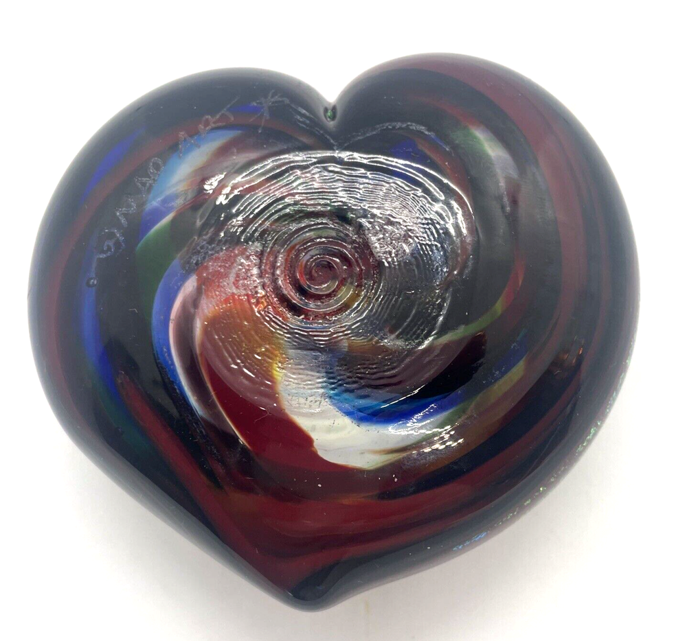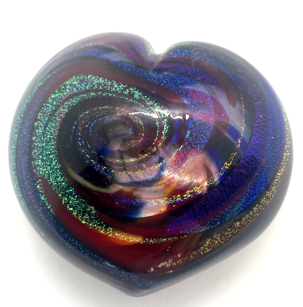 Mad Art Studios Dichroic Swirl Art Glass Heart Paperweight Signed This heart paperweight is in excellent pre owned condition. There are no chips or cracks. It measures 3.5" x 3.25" Please note the photos for detail.