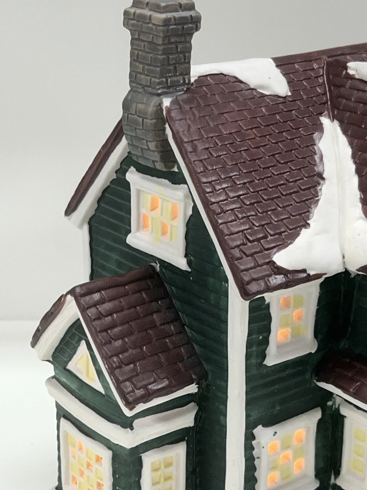This Dickens Collectables Victorian Series 266-6220 Lighted House is a charming addition to any Christmas Village display. The porcelain house features a whimsical Victorian home with multicolor paint finish. The lighted house is suitable for any room and is perfect for creating a festive and seasonal atmosphere. The house measures 8 inches in length, 7-1/2 inches in height, and 5 inches in width, making it a medium-sized piece. The house was manufactured in 1994 and is in mint condition, both the house and the box. This collectibles item is a great gift for adults who love Dickens, Christmas, and seasonal villages. Absolutely incredible pristine condition. Includes all original packaging including cord & light .