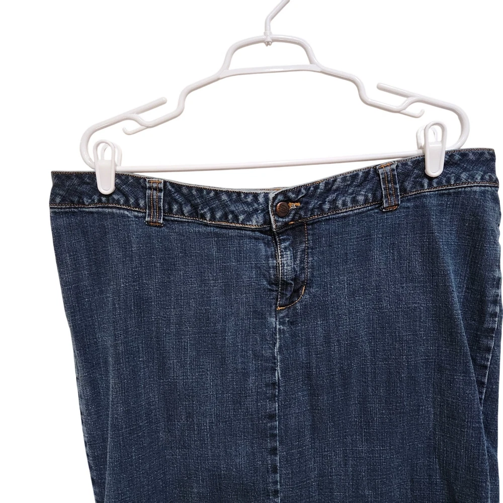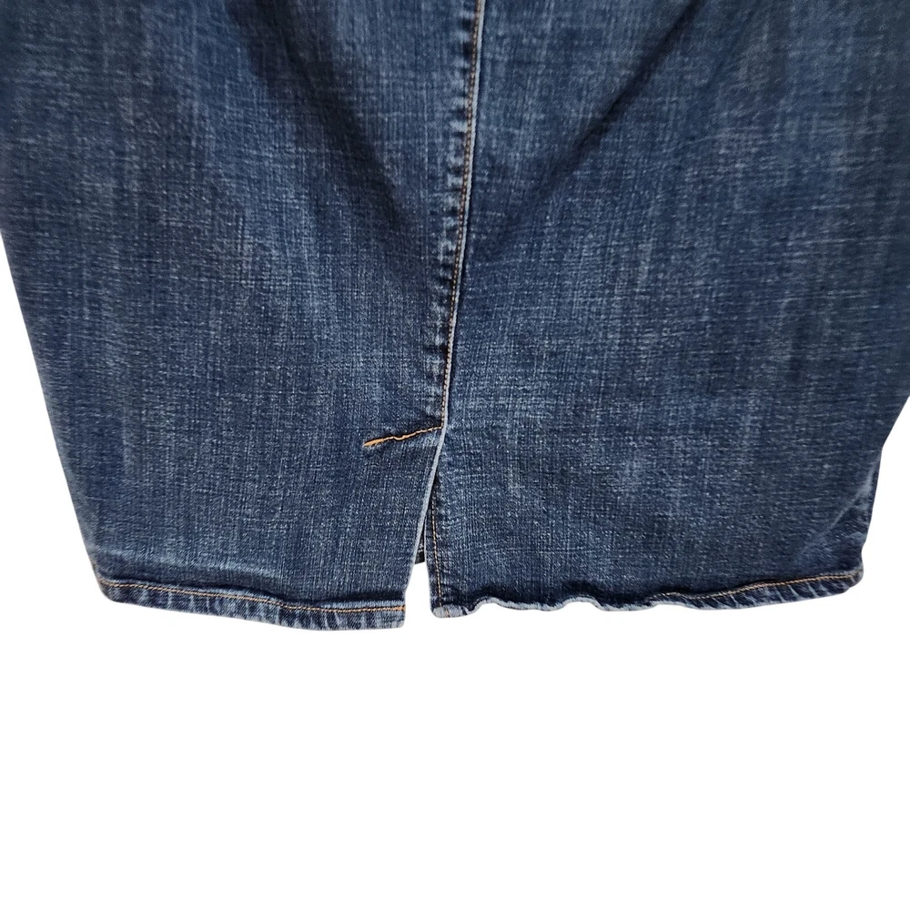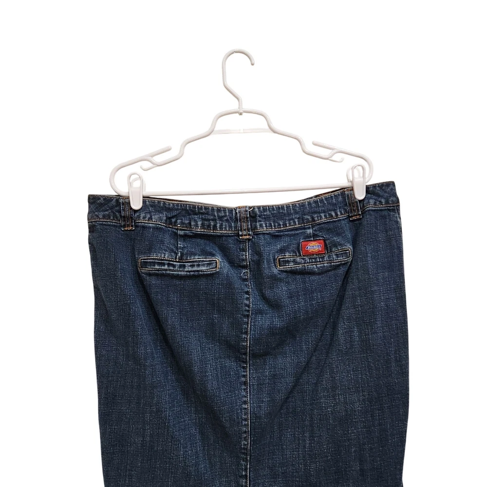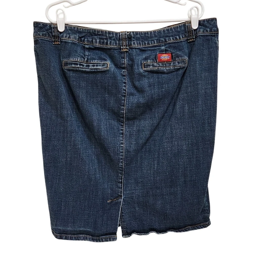 Dickies Vintage Y2K Logo Pencil Denim Skirt Mid Rise Dark Wash Blue Plus Size 18 Good pre-owned condition. Measurements: Waist: 19.5'' Length: 25'' Features: Belt loops Zipper fly with button closure Straight, pencil cut Above knee length Dark wash denim Slit on the back Stretch denim fabric 97% Cotton, 3% Spandex corpcore office siren layering work wear semi formal work attire modest y2k large logo branded acubi streetwear skater late 90's early 00's
