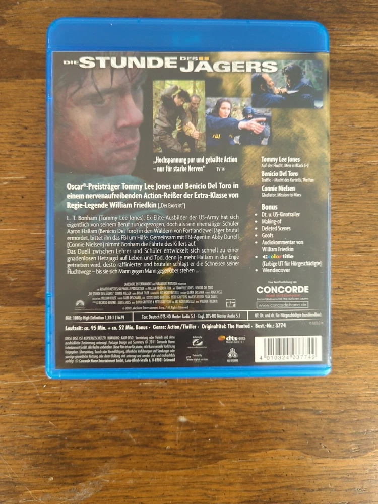 Experience an intense action-thriller with the Blu-ray edition of "Die Stunde des Jägers". This movie is a must-have for fans of Jenna and William's direction, featuring German subtitles and FSK 18 rating. The Region B, A, and C compatible format guarantees compatibility across different locations, enabling you to enjoy the movie anywhere in the world. The disc is in excellent working condition, ensuring optimal playability. This Blu-ray version of "Die Stunde des Jägers" is a valuable addition to any movie collection. Get your hands on this movie and enjoy the thrilling story of a hunter hunted by the very prey he used to chase.