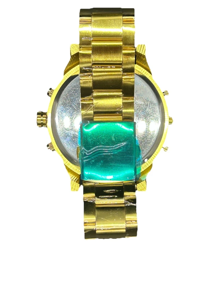 This Diesel Mr. Daddy 2.0 Chronograph wristwatch is a perfect addition to your collection. With a striking gold dial and bracelet, this watch exudes luxury and elegance. The round watch face features stick indexes and a date and day indicator, making it both practical and stylish. Crafted with high-quality stainless steel, this watch is water-resistant and has a quartz movement powered by battery. The case has a gloss finish and measures 57mm in size with a 14mm thickness. The bracelet is also made of stainless steel and has a width of 28mm. This watch is suitable for adult men and is perfect for a variety of occasions, including casual, classic, luxury, dress/formal, and sports.