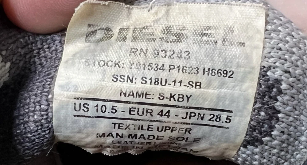 Handmade: No Shoe Width: Standard Features: Comfort Outsole Material: Rubber Customized: No Product Line: Diesel S-KBY Shoes Shoe Shaft Style: Low Top Season: All Season Upper Material: Textile Pattern: Camouflage Closure: Lace Up UPC: Does not apply US Shoe Size: 10.5 Department: Men Occasion: Activewear, Casual Country/Region of Manufacture: Vietnam Brand: Diesel Vintage: No Style Code: S-KBY Type: Athletic Model: Diesel S-KBY Style: Sneaker EU Shoe Size: 44 gtin13: Does not apply Performance/Activity: Gym & Training, Running & Jogging, Walking Signed: No Color: Multicolor Theme: Sports