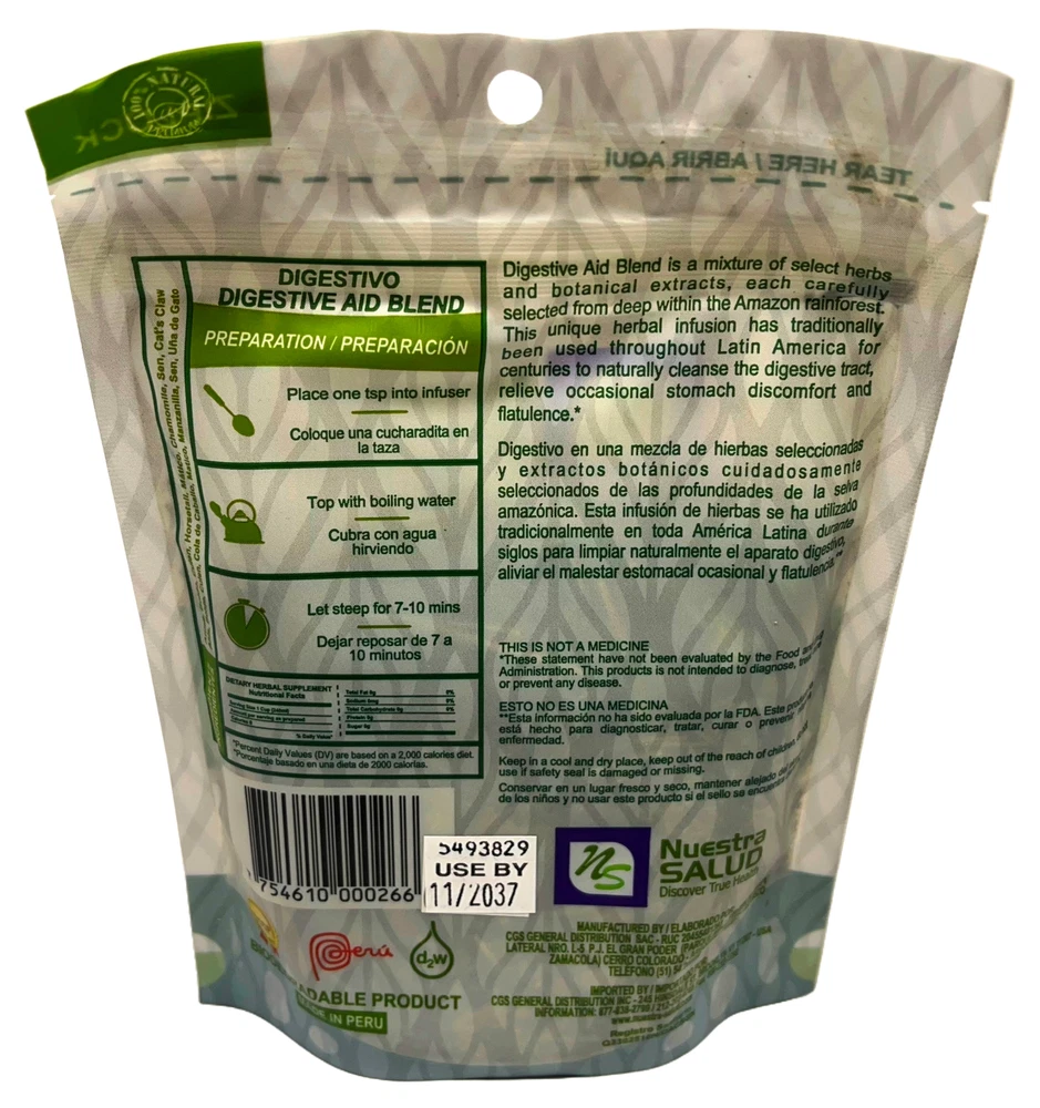 Digestive Tea Blend Digestivo Te Herbal Infusion Tea (30g) Introducing Digestive Herbal Tea From Peru, also known as Digestivo, a harmonious blend of Barberry, Anise, Boldo, Horse tail, Culen, Dandelion, and Paico, expertly crafted to support your digestive health. This tea offers a delightful combination of flavors and natural benefits, making it a perfect choice for soothing your stomach and promoting overall well-being. 1. **Soothes Digestive Discomfort**: Barberry and Boldo are known for their calming properties, helping to ease stomach discomfort and promote healthy digestion. 2. **Supports Digestive Function**: Anise and Dandelion aid in digestion by stimulating the digestive system and promoting the production of digestive enzymes. 3. **Detoxifies the Body**: Culen and Paico are natural detoxifiers, helping to rid the body of toxins and promote a healthy internal environment. 4. **Promotes Gut Health**: Horse tail is rich in silica, which supports gut health and may help reduce inflammation in the digestive tract. Brew a cup of Digestive Herbal Tea From Peru after meals or whenever you need a soothing moment. Experience the natural goodness of these herbs and support your digestive health the way nature intended. Digestivo – Digestive Aid blend Agracejo – Barberry ( Berberis vulgaris) Anis – Anise ( Pimpinella anisum ) Boldo – ( Peumus boldus ) Cola de Caballo – Andean Horsetail ( Equisetum bogotense) Culen ( Otholobium pubescens ) Diente de Leon – Dandelion ( Taraxacum officinale ) Paico ( Chenopodium ambroidoides) Superior Blends There’s an art to collecting and drying herbs; a technique passed down through Peruvian culture for centuries. We lean on this ancient knowledge to keep the potency of the herbs we collect at its peak. Our herbs are picked and packaged in their whole and unfiltered form to deliver the transformative nutrients just as Mother Nature intended: pure and simple. Next Level Freshness Taste the enchanting character of the Peruvian coast, angelic Andes, and majestic jungle. Our Peruvian herbal teas are diligently packed in zip-lock bags to tightly seal in the freshness and deliver enticing flavor with every sip. Whether you’re starting your day, re-charging your afternoon, or relaxing away in the evening, freshness will always be part of the equation. Discover the Variety Taste the enchanting character of the Peruvian coast, angelic Andes, and majestic jungle. Our Peruvian herbal teas are diligently packed in zip-lock bags to tightly seal in the freshness and deliver enticing flavor with every sip. Whether you’re starting your day, re-charging your afternoon, or relaxing away in the evening, freshness will always be part of the equation.