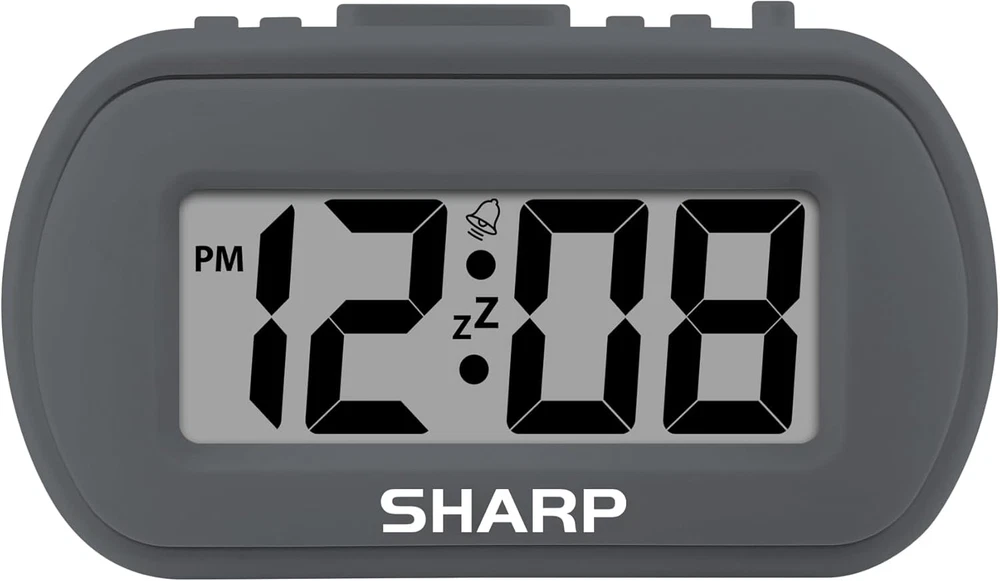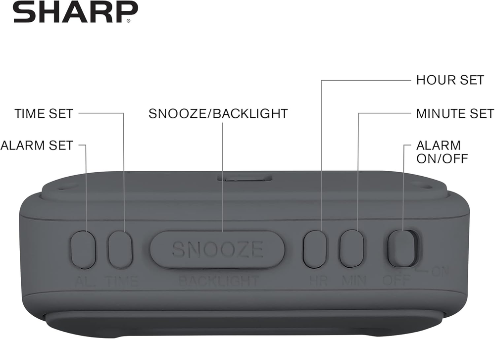 The Sharp (SPC483CAMZ) has a tactile rubberized charcoal black finish case with a unique feel and Easy-to-Use Top Button Controls for easy operation and setting of the clock. Features a large 1” LCD Display, making it easy to see across the room. The clock is battery operated, so you can take it anywhere! On Demand Blue Backlight - The clock features a built-in blue backlight to illuminate the screen when snooze/light button is pressed. You can easily illuminate the display with its blue backlight by pressing the snooze button. The display will light up for 5 seconds and turn off to extend your battery life. This alarm clock has an ascending alarm. Before the alarm stops itself, top mounted snooze button can be pressed for 5 extra minutes of sleep time. The Sharp (SPC483) digital alarm clock measures 4” (L) * 1.7” (W) * 2.3” (H) inches, small and light. It is an easy cordless battery operated alarm clock, powered by 2 - AAA batteries (not included), features an easy to read clear display, easy for kids, teens to use, basic bedroom bedside table desk gift alarm clock. Easy to Use Anywhere you Need a Clock – Easy set top button controls for simple operation. Battery operated (no cords) allows it to be used anywhere you need a clock! Product Description This compact SHARP alarm clock is ideal for saving space on your nightstand. The ascending alarm never startles you like traditional alarm clocks. It offers you a gentler wakeup experience. The alarm clock has a soft rubber finish making it difficult to knock over and just fun to touch! The button controls are easily accessible from the top of the alarm clock. You can easily illuminate the display with its blue backlight by pressing the snooze button. The display will light up for 5 seconds and turn off to extend your battery life. The SHARP (SPC483CAMZ) has a tactile rubberized charcoal black finish case with a unique feel and Easy-to-Use Top Button Controls for easy operation and setting of the clock. Features a large 1” LCD Display, making it easy to see across the room. The clock is battery operated, so you can take it anywhere! On Demand Blue Backlight - The clock features a built-in blue backlight to illuminate the screen when snooze/light button is pressed. You can easily illuminate the display with its blue backlight by pressing the snooze button. The display will light up for 5 seconds and turn off to extend your battery life. This alarm clock has an ascending alarm. Before the alarm stops itself, top mounted snooze button can be pressed for 5 extra minutes of sleep time. The Sharp (SPC483CAMZ) digital alarm clock measures 4” (L) * 1.7” (W) * 2.3” (H) inches, small and light. It is an easy cordless battery operated alarm clock, powered by 2 - AAA batteries (not included), features an easy to read clear display, easy for kids, teens to use, basic bedroom bedside table desk gift alarm clock. Easy to Use ANYWHERE you Need a clock – Easy set top button controls for simple operation. Battery operated (no cords) allows it to be used anywhere you need a clock!