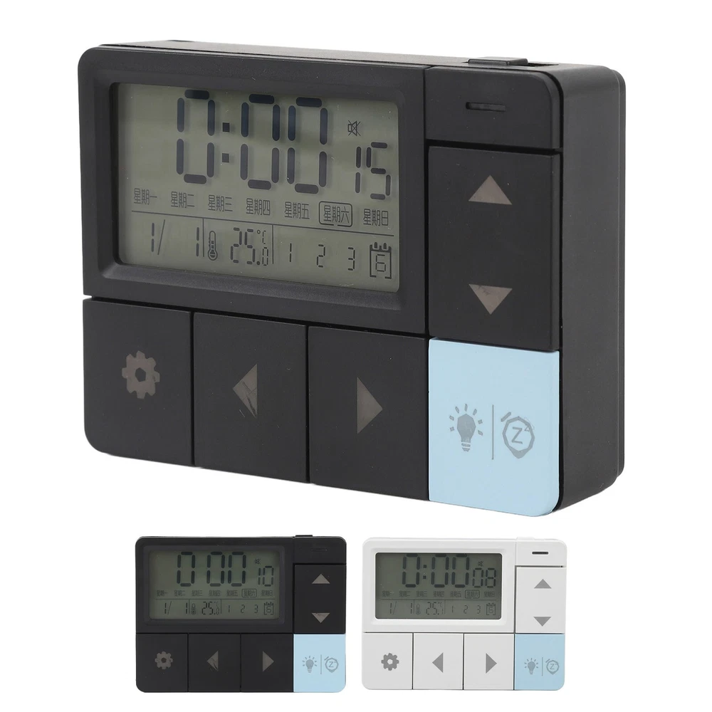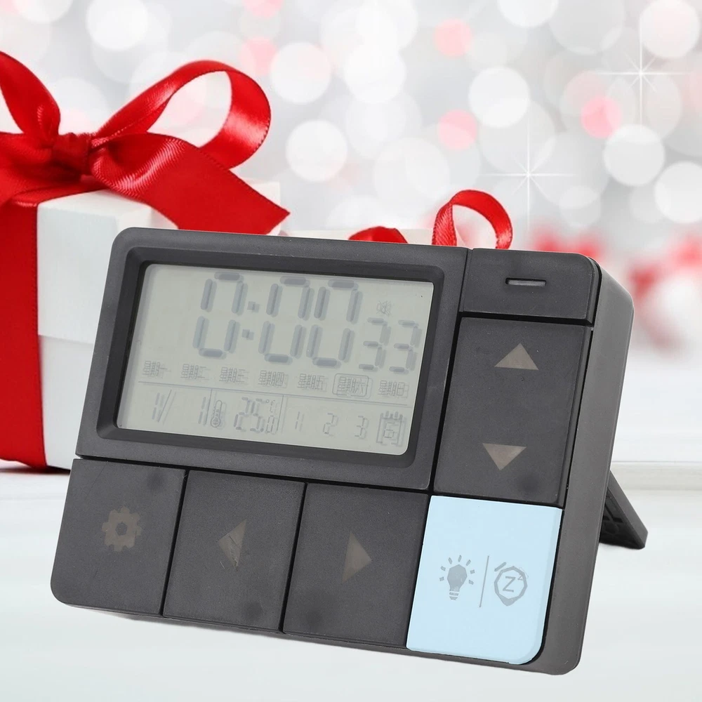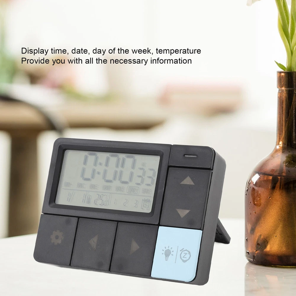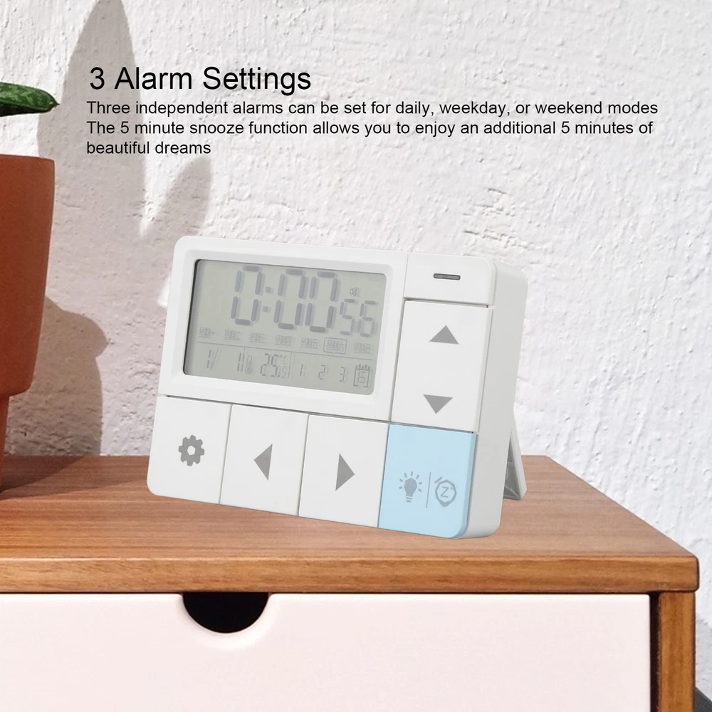 This clock is a total game-changer! It shows everything I need at a quick glance—time, date, even the temperature. Setting three different alarms is perfect for my schedule, and the snooze button is my morning lifesaver. Looks sleek and keeps me organized!