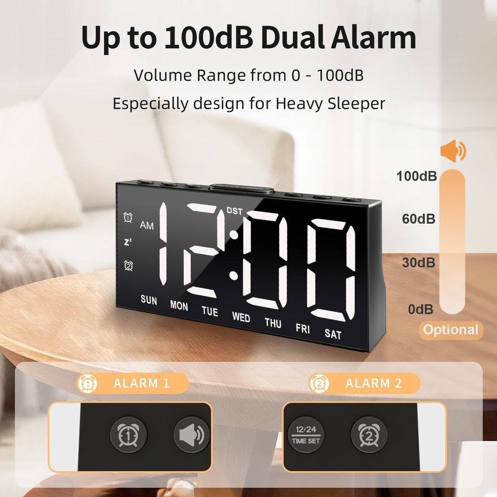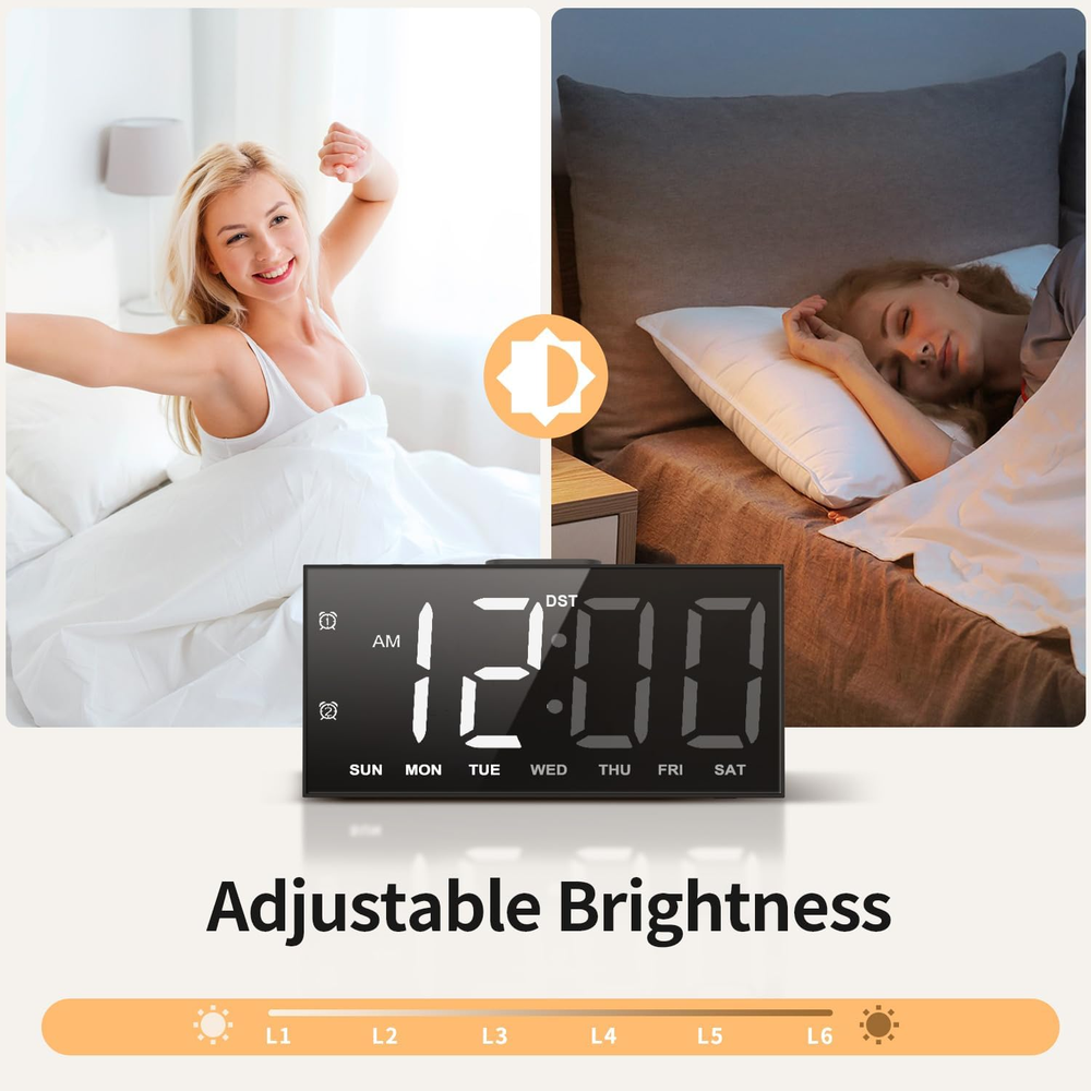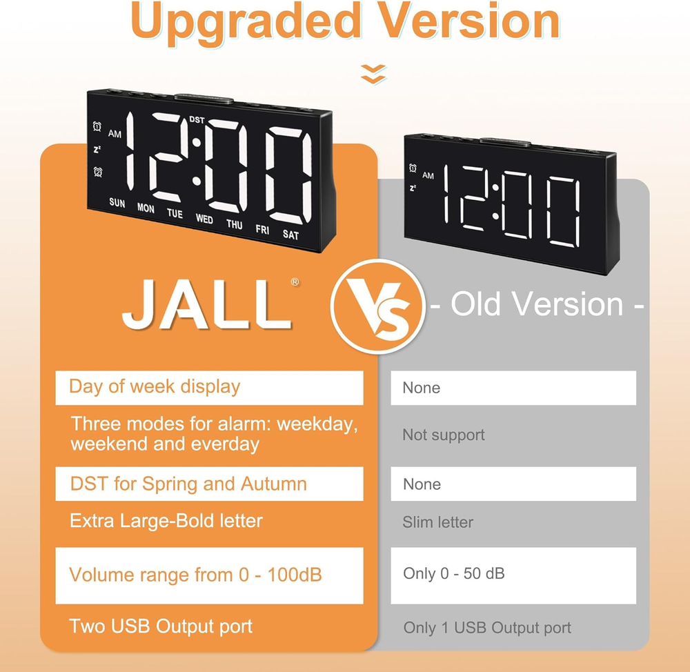 Store New Arrivals Add to Favorite View Feedback Digital Alarm Clock with Large Display Big Bold Numbers, Dimmer, 2 USB Charging Ports, Snooze, Small Table Desk Clock for Bedroom, Living Room, Clock for Heavy Sleepers Description Item model number CH-05 Style Modern Number of Items 1 Power Source Corded Electric Warranty Type Lifetime Theme Modern Are Batteries Included No Room Type Bedroom, Living Room, Dining Room, Nursery, Home, Office Product Dimensions 6.3"W x 3"H Material Plastic Watch Movement Automatic Frame Material Acrylonitrile Butadiene Styrene Age Range (Description) kid, Teenager, Adult Alarm Clock Yes Number of Batteries 1 CR2032 batteries required. Manufacturer JALL Indoor/Outdoor Usage Indoor Batteries 1 CR2032 batteries required. Item Weight 3.2 ounces Special Feature Loud Alarm, Large Display, Snooze Display Type Digital Mounting Type Tabletop Color Black Operation Mode Electrical Shape Rectangular Brand JALL 【Large Display With Adjustable Dimmer】 7-inch LED large clear display for digits ensure the time is easy to see even for impaired vision people. The smart brightness dimmer design allows you set the brightness of display with 5 level. Alarm volume can be adjusted to 5 levels according to your depth of sleep, Louder for heavy sleepers while slight for light sleepers. Built-in two USB charging port allows you to charge your smartphone and other devices 【Dual Alarm Clock】 This digital alarm clock can be set 2 different alarms, convenient for family members with a different schedule. Snooze function for extra 9 mins sleep. 【Optional 12/24 Hour Time Format and DST】 This digital alarm clock has optional 12/24 Hour time format and Daylight Saving Time that meet everyone's need. 【Great Gift Idea With Lifetime Warranty】 This digital alarm clock is not only suitable for your room, but also a great gift for Christmas, New Year or Birthday. It has no limitation, you can give it to kids or seniors, boys or girls, friends or families. Also provides Lifetime product warranty. 【Have to Plug-in】It's NOT battery operated. It must work with power adapter (Recommend 5V/2A). There's a memory battery inside so it will remember your setting even it's disconnected. Product Description ABOUT US We offer the best prices around on high quality products. Our E-store includes media such as books, movies, music and games while offering electronics, toys, sporting apparel, clothing, tools, general home, garden items and more. SHIPPING We are always working hard to ensure your package arrives as soon as possible. Please understand that some factors like weather, high postal traffic, and the performance of shipping companies are outside of our control. We offer free shipping to the lower 48 states and ship within 2 business days of payment, usually sooner. We do not accept P.O. Boxes. Please provide a physical address. RETURNS We offer a 30-Day Return Policy on items which you are not completely satisfied with. You have the option for a full-refund or an exchange of the item. No returns are available on items shipped outside of the USA. PAYMENT We accept PayPal. CONTACT US This page content is yet to come Please ad us to your favorite seller and visit again later Thank You