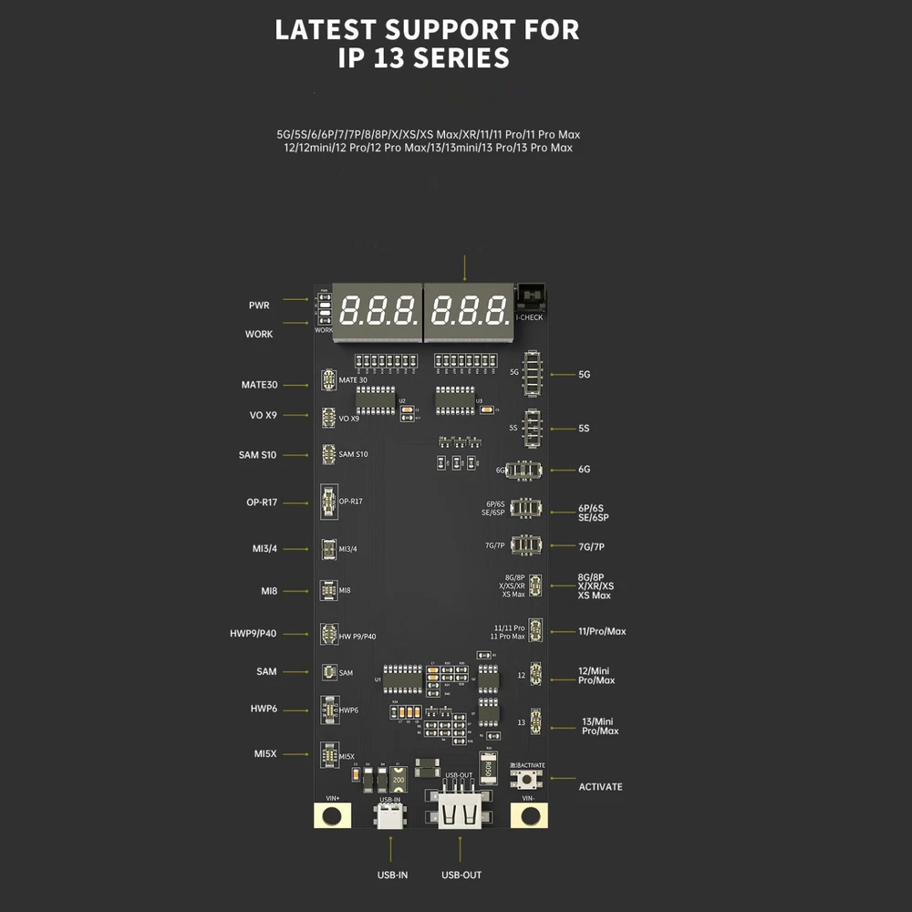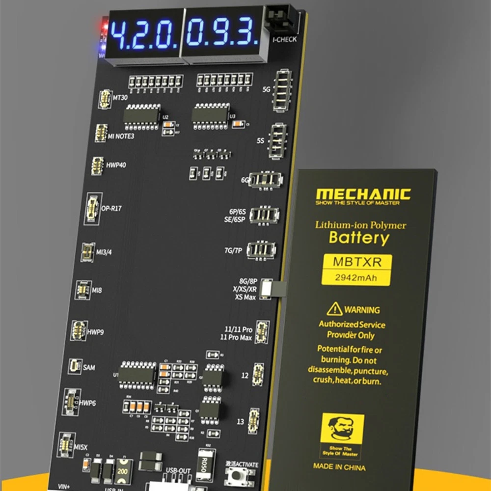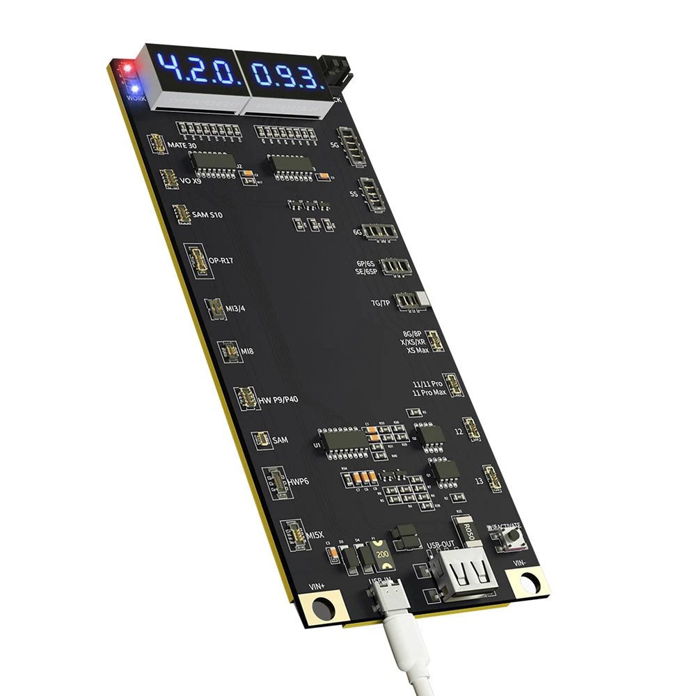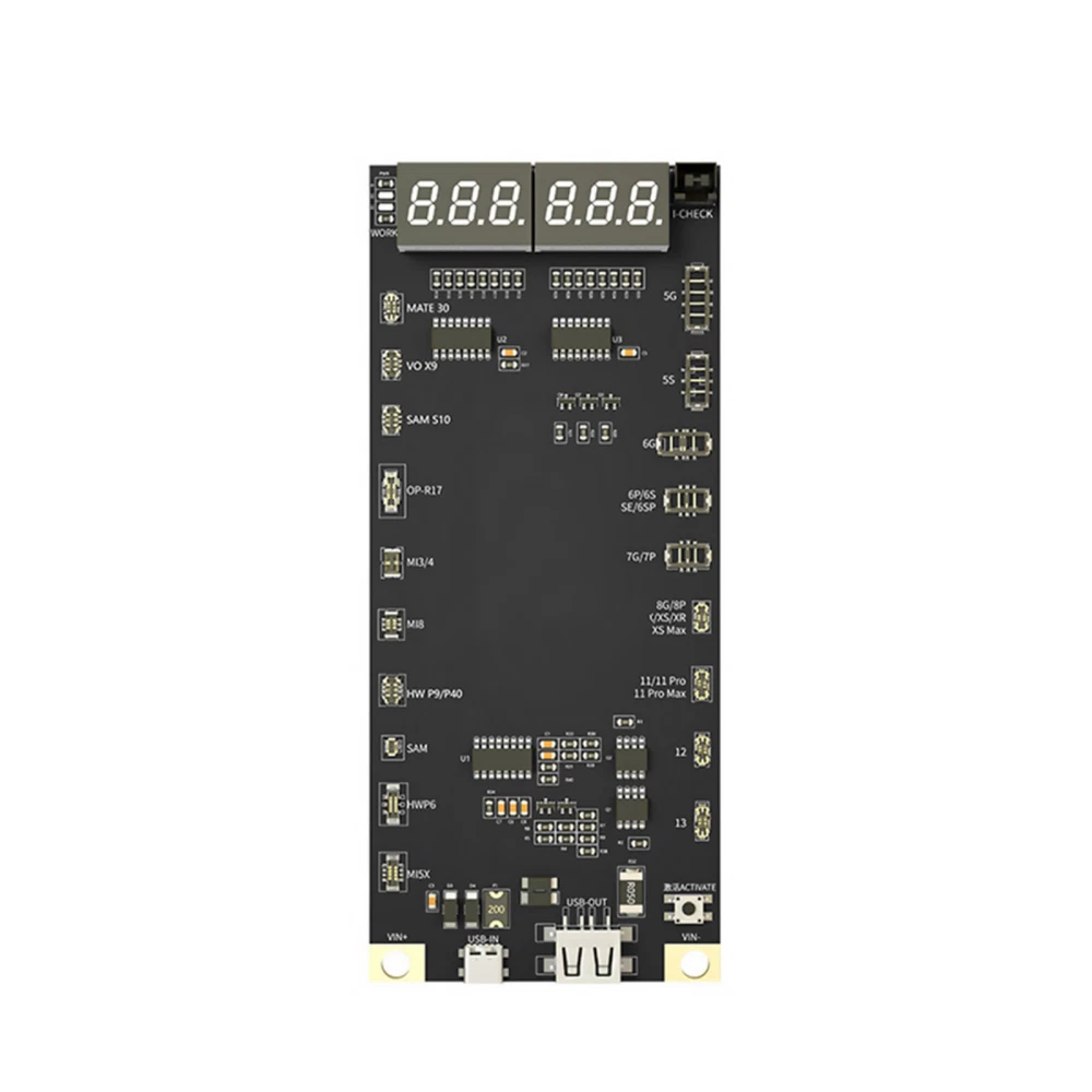 NEW-00023 Digital Battery Activation Detection Board For iPhone 5 6 7 8 X XS XR 11 12 13 PRODUCT DESCRIPTION Features: 1. Battery One-button activation. 2. Current/voltage real-time monitoring. 3. Can be externally connected pointer table interface. 4. Intelligent recognition battery. 5. Charging/output multiple interfaces. 6. 4.2v regulated output. 7. Latest support for iPhone 13 series. 8. With Type-C/USB/Alligator clip three interfaces, use according to demand Specifications: Name: Battery activation detection board Model: BA19 Size: 140*60*10mm Voltage: 4.2V-4.5V Screen Display: LED digital display Support Model: for 5G/5S/6/6P/7/7P/8/8P/X/XS/XS Max/XR/11/11 Pro 11Pro Max/12/12mini/12 Pro/12 Pro Max/13/13mini/13 Pro/13 Pro Max/for Android models up to 400+ Package include: 1X Battery Activation Detection Board Shipping Contact Us Our products have been sent to the US warehouse. All items will be shipped via WINIT CORPORATION. In 2-5 working days, you will receive your items. Thank you and have a nice day. If you have any question about us or items, please contact us, we will reply it as soon as possible. Shipping Our products have been sent to the US warehouse. All items will be shipped via WINIT CORPORATION. In 2-5 working days, you will receive your items. Thank you and have a nice day. Contact Us If you have any question about us or items, please contact us, we will reply it as soon as possible. PaymentShippingReturn policyAbout usContact us Copyright © - Tongtool All rights reserved | Design:Tongtool