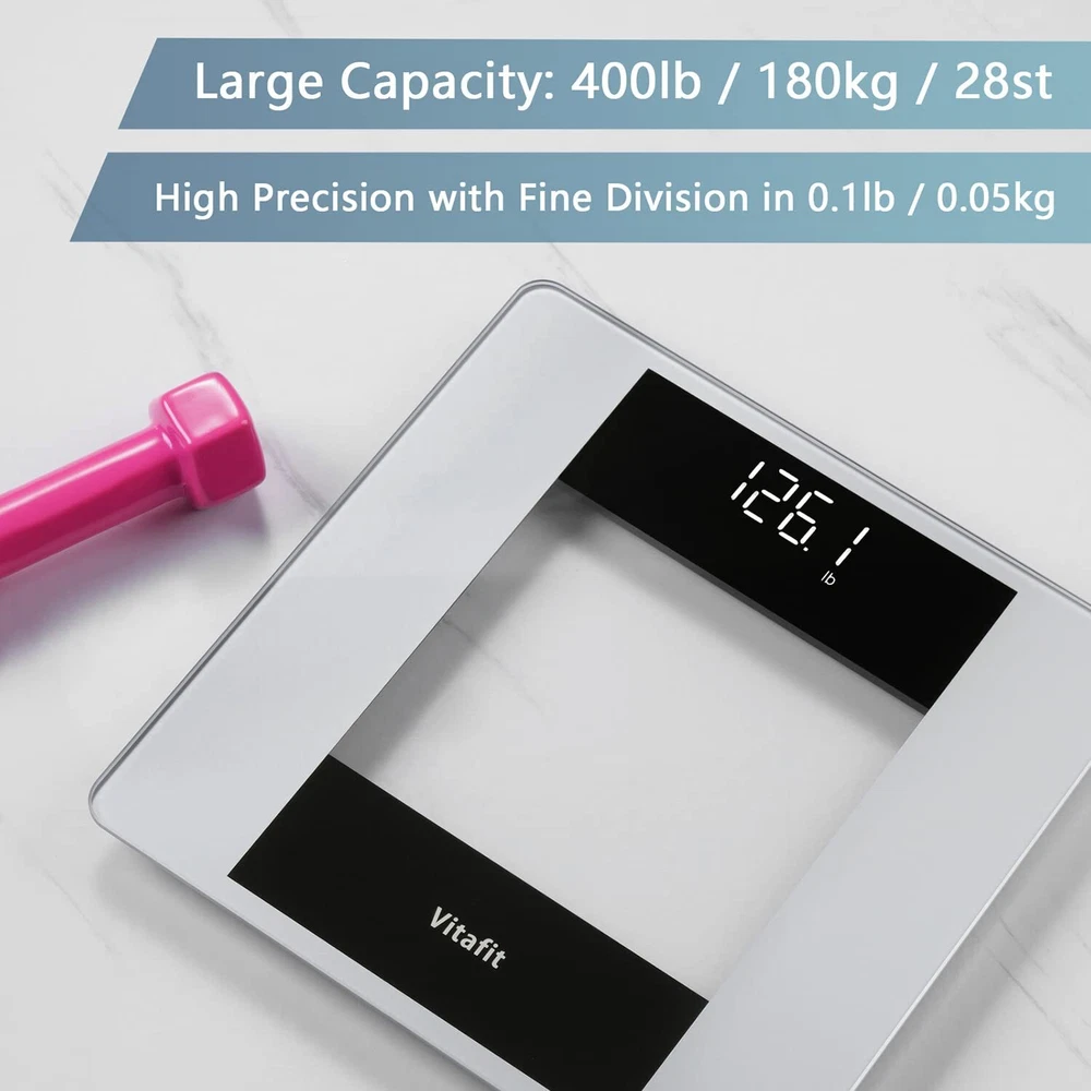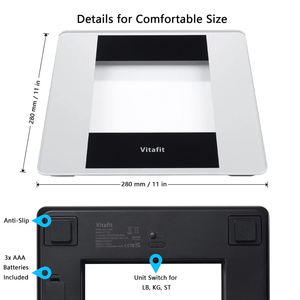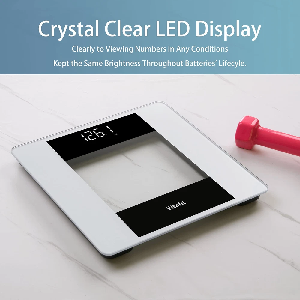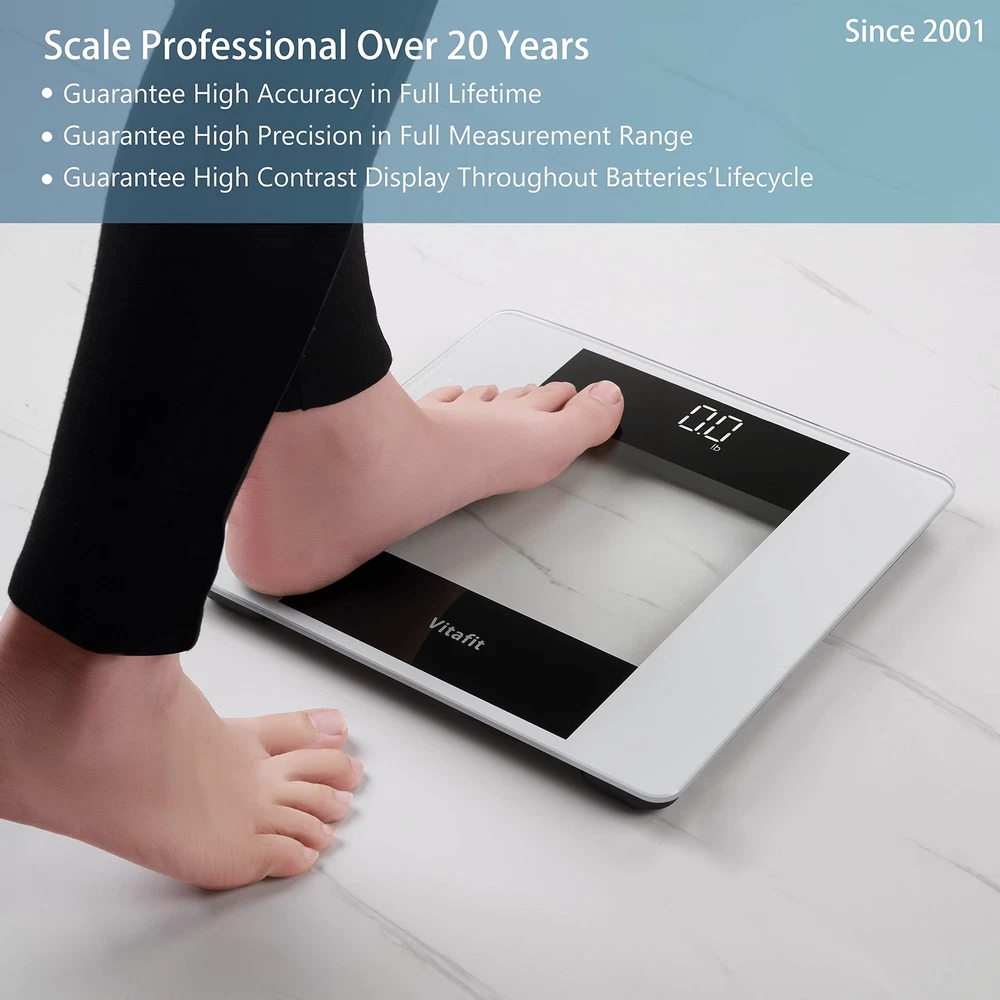 AMAZING ACCURACY CHOICE - Benefiting from over 20years scale professional experience, we made the scale with best-in-class technology and expertise, and proudly guarantee high accuracy at 0.1lb/0.05kg increment throughout the scale lifecycle. EASY TO USE - The bathroom scale utilized up-to-date digital technology, along with many friendly features, including: auto calibration, auto step-on, auto power off, comfortably large size platform in 11'' x 11'', 3*AAA batteries included, 3 units switch: lb/kg/st, and high precision in full weighing range. EASILY VISIBLE LED - The digital scale is equipped with crystal clear LED in large number size, specially designed for clearly viewing numbers in any conditions, and kept the same brightness throughout batteries’ lifecycle. ORIGINAL DESIGN - The weight scale is our original design with the idea: Classic and Elegant. Our whole team sincerely wishes it is not only the perfect scale for body weight, but also a perfect decoration in your bathroom, bedroom, or living room. BEYOND OUR DIGITAL SCALES - Our factory was established in 2001. Our first-class quality and social management system has been certified by ISO and Social Accountability. All products are supported by our US customer service center in the heartland state Missouri. : Inspired by Life, for Better Life.