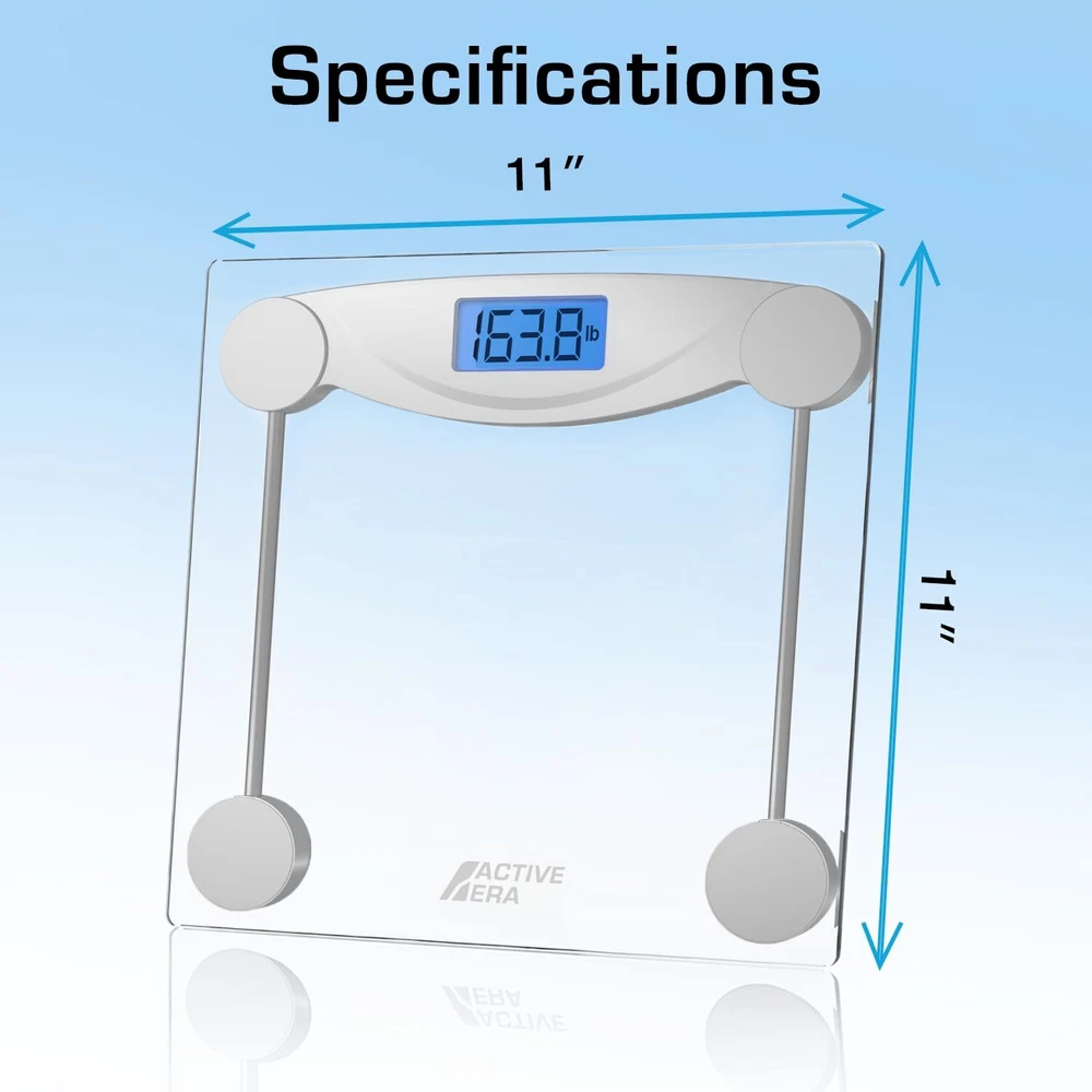 ™ Ultra Slim Digital Bathroom Scales: These ultra-slim bathroom scales from feature 4 precision weighing sensors that deliver unparalleled accuracy in stone, kilograms or pounds. A large 11" x 11" platform ensures weight is evenly distributed across the surface, and an 0.24" tempered glass structure provides a durable and sleek design to suit any home, bathroom or gym. Features: 4 High-precision weight measurement sensors (0.1lb accuracy) Ultra-strong tempered glass platform (6mm) Easy-to-read LCD display with backlight Step-on and step-off power Overload protection Batteries Included (2 x AAA) Specifications: Max Weight: 400lb / 28st / 400kg Resolution: 3.2oz LCD: 2.95 x 1.18 inches with blue backlight Size: 11 x 11 x 0.86 inch HIGH PRECISION WEIGHT SCALE: This digital scale is engineered with 4 advanced sensors which provide pinpoint accuracy to the nearest 0.1lb/0.1kg. Body weight readings can be displayed in pounds, kilograms or stone (lb/kg/st), simply selected your desired reading ULTRA-STRONG GLASS: Each digital bathroom scale is made with ultra-strong 0.24" tempered glass and a large 11" x 11" platform to allow for even weight distribution and increased accuracy. LCD DIGITAL DISPLAY: Our body scale has an easy to read LCD display which is fitted with a bright blue back-light - ideal for both day and night time use. EASY TO USE: Innovative step-on technology saves energy and time as it instantly displays your weight reading as soon as you step on the scales. Each scale for body weight also features overload safety protection and a low battery indicator, making it the perfect bathroom accessory. SLIM & STYLISH: Elegantly designed to fit in your home, bathroom or gym, it is the ideal weight loss companion. The crystal clear glass display is easy to clean and maintains its look over time. 2 x AAA Batteries included.