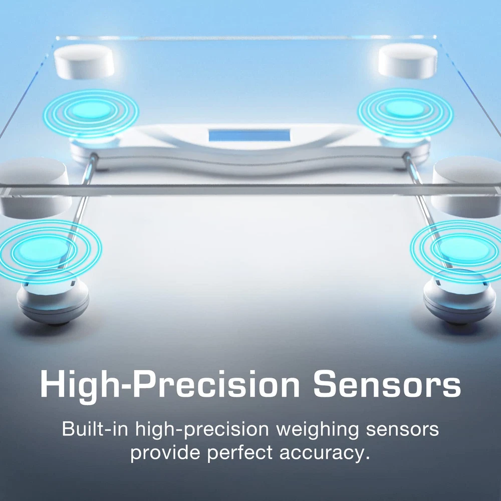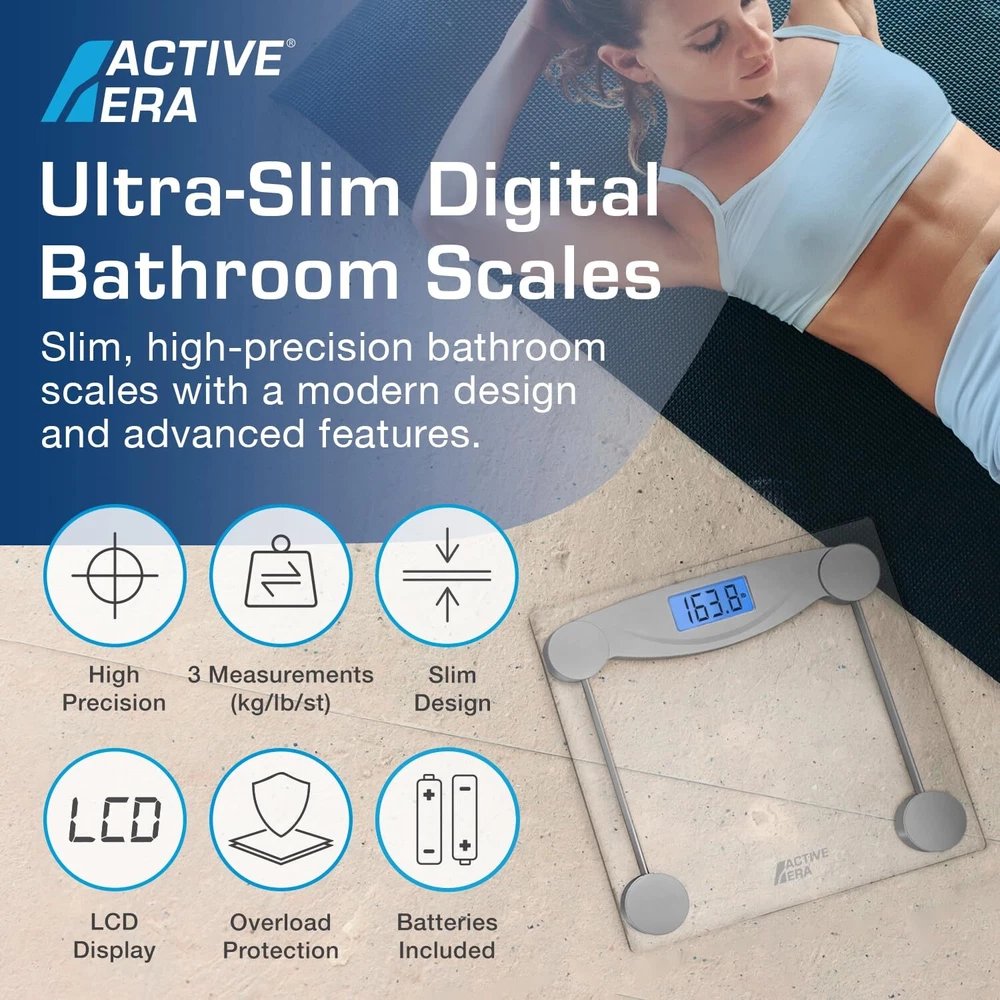 ™ Ultra Slim Digital Bathroom Scales: These ultra-slim bathroom scales from feature 4 precision weighing sensors that deliver unparalleled accuracy in stone, kilograms or pounds. A large 11" x 11" platform ensures weight is evenly distributed across the surface, and an 0.24" tempered glass structure provides a durable and sleek design to suit any home, bathroom or gym. Features: 4 High-precision weight measurement sensors (0.1lb accuracy) Ultra-strong tempered glass platform (6mm) Easy-to-read LCD display with backlight Step-on and step-off power Overload protection Batteries Included (2 x AAA) Specifications: Max Weight: 400lb / 28st / 400kg Resolution: 3.2oz LCD: 2.95 x 1.18 inches with blue backlight Size: 11 x 11 x 0.86 inch HIGH PRECISION WEIGHT SCALE: This digital scale is engineered with 4 advanced sensors which provide pinpoint accuracy to the nearest 0.1lb/0.1kg. Body weight readings can be displayed in pounds, kilograms or stone (lb/kg/st), simply selected your desired reading ULTRA-STRONG GLASS: Each digital bathroom scale is made with ultra-strong 0.24" tempered glass and a large 11" x 11" platform to allow for even weight distribution and increased accuracy. LCD DIGITAL DISPLAY: Our body scale has an easy to read LCD display which is fitted with a bright blue back-light - ideal for both day and night time use. EASY TO USE: Innovative step-on technology saves energy and time as it instantly displays your weight reading as soon as you step on the scales. Each scale for body weight also features overload safety protection and a low battery indicator, making it the perfect bathroom accessory. SLIM & STYLISH: Elegantly designed to fit in your home, bathroom or gym, it is the ideal weight loss companion. The crystal clear glass display is easy to clean and maintains its look over time. 2 x AAA Batteries included.
