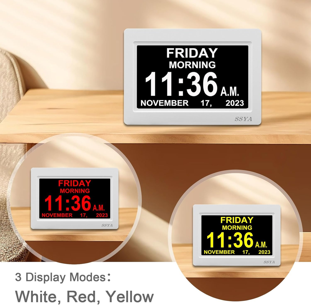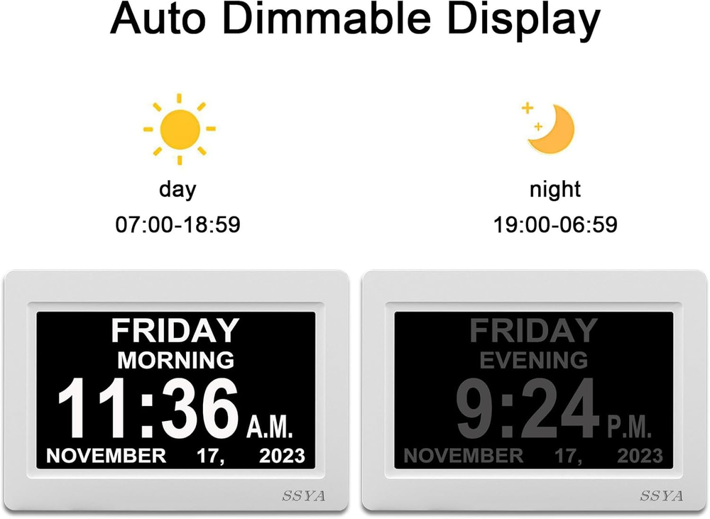 Store New Arrivals Add to Favorite View Feedback Contact Digital Calendar Alarm Clock - Dementia Clocks for Vision Impaired, Elderly, Memory Loss Clock with Non-Abbreviated Clock with Date and Day (7 Inch) Description Item model number Z071 Style Digital Number of Items 1 Power Source Corded Electric Dial Color black Country of Origin China Operation Mode Electrical Theme Plain Are Batteries Included Yes Room Type Bedroom, Living Room, Home Office Batteries required Yes Product Dimensions 8.03"W x 5.63"H Material Plastic Watch Movement Automatic Frame Material Plastic Age Range (Description) Adult Alarm Clock TRUE Number of Batteries 1 Lithium Metal batteries required. (included) Indoor/Outdoor Usage Indoor Item Weight 1 pounds Special Feature Corded Display Type Digital Mounting Type Tabletop, Wall Mount Color 7" White Shape Rectangular Batteries 1 Lithium Metal batteries required. (included) Size 7 inch Clear Display:7 inch 1024*600 HD LCD,Clearly spells out the time.no confusing abbreviations,easy to read. Time display: 6:00 am - 11:59 am (MORNING), 12:00 pm - 5:59 pm (AFTERNOON), 6:00 pm to 8:59 pm (EVENING), 9:00 pm to 11:59 pm (NIGHT) and 12:00 am - 5:59 am(PREDAWN). Easy to Use: Plug and play, Easy to set up. It can be hung on a wall or stood on a table. No matter which you choose, you can see the time, date, and day of the week very well. Auto Night Dimming: The clock auto dims during the night at 7:00 pm and brightens up during the day at 7:00 am. It also has the option to turn off the auto-dimming function,5 levels of brightness to choose from, which is convenient for the people who prefer high brightness all the day. Easy Alarm Settings:12 Alarm Modes Easy set , Single Alarm, Every Day, Weekdays Only, or Weekends Only. & tag: Meal, Medicine, Appointment and so on. It is quickly becoming a perfect Senior Care and In Home Care necessity. 8-Languages Support: The large display digital clock for seniors supports 8 languages (English, français, Deutsche, italiano, Polskie, Español, Nederlands, Cymraeg) and offers different time formats. Backup: In case of a power outage, it will be reset to the correct time and date when the power returns. The clock requires an A/C adapter (included) to operate. Best Clock for Senior Care: Many seniors are suffering from memory loss due to dementia, stroke, Alzheimer's or just advancing years.This clock can provide them with great help, buy an clock for your loved ones today! Product Description BEST CLOCK FOR SENIOR CARE: This unique High Resolution Digital Alarm Clock clearly spells out the time. no confusing abbreviations. Many seniors are suffering from memory loss due to just advancing years,Give the gift of confidence and happiness ! Different time display modes: The Day Clock can be set to 12-hour or 24-hour format, which can meet your various requirements. Also, different DATE display: Month-Day-Year/Day-Month-Year date display. 1.5 meter-cable: The Day Clock has 1.5 meter-cable which can be hung on a wall or stood on a table, nightstand, shelf or desk (using its pull-out stand). Anti-glare screen: 7-inch alarm clock clearly spells out the full DAY of the WEEK, MONTH and DATE in large, bold letters with no confusing abbreviations. The large anti-glare screen allows you to easily read the time from any angle across a large room. Great clock for the Vision Impaired, Elderly and Memory Loss People. Package Contents 1 x Digital Clock, 1 x Adapter, 1 x English User Manual, 1 x Holder High-resolution large clock: The clearest, easiest-to-read day clock. It's great for seniors who are faced with memory loss. The alarm clock is incredibly easy to set up and use. It is the best gift for your loved ones! Digital Photo Frame Support USB flash drive(Not Include) : The alarm clock can also serve as a digital photo frame with an USB flash drive (Not Included). insert the USB flash drive in the slot at the back of the clock. And it can play the photo video or music on your USB flash drive too. Let you enjoy your free time better. 12 Alarms options alarm clock 12 Alarms options and set tag:Meal,Medicine,Clinic,Shower,Gardening,Cleaning,Appointment and walk dog . It is quickly becoming a perfect Senior Care and In Home Care necessity. Auto Light Dimming The clock will auto light dimming from 7 pm to 7 am to help save energy and protect eyes. 8 languages clock It supports English, French, German, Italian, Spanish, Polish, Dutch and Welsh, which is suitable for transnational families. Wide in use Suitable for Home, Office, Bedroom. Perfect gift for elderly who suffer Vision Impaired, Elderly and Memory Loss. ABOUT US Customer service is our top priority! Please be sure to read the description thoroughly to make sure that this is the item you want before making a purchasing decision. If you have any questions about this item, please contact us via eBay messages before placing your order. We make every effort possible to accurately describe and depict the items. Please be aware that slight variations in color may be due to differences in lighting and computer monitor resolutions. All items are in stock at the time of listing; however, in the unlikely and unforeseen event that we are unable to fulfill your order through any of our networked warehouses, we will notify you as quickly as possible and offer you a 100% refund on your purchase. Thank you for shopping with us. We appreciate your business! SHIPPING We are always working hard to ensure your package arrives as soon as possible. Please understand that some factors like weather, high postal traffic, and the performance of shipping companies are outside of our control. We offer free shipping to all 50 states including Puerto Rico and ship within 3 business days, usually sooner. Shipping times to Contiguous U.S. vary from 1-4 business days depending on your location. Shipping times to Alaska, Hawaii, and Puerto Rico vary from 5-9 business days depending on the destination, however certain restrictions may a