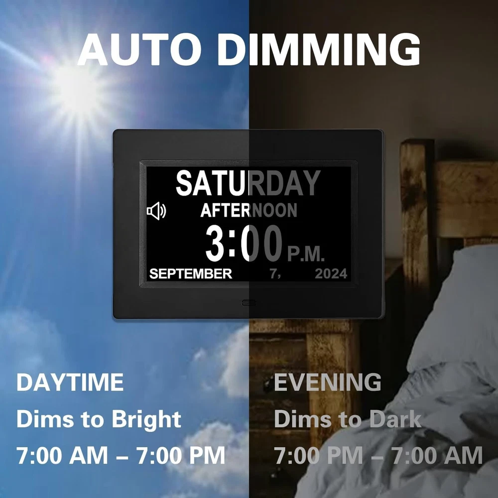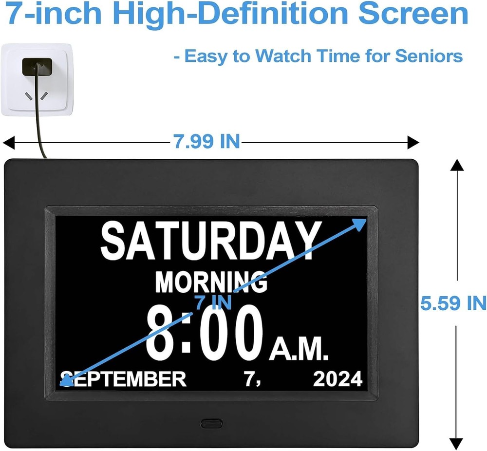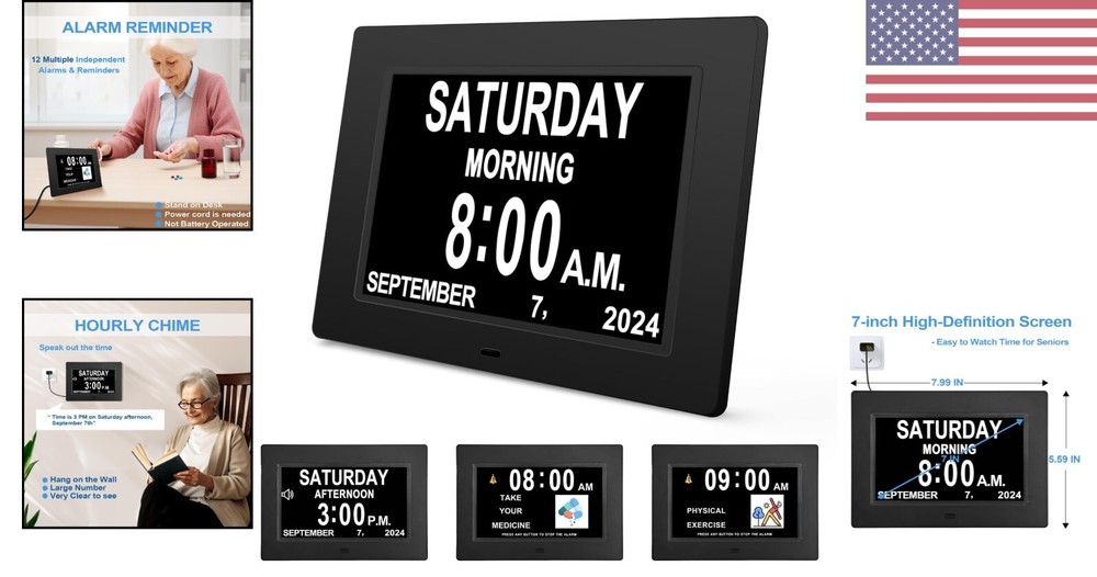 Digital Calendar Clock with 12 Alarms & Reminders - Perfect for Impaired Vision ‹ › ‹ › ‹ › ‹ › ‹ › ‹ › ‹ › ‹ › Digital Calendar Clock with 12 Alarms & Reminders -Perfect for Impaired Vision Features: 7-inch high resolution large screen display Clear display of time, date, month, and year Visible from a distance 12 separate alarms & reminders available Helps seniors with medication, doctor appointments, exercise, and afternoon tea Hourly chime for impaired vision and dementia Auto-dimming option with 3 levels Ideal gift for elder parents Simple UI settings with only 7 control buttons Benefits: Easy to read time and date from a distance Helps seniors stay organized and remember important tasks Assists impaired vision and dementia patients in knowing the correct time Adjustable brightness for comfortable viewing at night Great addition to any home User-friendly design for easy operation Why choose our Digital Calendar Clock? Don't let impaired vision or memory loss hinder your loved ones' daily routines. Our Digital Calendar Clock is the perfect solution, featuring a large 7-inch screen that clearly displays the time, date, month, and year. With 12 alarms and reminders, it's easy for seniors to stay on top of medication schedules, doctor appointments, exercise routines, and afternoon tea breaks. Designed with impaired vision and dementia patients in mind, our clock offers an hourly chime to help them keep track of time. The auto-dimming option ensures the brightness adjusts throughout the day, preventing it from being too bright at night. It's the ideal gift for elder parents, making it much easier for them to see the time from a distance. With a senior-friendly UI and simple control buttons, our Digital Calendar Clock is incredibly easy to use. Say goodbye to confusion and frustration - order your clock today and make life easier for your loved ones. Shipping Free & Fast Shipping - We offer free shipping to most of the USA with a normal delivery time of 3-7 days. However, due to the current situation, additional delivery time (up to 3 weeks) may be required for some items. Alternative Carriers - We may use alternative carriers (e.g. USPS, FedEx, UPS, etc.) to ensure your package arrives safely and on time. Due to the use of multiple carriers, we are unable to provide a tracking number automatically. Handling Time - Orders are processed and shipped within 1-2 business days of receiving cleared payment. Shipping Restrictions - Shipping to Alaska, Hawaii, Puerto Rico, Guam, and other US territories may incur shipping charges or delivery restrictions. Please contact us before ordering, or your order can be refunded/cancelled. State Restrictions - There may be restrictions based on your state of purchase. For example, certain items may not be shipped to California due to state regulations. Contact for Tracking Updates - If you require tracking updates or have any concerns about the delivery of your order, please feel free to contact us, and we will be happy to assist you. Return 30-Day Hassle-Free Returns - We want you to be completely satisfied with your purchase. If you are not, you can return the item within 30 days of receiving it for a full refund or exchange. Easy Return Process - To start a return, simply contact us and we will provide you with a prepaid return shipping label and detailed instructions. Restocking Fee - There are no restocking fees for returns. However, the buyer is responsible for return shipping costs if the return is not due to a seller's error. Refund Processing Time - Refunds will be processed within 5 business days of receiving the returned item in its original condition. Payment We accept all major credit cards, PayPal, and Apple Pay for your convenience. Your payment information is secure and encrypted to ensure a safe and seamless transaction. Please complete your payment within 3 days of purchase to avoid any delays in shipping. Feedback Your feedback is extremely important to us. We strive to provide the best products and customer service possible. If you are satisfied with your purchase, please take a moment to leave us a positive review. If you have any concerns or issues with your order, please contact us before leaving negative feedback. We are committed to resolving any problems and ensuring your satisfaction. Contact Us If you have any questions or concerns, please feel free to reach out to our customer support team. You can contact us through the eBay messaging system. We are available Monday to Friday, 9:00 am to 5:00 pm EST, and we will do our best to respond to your inquiry within 24 hours. Thank you for supporting our small family business!