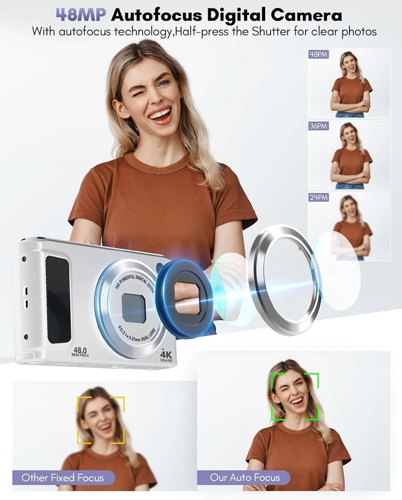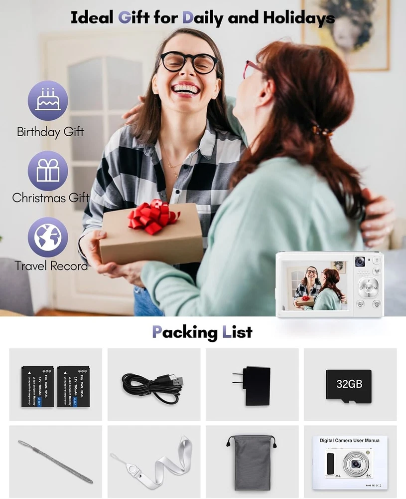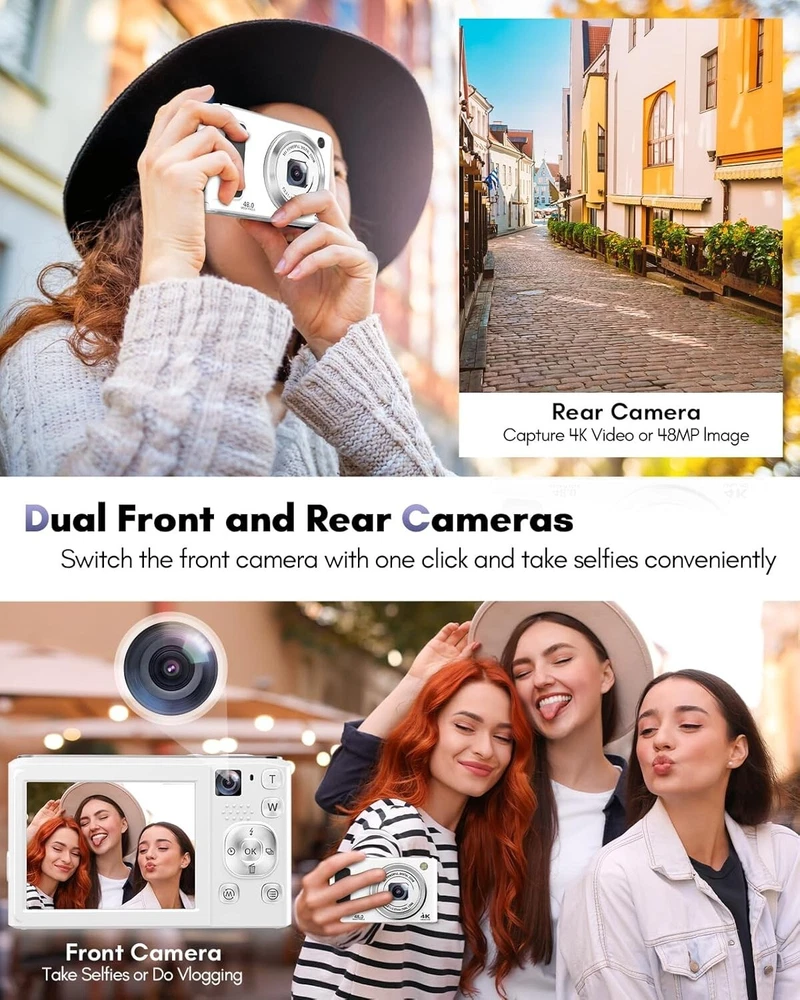 -Brand New - Never Used - Questions: Feel free to ask any Questions - BOX: Never Opened - DESCRIPTION: 【48MP Dual-Lens Digital Camera, Easily Record Your Travels!】This digital camera uses the latest CMOS image sensor system, allowing you to easily capture stunning 48MP HD images. Equipped with dual lenses, it enables one-touch switching between selfies and landscape photos without the need for assistance. Even beginners can take amazing photos of people, scenery, selfies, and more during their travels! 【Autofocus 4K Digital Camera for Photography】This compact digital camera features an innovative autofocus system. In photo mode, lightly tap the capture button to keep the camera steady to activate autofocus. When you see the focus frame on the screen change from yellow to green, the focus is complete. Fully press the capture button to take the clearest and most vivid photos. The W/T button allows you to adjust the 16x digital zoom, making it easy to capture distant scenery. 【4K Video Blog Camera with Pause Function】This video blog camera supports 4K video mode, and the dual cameras can switch the content and composition perspective as you wish. Press the "OK" button to pause while recording or playing back video, making use of the pause function. The camera also supports mounting on a tripod for use as a webcam. Equipped with two rechargeable batteries and the ability to record while charging, you never have to worry about running out of power during shooting. 【Portable and Versatile Features】This portable small digital camera is equipped with a 2.8-inch IPS screen and is extremely lightweight, making it perfect for your pocket when you want to travel light without carrying a ton of lenses. This digital camera also offers a variety of image styles, self-timer(2/5/10S), 3-continuous shooting, face recognition, anti-shake can make the picture stable and clear, and fill light allows you to take high-quality photos in low-light conditions. 【Complete Camera Set: Ideal Choice】This point and shoot digital camera comes with a high-quality 32GB card, wrist strap, and lanyard to free your hands and prevent the camera from falling when not in use - OFFERS: Reasonable offers are considered, LOWBALLERS, Best price and Lowest askers will be ignored - all sales final/no refunds/ no exchanges/ no returns - Disclaimer: I do not own the brand's trademarks, logos, pictures, or products posted. I do not intend to infringe on copyright. I find such content available on the internet. Contents are considered fair use. - Digital Camera, 48MP Autofocus Cameras for Photography,Vlogging Compact Camera with Front and Rear Camera, 16X Zoom Protable Point and Shoot Cameras with 32GB SD Card,Anti-Shake,2 Batteries(White)