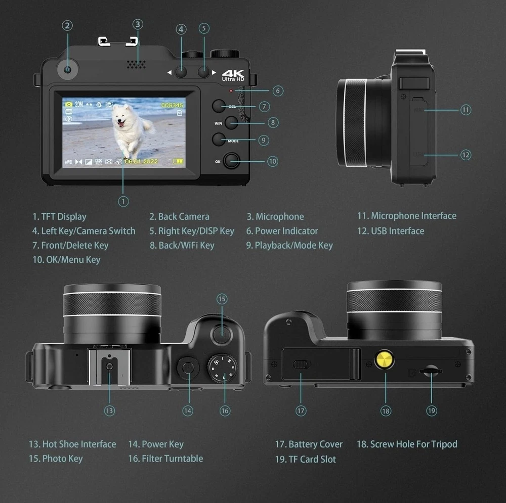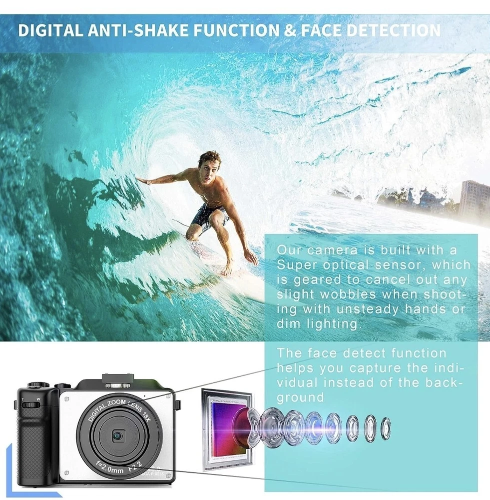 ✔【VLOGGING CAMERA WITH AUTO FOCUS & ANTI-SHAKE】Our digital camera delivers high-bit-rate 4K-resolution video and clear image at 48MP without missing any details. The 4k camera also supports 18X digital zoom. By just one-click you can take real auto focus and anti-shake photos. The free hand strap which you can wrap your finger around comfortably helps prevent dropping the video camera. ✔【A CREATIVE POINT AND SHOOT CAMERA!】The multifunction handgrip features an ergonomic design that puts important functions such as focus zoom and shutter buttons at your fingertips. There's even a scroll wheel under your index finger for making quick 7 color filters adjustments, so you get total creative freedom to make more funny pictures! ✔【TRUVIEW ORIGINAL WIDE ANGLE LENS】With the built-in wide-angle lens, this camera for photography is able to capture 45% more picture with every snap. There is no need to take heavy add-on lens, which greatly reduces your travel burden. With this 4k camera, you can shoot stunning photos of people, landscapes, selfies and more! ✔【WIFI & 9-SQUARE GRID FUNCTION】Pictures and videos can be instantly shared online with mobile phones through the Wi-Fi function, allowing friends to share your happiness in the first time without waiting any longer. The 9-square grid function enables you to take ideal pictures with better proportions, which makes you act like a professional photographers! ✔【BEST CAMERA FOR YOUTUBE】The YouTube camera for vlogging can be used as webcam for live streaming. Our vlogging camera also supports time-lapse, loop video, and slow video features. Compact but powerful for its size, this small camera is great for keeping in your pocket on those occasions when you want to travel light without having to take loads of lenses. We also offer you a 32G TF card so that you can use it the moment you receive it.