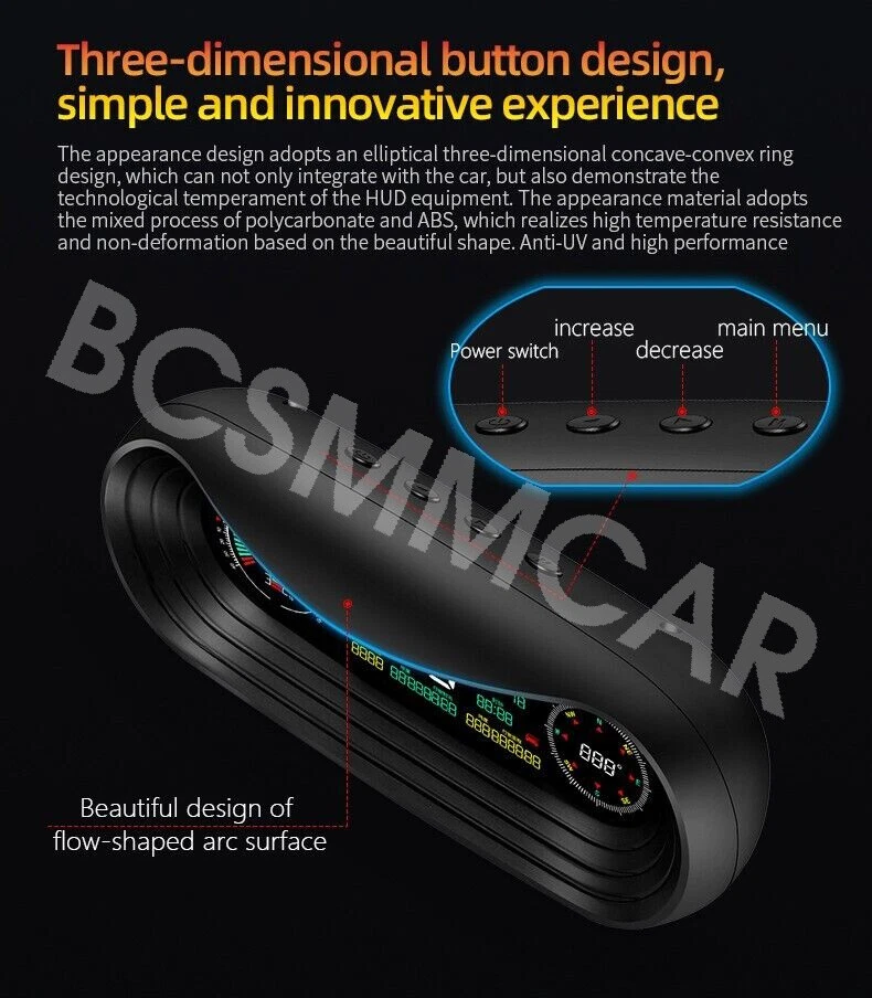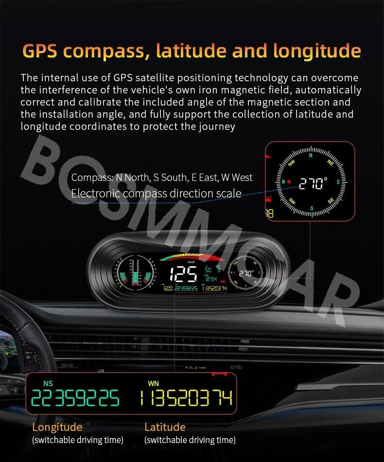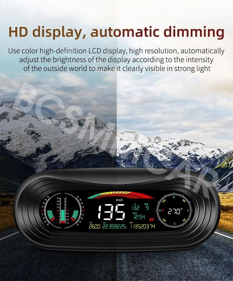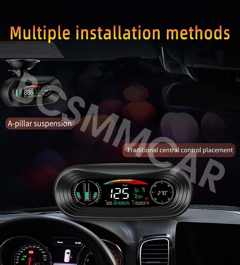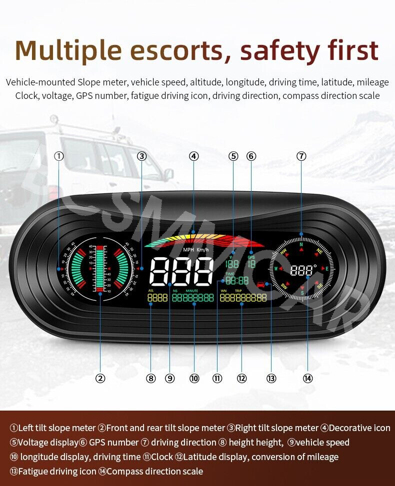Product Description Car Compass HUD Head-Up Display Smart GPS Slope Meter Speedometer Overspeed Warning Gauge Digital Multi-Function Alarm Tool Add our listing to Watchlist Or Add to Cart , you will get more discount Main feature 1. Left tilt Slope meter 2. Front and rear Slope meter 3. Right Slope meter 4. Decorative icons 5. Voltage display 6. GPS number: flashing means searching for satellites, GPS light stops flashing and displays the number of satellites after the satellites are found 7.Driving direction: Driving direction indication:W=West, N=North, S=South, E=East when the vehicle speed >5KM / H (NW: Northwest NE: Northeast SW: Southwest SE: Southeast) 8. Altitude 9. Speed 10. Longitude display,driving time 11. The clock defaults to the UTC 8, and the time in the UTC 8 is displayed after the satellite signal is searched (adjust the local time zone according to the location) 12. Latitude display,mileage display 13. Fatigue driving icon, flashing reminder after accumulated driving for >4 hours 14. Compass direction scale Package included 1 x GPS Slope Meter 1 x Manual 1 x Suction cup holder 1 x Car Charger +USB cable Payment Returns Contact Us Shipping We accept payment by PayPal only ! Payment should be completed within 5 days after buyer places the order,or else an unpaid case will be opened in order to cancel the transaction. If you can not pay in time, please contact us. e-check from PayPal will only be processed once the payment clears. All of the items will be shipped to buyer's EBAY address,please confirm your address on Ebay before you buy.Your order will be usually shipped out the same or next business days once the payment is made and cleared. 30-day Warranty with Exchange for defective, malfunctioned, incorrect or parts-missing items. Please notify us and return the item with all parts and accessories packed and marked "FOR EXCHANGE" within 14 days of receipt. If defective, malfunctioned or parts-missing items are no longer available, a refund may be issued. All returning postage costs will be the responsibility of the buyers under all circumstances. If you encounter any problems about anything, please feel free to contact us and we will do our best to assist you solve the issue. If you are not satisfied in anyway, please feel free to let us know and give us a second chance to correct it before you decide to leave any neutral or negative feedback. Please contact us through eBay link if you have any questions. We will reply you within 24- 48 hours. Please check you spam mail if no response for 48 hours. All items will be checked before packing. All items are new and of high quality. Item will be shipped within 1 business days upon receipt of payment, excluding weekends and public holidays. If to USA,we will ship your order by USPS,it will take about 8-12 working days to you,and you can track it on line. If to other country,we will ship your order by China Post or Singapore Registered Air Mail,it will take about 14-21 working days to you,you aslo can track it on line. Delivery time is about 14-28 business days and it may take up to 8 weeks . Payment We accept payment by PayPal only ! Payment should be completed within 7 days after buyer places the order,or else an unpaid case will be opened in order to cancel the transaction. If you can not pay in time, please contact us. eCHECK from PayPal will only be processed once the payment clears. All of the items will be shipped to buyer's EBAY address,please confirm your address on Ebay before you buy.Your order will be usually shipped out the same or next business days once the payment is made and cleared. Returns 30-day Warranty with Exchange for defective, malfunctioned, incorrect or parts-missing items. Please notify us and return the item with all parts and accessories packed and marked "FOR EXCHANGE" within 14 days of receipt. If defective, malfunctioned or parts-missing items are no longer available, a refund may be issued. All returning postage costs will be the responsibility of the buyers under all circumstances. Contact Us If you encounter any problems about anything, please feel free to contact us and we will do our best to assist you solve the issue. If you are not satisfied in anyway, please feel free to let us know and give us a second chance to correct it before you decide to leave any neutral or negative feedback. Please contact us through eBay link if you have any questions. We will reply you within 24- 48 hours. Please check you spam mail if no response for 48 hours. Shipping All items will be checked before packing. All items are new and of high quality. Item will be shipped within 1 business days upon receipt of payment, excluding weekends and public holidays. If to USA,we will ship your order by USPS,it will take about 7-10 working days to you,and you can track it on line. If to other country,we will ship your order by China Post or Singapore Registered Air Mail,it will take about 14-21 working days to you,you aslo can track it on line. Delivery time is about 14-28 business days and it may take up to 8 weeks . Welcome to our Store ~