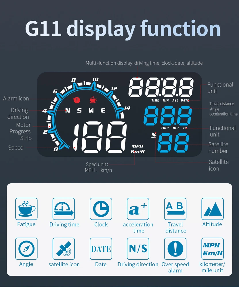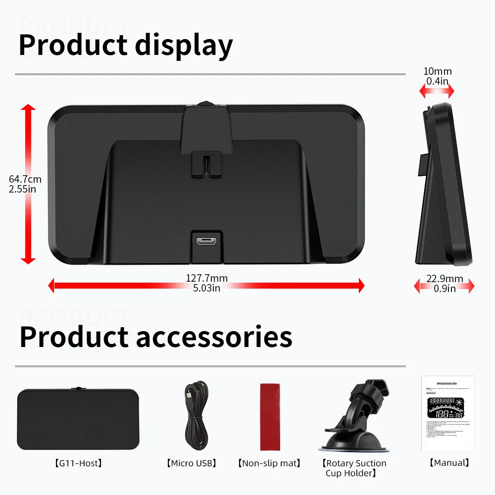 Product Description HUD Head Up Display 5.5in LED Screen Car GPS Speedmeter MPH Altitude Longitude Latitude Digital Display Meter for Car Truck Add our listing to Watchlist Or Add to Cart , you will get more discount Head Up Display Overspeed Alarm Car GPS MPH Detector LED Display Digital Speed Mileage Meter Feature: 1. Compatible with All Vehicles with USB Interface: The car digital HUD G11 is compatible with all vehicles with a USB interface, including cars, electric cars, trucks, hybrids, etc. This design allows you to use the machine on different types of vehicles and eliminates the need to purchase additional adapters. 2. Display of Multiple Data: The car digital GPS speedo is fully functional and can display speed, time, journey time, journey distance, acceleration time from 0-100km, altitude, longitude, latitude, direction of travel (angle) with speeding alarm and fatigue warning. This design provides you with a detailed record of your journey and reminds you of traffic safety. 3. Large LED Display: The electronic head up display is equipped with a large 5.5" 16:9 aspect ratio screen with LED display technology, so that key data can be seen at a glance. This design allows you to see the machine's output more clearly and also ensures a clear display even in bright light conditions. 4. 10Hz High Refresh Rate: The auto smart speedometer uses a GPS chip and supports a high refresh rate of 10Hz with no delay. This design allows you to get the latest location information quickly and without any delay that may affect driving safety. 5. Lightweight and Portable: The GPS speed detector is lightweight and portable and easy to install. The design allows you to conveniently mount the machine anywhere in your car and requires no additional tools or special skills. Specification: Wire or Wireless: Wired Size Name: 127.7 x 64.7mm/5.0 x 2.5inch Material: ABS+PC Light color: blue and white Screen type: LED Screen size: 5.5 inches Applicable model: Universal Package Included: 1x Car Digital HUD 1x USB Cable 1x Double-Sided Adhesive 1x Suction Cup Stand 1x Instruction Manual Payment Returns Contact Us Shipping We accept payment by PayPal only ! Payment should be completed within 5 days after buyer places the order,or else an unpaid case will be opened in order to cancel the transaction. If you can not pay in time, please contact us. e-check from PayPal will only be processed once the payment clears. All of the items will be shipped to buyer's EBAY address,please confirm your address on Ebay before you buy.Your order will be usually shipped out the same or next business days once the payment is made and cleared. 30-day Warranty with Exchange for defective, malfunctioned, incorrect or parts-missing items. Please notify us and return the item with all parts and accessories packed and marked "FOR EXCHANGE" within 14 days of receipt. If defective, malfunctioned or parts-missing items are no longer available, a refund may be issued. All returning postage costs will be the responsibility of the buyers under all circumstances. If you encounter any problems about anything, please feel free to contact us and we will do our best to assist you solve the issue. If you are not satisfied in anyway, please feel free to let us know and give us a second chance to correct it before you decide to leave any neutral or negative feedback. Please contact us through eBay link if you have any questions. We will reply you within 24- 48 hours. Please check you spam mail if no response for 48 hours. All items will be checked before packing. All items are new and of high quality. Item will be shipped within 1 business days upon receipt of payment, excluding weekends and public holidays. If to USA,we will ship your order by USPS,it will take about 8-12 working days to you,and you can track it on line. If to other country,we will ship your order by China Post or Singapore Registered Air Mail,it will take about 14-21 working days to you,you aslo can track it on line. Delivery time is about 14-28 business days and it may take up to 8 weeks . Payment We accept payment by PayPal only ! Payment should be completed within 7 days after buyer places the order,or else an unpaid case will be opened in order to cancel the transaction. If you can not pay in time, please contact us. eCHECK from PayPal will only be processed once the payment clears. All of the items will be shipped to buyer's EBAY address,please confirm your address on Ebay before you buy.Your order will be usually shipped out the same or next business days once the payment is made and cleared. Returns 30-day Warranty with Exchange for defective, malfunctioned, incorrect or parts-missing items. Please notify us and return the item with all parts and accessories packed and marked "FOR EXCHANGE" within 14 days of receipt. If defective, malfunctioned or parts-missing items are no longer available, a refund may be issued. All returning postage costs will be the responsibility of the buyers under all circumstances. Contact Us If you encounter any problems about anything, please feel free to contact us and we will do our best to assist you solve the issue. If you are not satisfied in anyway, please feel free to let us know and give us a second chance to correct it before you decide to leave any neutral or negative feedback. Please contact us through eBay link if you have any questions. We will reply you within 24- 48 hours. Please check you spam mail if no response for 48 hours. Shipping All items will be checked before packing. All items are new and of high quality. Item will be shipped within 1 business days upon receipt of payment, excluding weekends and public holidays. If to USA,we will ship your order by USPS,it will take about 7-10 working days to you,and you can track it on line. If to other country,we will ship your order by China Post or Singapore Registered Air Mail,it will take about 14-21 working days to you,you aslo can track it on line. Delivery time is about 14-28 bus
