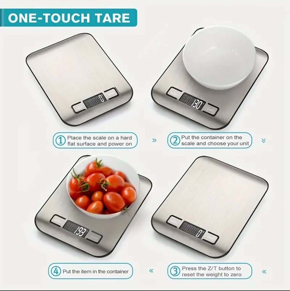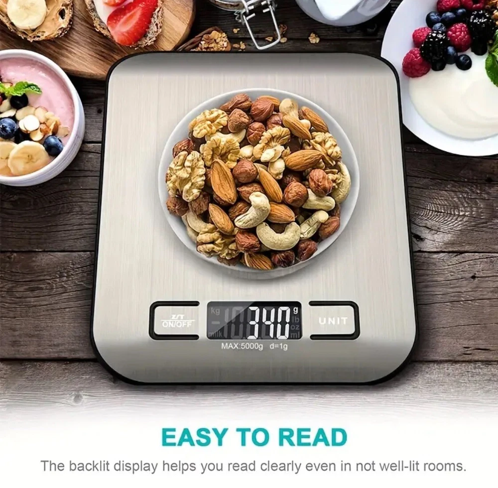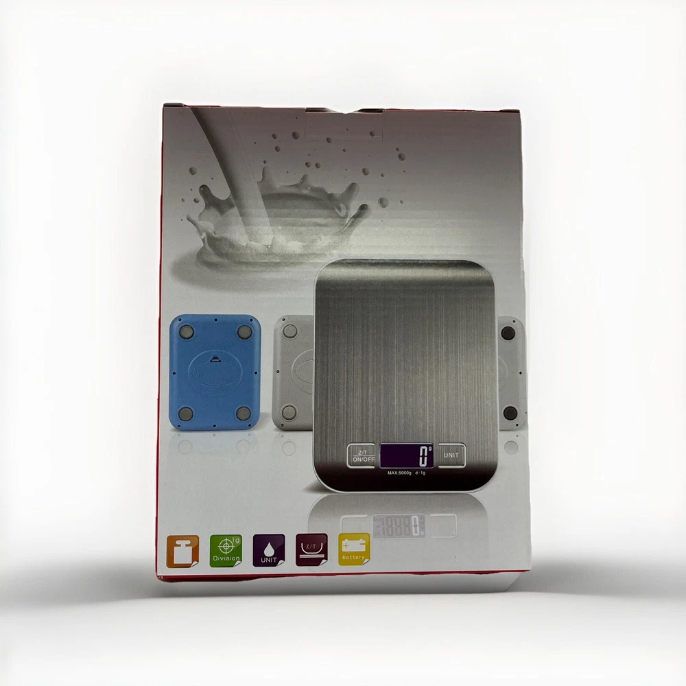 This digital kitchen scale is made of high-quality stainless steel and can weigh food or packages up to 11 pounds. It comes with 2 AAA batteries included and has a modern rectangular shape. The LCD display type makes it easy to read the weight in grams and ounces. This scale is perfect for measuring a variety of items such as pets, envelopes, jewellery, vegetables, medicines, packages, and fruits. It has a weight limit of 11 pounds and is light weight, making it easy to use and transport. The scale is also easy to clean and has a value of $0.01 per ounce. Get accurate measurements for your kitchen needs with this reliable and efficient digital scale. Features: Effortless Weighing: Supports 5 units (oz/lb:0z/fl'oz/g/mL), tare function for hassle-free operation Precise Results: Accurately weighs up to 5 kg/11 Ib with 1 g increments Simple & Compact: The small and sleek scale is a perfect fit for most kitchens, occupying little space and easily storable in cabinets Easy to Clean: Just wipe down the 304 food-grade stainless steel surfaces to keep clean LCD Display: Backlit LCD screen with large fonts for easy reading Item will ship either the same or next business day via USPS Ground Advantage. Please reach out if you have any further questions. Take care.