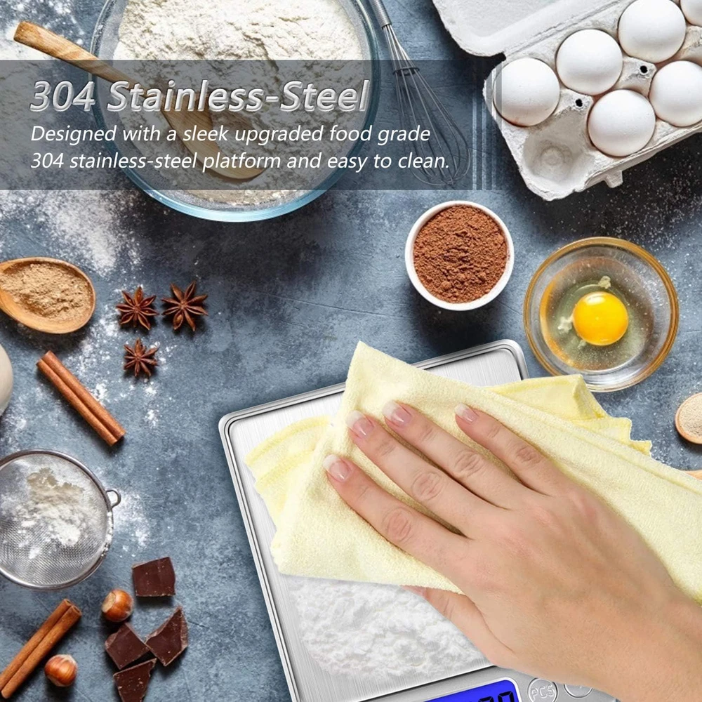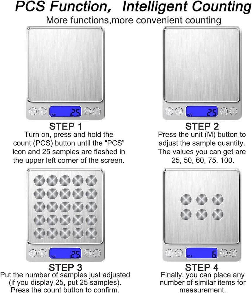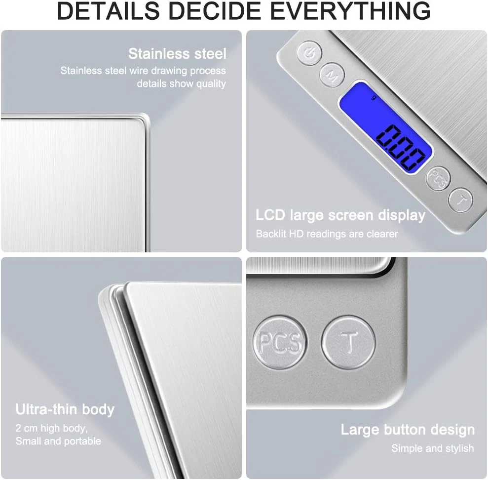 【High Precision, Wide Range】 The ultra-high accuracy sensor can achieve accurate readability of 0.01g and allows you to weigh a maximun capacity of 500g.(Recommended: weighing from 0.03g) It is very easy to clean and use, make it idealy to weighing such as yeast, valuables jewelry and diamonds that require high weighing accuracy 【Equipped with 2 Trays】One big and one small, you can use them to load things and then weigh them, avoid direct contacting between the weighing objects and the scale. When the product arrived, the small tray is placed on the scale surface, which protects the scale surface and the large tray covers the entire scale body 【Tare & PCS, Auto Power Off Function】After placing the container, press the T button to tare and get the net weight of the item being weighed. For items such as screws and needles, the PSC button can be used for counting. The M button can be used to switch units and set the automatic shutdown time, 60 seconds, 80 seconds, 120 seconds for options. And There is also a LCD backlight function to know the reading clearly at night. Besides, it can alert users for low battery power and overload 【6 Weighing Units, Multi Uses】g, oz, ozt, dwt, gn, ct A total of 6 units can be switched. The scale can be used to weigh ingredients such as ingredients, Chinese medicine, jewelry, diamonds, etc. Meet your demand of measuring different things 【Superior Quality, Easy to Carry】14*8.4*2.3 cm, only 200g weight. It can be used not only at home but also convenient to carry at any time. The Mini kitchen Scale is crafted to be strong, accurate, fast, and user-friendly. High-quality stainless steel platform with a smooth surface and tactile buttons for an elegant experience Product Description Attention-The correct way to use the scale! The correct way to use the scale: We will send yo two trays, the right way is to give it a positive direction when you use it. If you place the tray on the kitchen scale and it is covered upside down, Because the edge of the cover will be pressed against the scale body, the precise value cannot be read and cannot be correctly transmitted to the sensor, so the reading will be inaccurate and always floating. So please remove the small tray, the reading will be correct. Powerful Function Auto shut-off - Less power loss, longer service life Includes 2 AAA batteries Powerful Function Counting function - Suitable for small and heavy items Powerful Function High Accuracy - Can be accurate to 0.01g. 6 units (g, oz, ozt, pt, gn, ct) Powerful Function Comes with 2 trays-Protection and weighing Tare function - Convenient to weigh with the container Diyife Pocket Scale - You can easily carry it in your hand bag Specifications: Material: Stainless Steel Color: Silver Precision: 0.01g Maximum capacity: 500g Product Dimensions: 16 x 13 x 3.5 cm NW: 200g (includes 2 AAA batteries) Auto Off: 60, 120, 180seconds (can be set) Weighing Units: g, oz, ozt, dwt, gn, ct Package Included: 1 x Digital Pocket Scale 1 x Big Tray 1 x Small Tray 2 x 1.5V AAA Batteries 1 x User Manual Note: There's a blue protective film on the scale surface, tear it before using. Place the scale on a windless horizontal hard platform. The readings of this high-precision scale are easily affected by wind. Please ensure that there is no wind and no extra vibration while using. Do not put the product in water or clean it with corrosive chemicals.