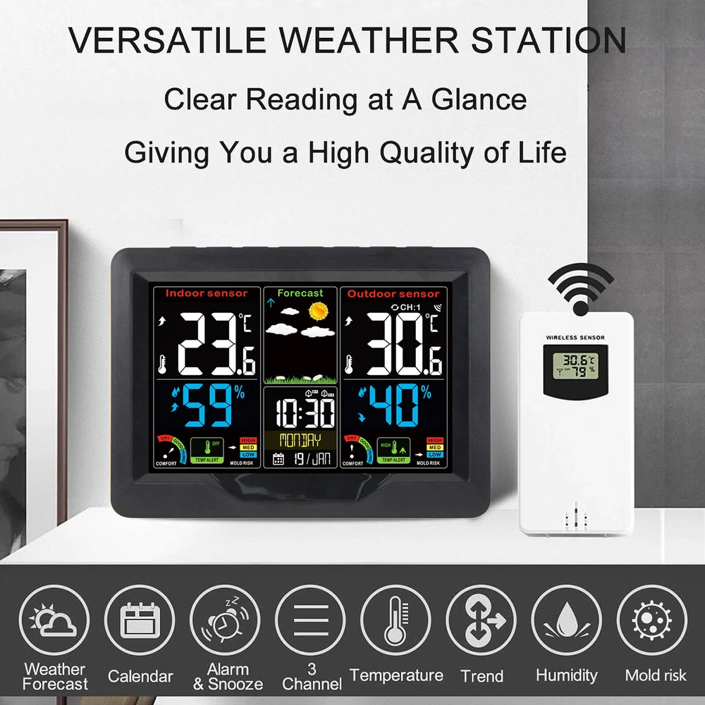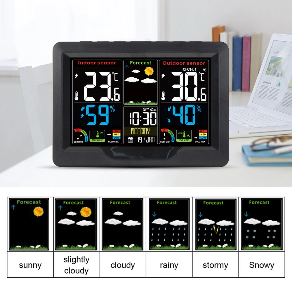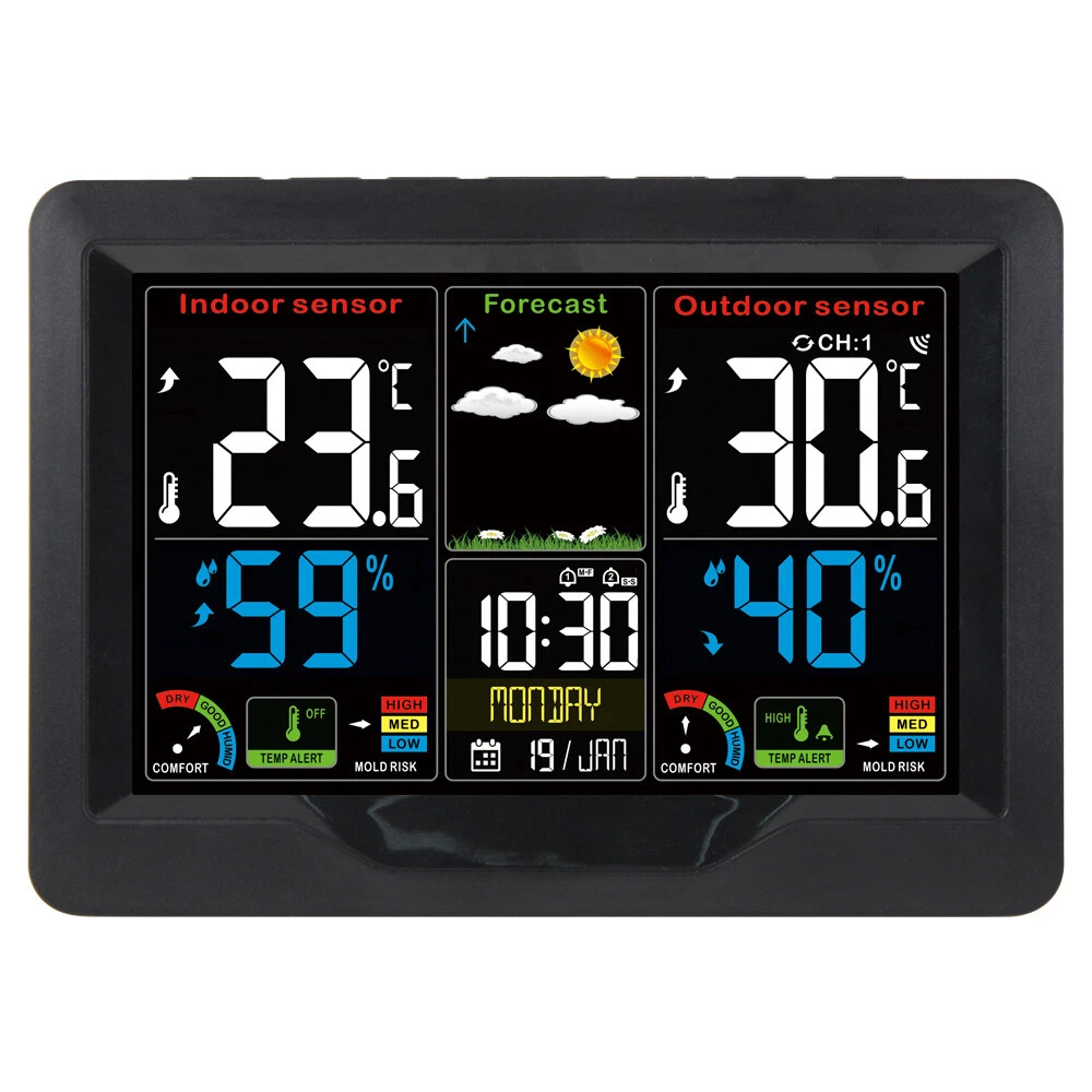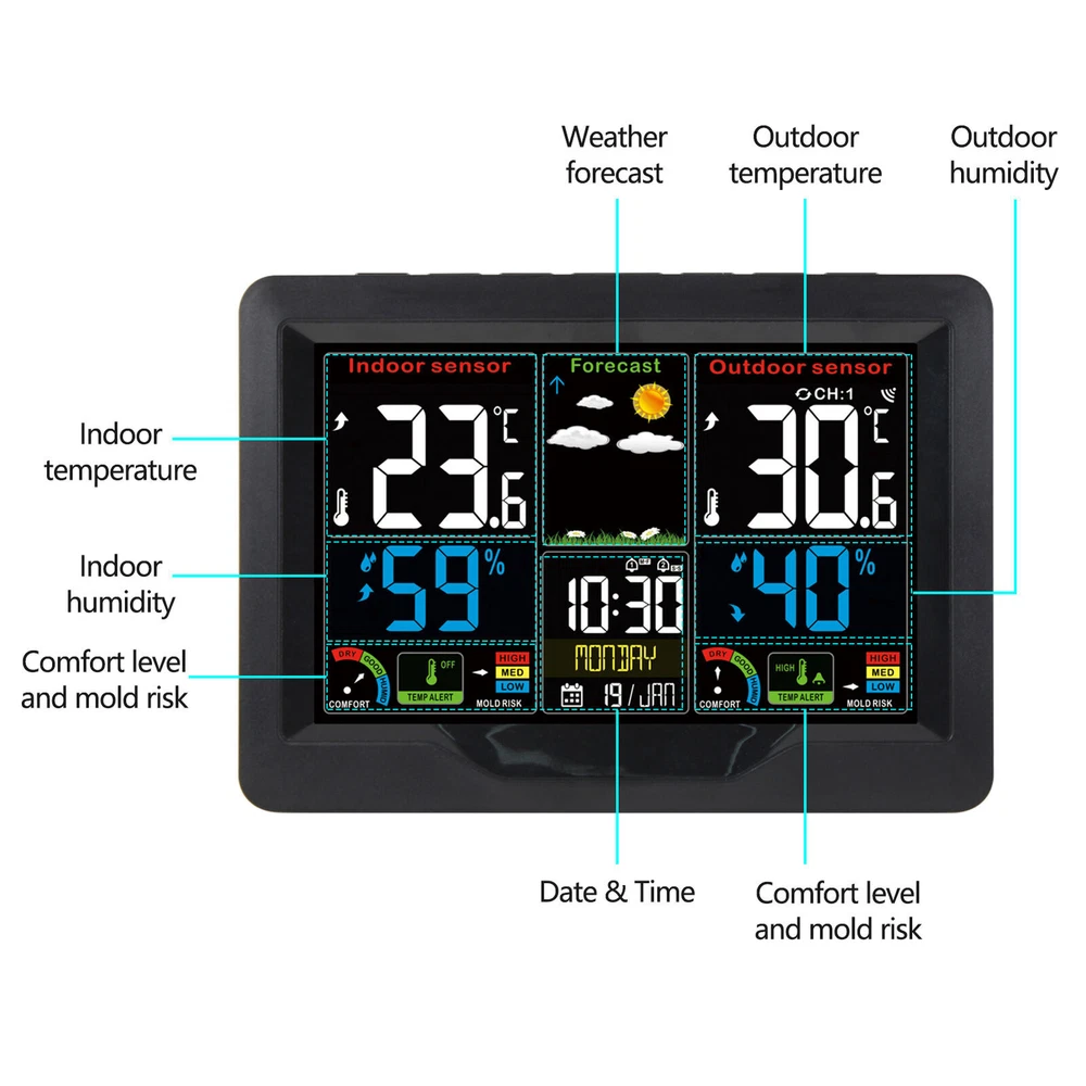 Product Description: Features : Multifunctional Weather Station : Adopt large LCD color screen to display rich information: Indoor/outdoor temperature and humidity, customized temperature (hi/lo) alert, time/date/week, dual alarm clock/snooze(extra 5-minute sleep), vivid weather forecast, mold risk and comfort level. RF Function: Comes with an outdoor transmitter, which adopts advanced RF sensor technology to collect data precisely and transmit quickly to indoor receiver. 60 meters transmission range in an open area. Waterproof level IPX4. Tendency Chart & Weather Icon Display: The weather station can show the tendency and record the maximum and minimum values of indoor & outdoor temperature, forecast weather in 12 hours and provides 6 weather icons display. Dual Alarm & Snooze: Supports two alarm clocks setting and snooze function with the snooze time programmable from 5 to 60 mins, practical and useful. Mold Risk & Frost Point Alarm: Able to detect mold risk and display in 3 levels; when the temperature is lower than the preset value, the clock will prompt an alarm. Practical and Aesthetic: Simple design can fit any home decor, function-rich clock serves multiple purposes. Specifications: Material: ABS C olor: Black Power supply(Clock): 2 * 1.5V AA batteries(Not included) / USB P ower supply(Transmitter): 2 * 1.5V AA batteries(Not included) F unction: Time / Calendar / Temperature / Humidity / Dual Alarm Clock / Snooze / Backlight / RF / Weather forecast / Mold Risk Indicator / Frost Point Alarm Indoor Temperature range: 0℃ ~ 50℃(32℉~122℉) Outdoor Temperature range: -20℃~70℃ (-4℉~+158℉) Temperature resolution: 0.1 ℃ & ℉ Indoor Humidity Range: 20% ~ 95%RH Outdoor Humidity Range: 20% ~ 95%RH Humidity resolution: 1%RH Max. RF Channel: 3 7 Week Language: English, German, Italian, French, Spanish, Dutch, Danish Alarm Clock: 2 Snooze: 5~60 mins I ndoor Comfort level display: 3 levels Indoor Mold Risk display: 3 levels 6 Kinds Weather Display: Sunny/Cloudy/Slightly Cloudy/Rainy/Stormy/Snowy Alert: Over Temperature and Frost Alarm Temperature Record: Max./Min. Item Size: 16*11.6*3cm / 6.29 * 4.56 * 1.18in Item Weight: 216g / 7.61oz Package Weight: 413g / 14.56oz Package Size: 17*6.5*12.8cm / 6.69 * 2.55 * 5.03in Package Include: 1 * Clock 1 * Transmitter 1 * USB cord 1 * User Manual (E nglish)