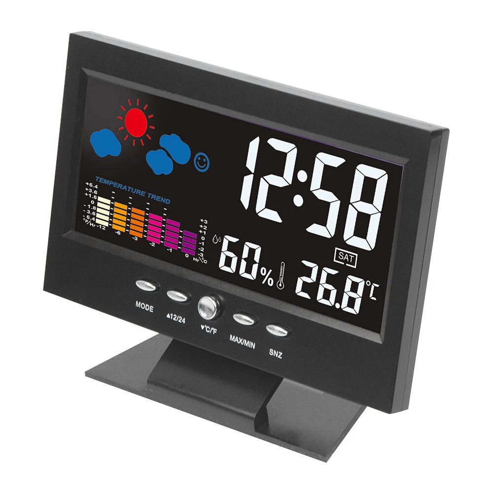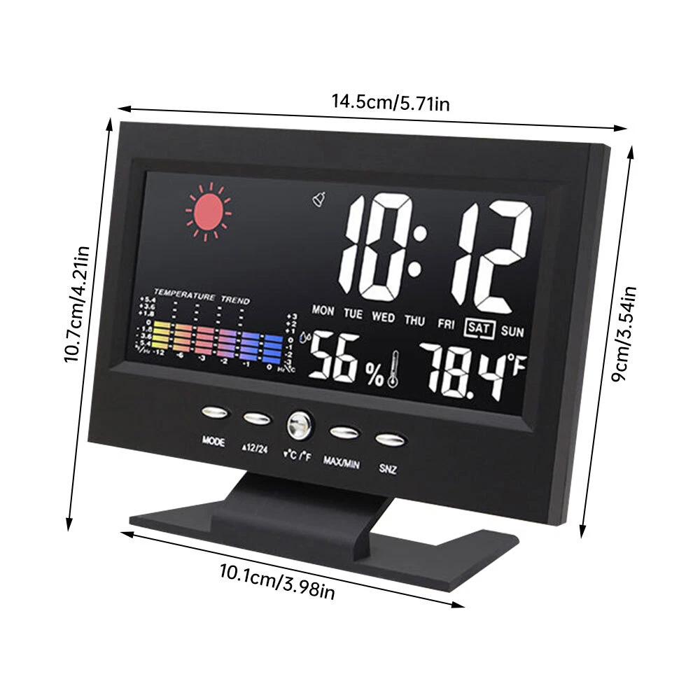 Description: 1. Clock display, 12/24 hours can be switched. 2. It can display time, weather, temperature, humidity, day of the week, temperature trend. 3. With alarm clock, snooze function, weather display, temperature trend indication, very practical. 4. Voice-activated backlight, energy-saving and convenient. You can turn off the voice-activated function through the switch on the back of the product. 5. Powered by 2 x 1.5V AAA batteries (not included). Specification: Material: ABS Color: Black Screen size: 107*58mm Temperature measurement range: -10-61°C / 14.2-140°F Humidity Measurement Range: 20%-99 Power supply: 2 * 1.5V AAA batteries (not included) Packing list: 1x Alarm clock (without battery) 1x USB charging cable Note: 1. When this product is powered by batteries, the screen backlight will not be always on (carbon batteries are recommended, please do not use high-power alkaline batteries) 2.When this product uses USB power supply, the screen will be always lit.