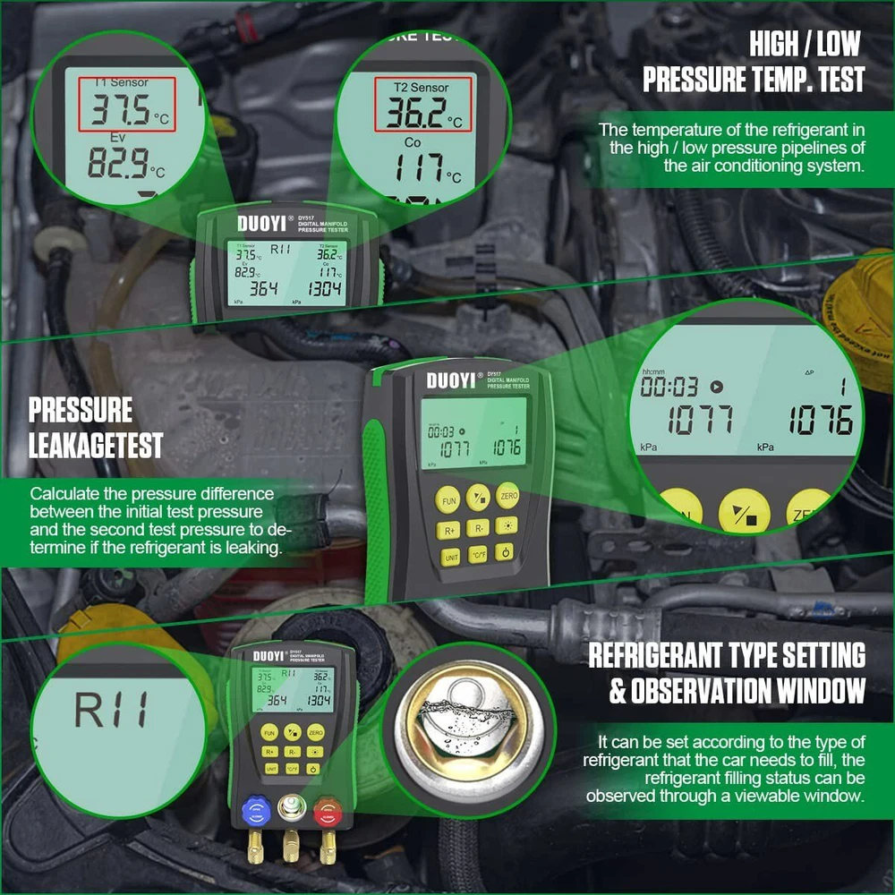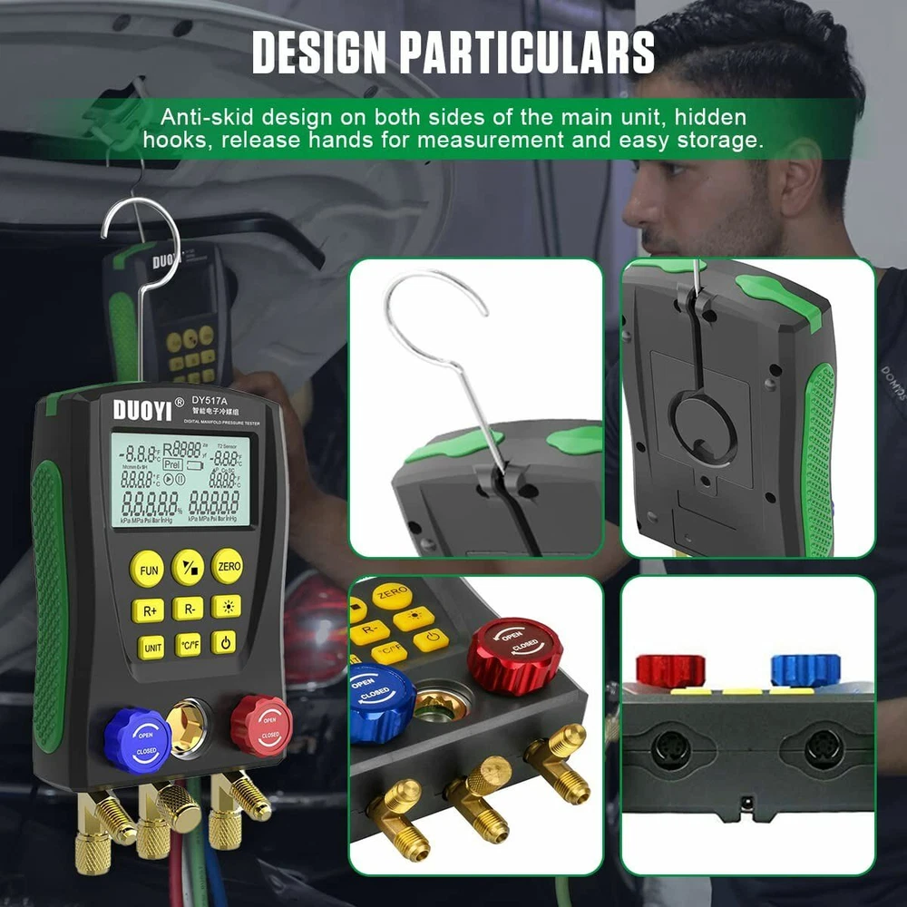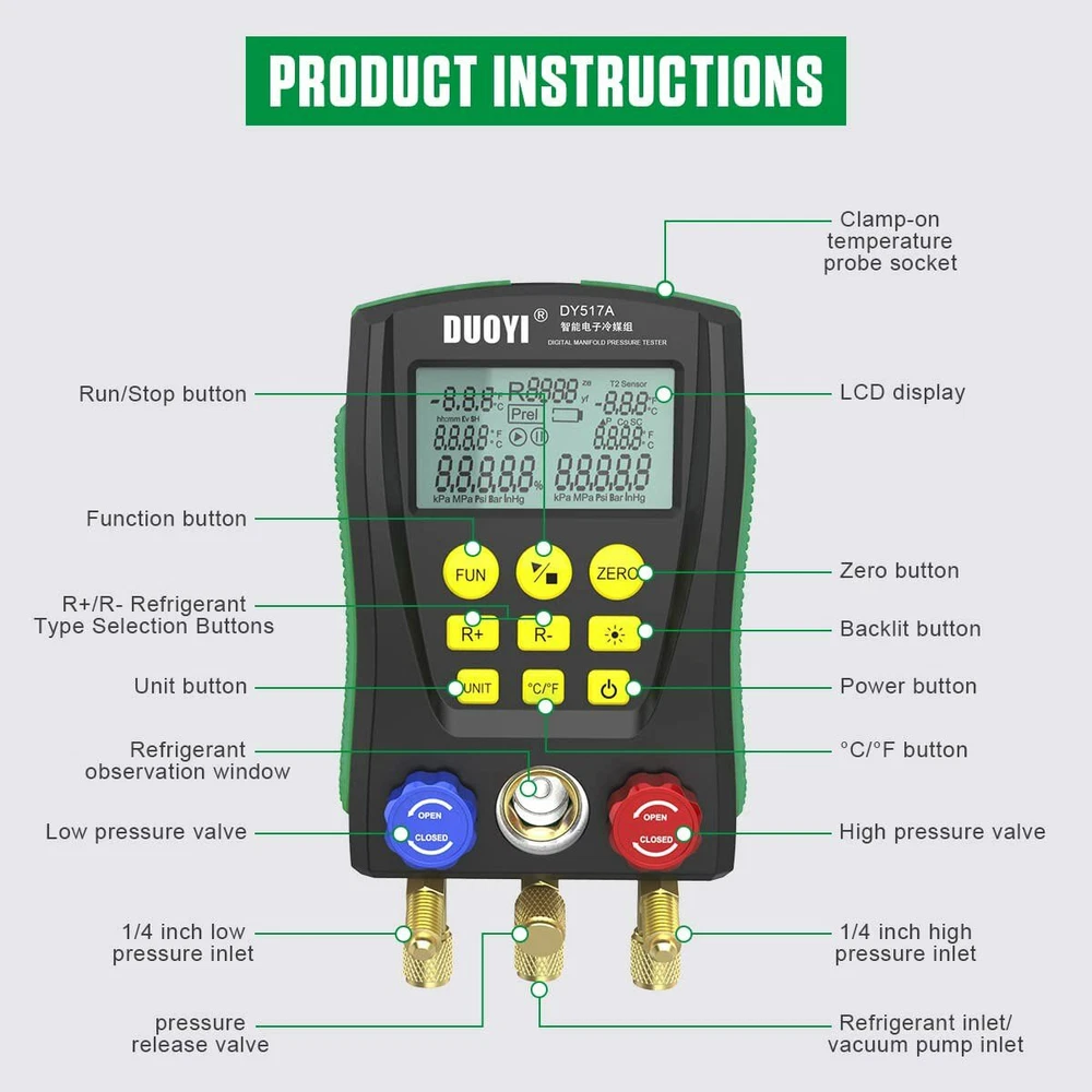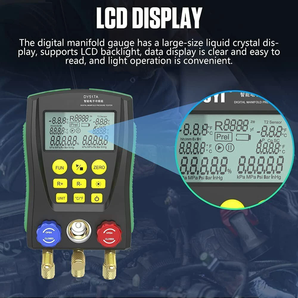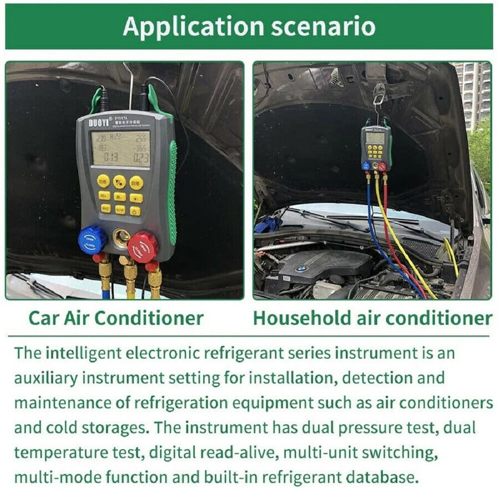 The intelligent electronic refrigerant group instrument is an auxiliary instrument for the installation, testing and maintenance of refrigeration equipment such as air conditioners, fridge and cold storage. Feature: Double pressure test, double temperature test Digital reading, multi-unit switching Large-size LCD display, LCD backlight support Calculate the degree of subcooling and superheating Test the percentage of vacuum measurement; pressure leak measurement, leak time speed record Long-life valve switch, 1/4 inch standard interface design Built-in 32-bit digital processing unit and high-precision data acquisition unit Built-in 89 kinds of refrigerant pressure-evaporation temperature database Pressure Leakage Test Calculate the pressure difference between the initial test pressure and the second test pressure to determine if the refrigerant is leaking. High/Low Pressure Temp Test This Manifold gauge can measure the temperature of the refrigerant in the high/low pressure pipelines of the air conditioning system. Evaporation Pressure & Temp Test The maximum pressure when the refrigerant changes from liquid to gas.The lowest temperature when the liquid becomes gaseous. High-Precision Data Unit Built-in 32-bit digital processing unit and high-precision data acquisition unit, high data and stability. Visual Window & LCD Display The charging status of refrigerant can be directly observed through the refrigeration gauges window. Large-size liquid crystal display, LCD backlight support, data display clear and easy to read. Applicable Scene This digital manifold gauge is an auxiliary instrument for the installation, testing and maintenance of refrigeration equipment such as air conditioners, fridge and cold storage. Compatible with 89 Kinds of Refrigerants: R11 R113 R114 R115 R116 R12 R123 R124 R125 R1270 R13 R134A R14 R141B R142B R143A R152A R170 R21 R218 R22 R227EA R23 R236EA R245CA R245FA R290 R32 R401A R401B R401C R402A R402B R403A R403B R404A R405A R406A R407A R407B R407C R407D R407E R408A R409A R41 R410A R410B R411A R411B R412A R413A R414A R414B R415A R415B R416A R417A R418A R419A R420A R421A R421B R422A R422B R422C R422D R423A R424A R425A R426A R427A R428A R50 R500 R501 R502 R503 R504 R507A R508A R508B R509A R600 R600A R717 R744(Co2) R1234 Note: This pressure guage will read random numbers when it is powered on. You must press the ZERO key to clear the numbers after you power it on, and then you can use it normally. Specification: Pressure test: gauge pressure Pressure test unit: Kpa; Mpa; bar; inHg; PSI. Pressure test range: 0 Kpa – 6000 Kpa Pressure test resolution: 1 Kpa Pressure test accuracy: +/- 0.5 %(FS)+ 5dgt Pressure overload limit: 10000 Kpa (10 Mpa; 100 bar;) Vacuum test: relative vacuum Vacuum test unit: Kpa; Mpa; bar; inHg; PSI. Vacuum test range: -101 Kpa – 0 Kpa Vacuum test resolution: 1 Kpa Temperature test unit: °C (Celsius), °F (Fahrenheit) Temperature test range: -40°C–150°C (-40°F–302°F) Temperature test resolution: 0.1°C (-40°C–99.9°C), 1°C (100°C–150°C), 0.1°F (-40°F–99.9°F), 1°F (100°F–302°F) Temperature test accuracy: +/- 0.5 °C + 2dgt +/- 0.9 °F + 2dgt Package Include: 1x Digital Manifold Gauge 2x Temperature Clips 1x Red Refrigeration Charging Hose 1x Blue Charging Hose 1x Yellow Refrigeration Charging Hose 1X Suitcase 1x User Manual Power Supply: 4 X 1.5V (SIZE.AA / LR6) Battery not include