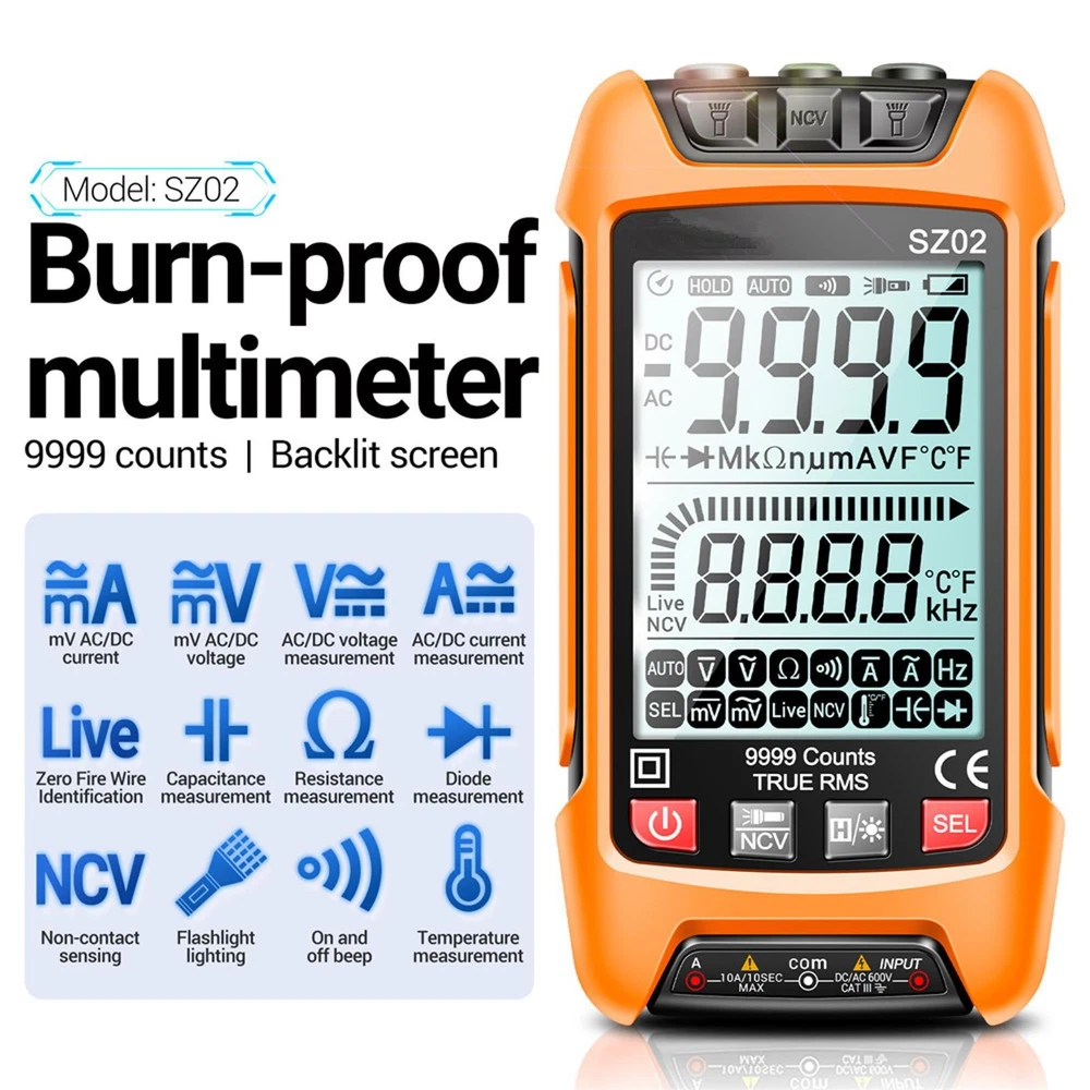 Product Description SZ02 Digital Multimeter Transistor Smart Testers 9999 Counts True RMS Auto Electrical Capacitance Meter Temp Resistance Transistor Tester Features: 1. Intelligent anti-burning 2. Automatic shutdown 3. Backlit screen display 4. NCV non-contact induction 5. Zero fire line identification Specifications: Model: SZ02 AC/DC current: 20mA-10A AC/DC voltage: 600.0mV-600.0V Resistance: 0Ω-99.99MΩ Hertz: 0Hz-1000Hz Capacitance: 0nF-99.99mF Battery: AAA batteries * 2 (shipped without batteries) Maximum count: 9999 counts Package includes: 1x Multimeter 1x Tester Cable 1x Temperature line Shipping Returns Contact Us Payment 1. Items sent from US warehouse. 2.Receiving time = Processing time + Shipping time 3. Processing Time: Around 1-2 business Days 4. Shipping Time: 3-5 business day it may have a little delay during some holiday (such as Christmas),any problem ,please feel free to contact 1. 30 days warranty from the purchased date. Please contact us via email before returning the defective item. 2.Our warranty does not extended to any product that are physically damaged or that are not under normal operating conditions as result of misuse or improper installation on the buyer/user's part. 3.Return items should include the original packaging and all accessories. buyers MUST contact us for the returning address. 4.In all cases, buyers pay shipping fees at their own cost to return products for exchange or refund. We will be responsible for the postage of replacements. Refund will be made upon receipt of the returned item. Pls contact us if you have any problems,we will try our best to solve for you We accept all verified payment from eBay. Shipping 1. Items sent from US warehouse. 2.Receiving time = Processing time + Shipping time 3. Processing Time: Around 1-2 business Days 4. Shipping Time: 3-5 business day it may have a little delay during some holiday (such as Christmas),any problem ,please feel free to contact Returns 1. 30 days warranty from the purchased date. Please contact us via email before returning the defective item. 2.Our warranty does not extended to any product that are physically damaged or that are not under normal operating conditions as result of misuse or improper installation on the buyer/user's part. 3.Return items should include the original packaging and all accessories. buyers MUST contact us for the returning address. 4.In all cases, buyers pay shipping fees at their own cost to return products for exchange or refund. We will be responsible for the postage of replacements. Refund will be made upon receipt of the returned item. Contact Us Pls contact us if you have any problems,we will try our best to solve for you Payment We accept all verified payment from eBay. powered by