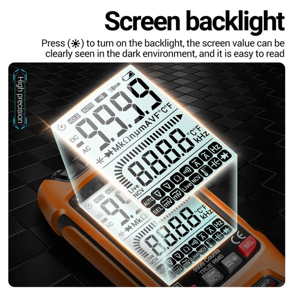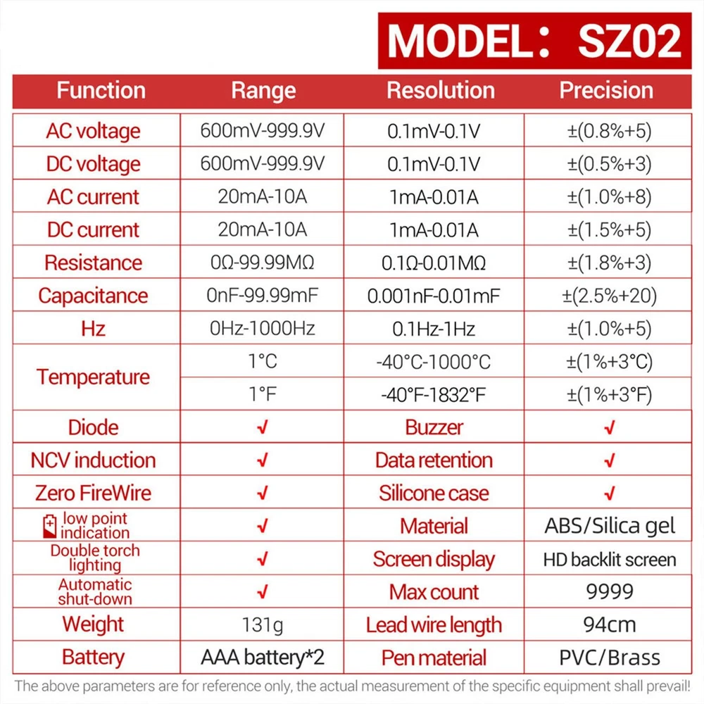 Product Description SZ02 Digital Multimeter Transistor Smart Testers 9999 Counts True RMS Auto Electrical Capacitance Meter Temp Resistance Transistor Tester Features: 1. Intelligent anti-burning 2. Automatic shutdown 3. Backlit screen display 4. NCV non-contact induction 5. Zero fire line identification Specifications: Model: SZ02 AC/DC current: 20mA-10A AC/DC voltage: 600.0mV-600.0V Resistance: 0Ω-99.99MΩ Hertz: 0Hz-1000Hz Capacitance: 0nF-99.99mF Battery: AAA batteries * 2 (shipped without batteries) Maximum count: 9999 counts Package includes: 1x Multimeter 1x Tester Cable 1x Temperature line Cancel Policy Shipping Policy Return Policy Customer Service 1. Before ordering, please check description carefully to make sure it fits! 2. Before ordering, please make sure the address is correct. 3. T he packing and shipping process would be SUPER FAST, orders can't be cancelled or revised Once Packing Starts! 1. We dispatch items the same working day if payment has been received before 2pm. 2. We dispatch items via eBay fulfillment. Fast and 100% assured! 1. Always believe that we could solve the issue directly for you through communication . 2. Free Returns, postage covered by the seller. 3. If a return is the last solution, the product must be the same as you receive, also should be within 30 days after received. 1. Please contact us bofore leave reviews or start disputes, we would solve the issue for you asap. 2. We would reply within 24 hours on working days, and within 48 hours on weekends/holidays. Cancel Policy 1. Before ordering, please check description carefully to make sure it fits! 2. Before ordering, please make sure the address is correct. 3. T he packing and shipping process would be SUPER FAST, orders can't be cancelled or revised Once Packing Starts! Shipping Policy 1. We dispatch items the same working day if payment has been received before 2pm. 2. We dispatch items via eBay fulfillment. Fast and 100% assured! Return Policy 1. Always believe that we could solve the issue directly for you through communication . 2. Free Returns, postage covered by the seller. 3. If a return is the last solution, the product must be the same as you receive, also should be within 30 days after received. Customer Service 1. Please contact us bofore leave reviews or start disputes, we would solve the issue for you asap. 2. We would reply within 24 hours on working days, and within 48 hours on weekends/holidays. powered by