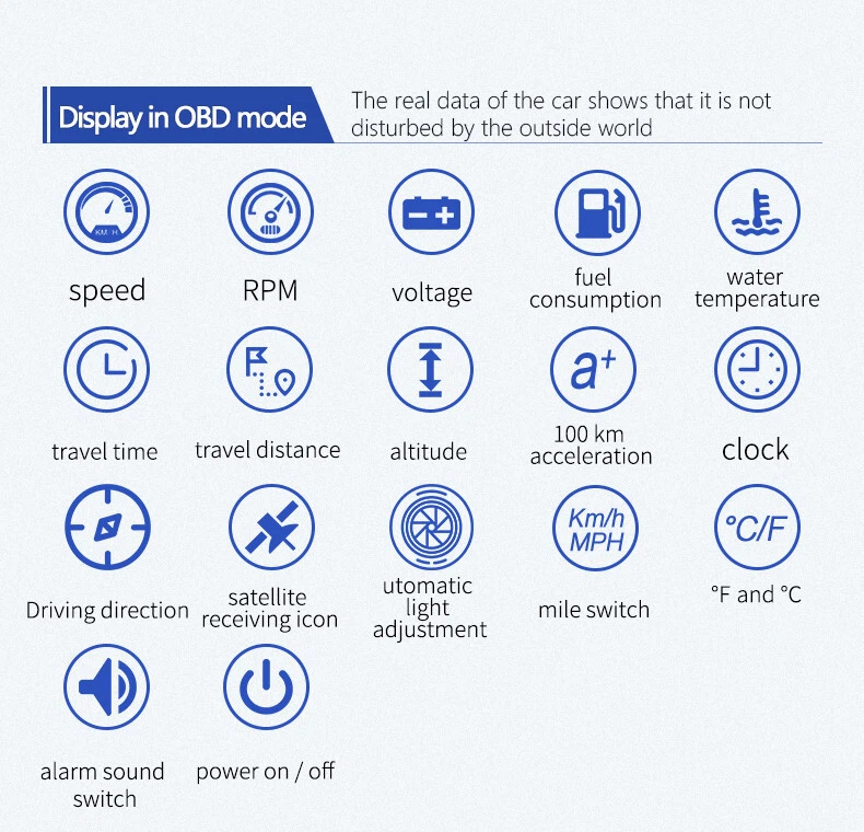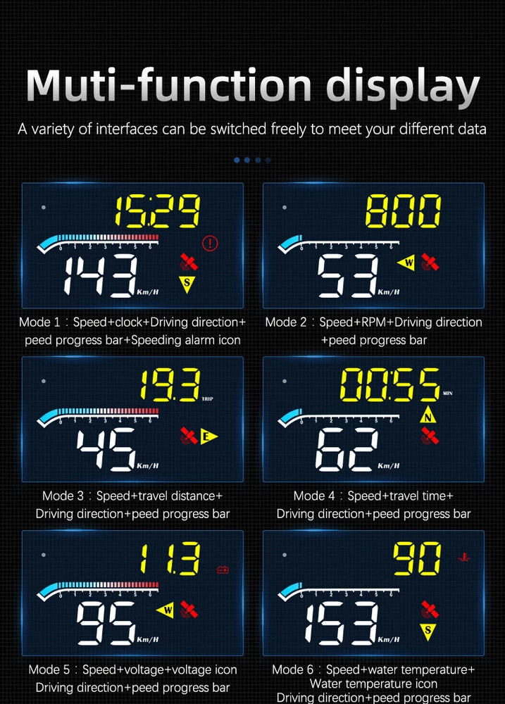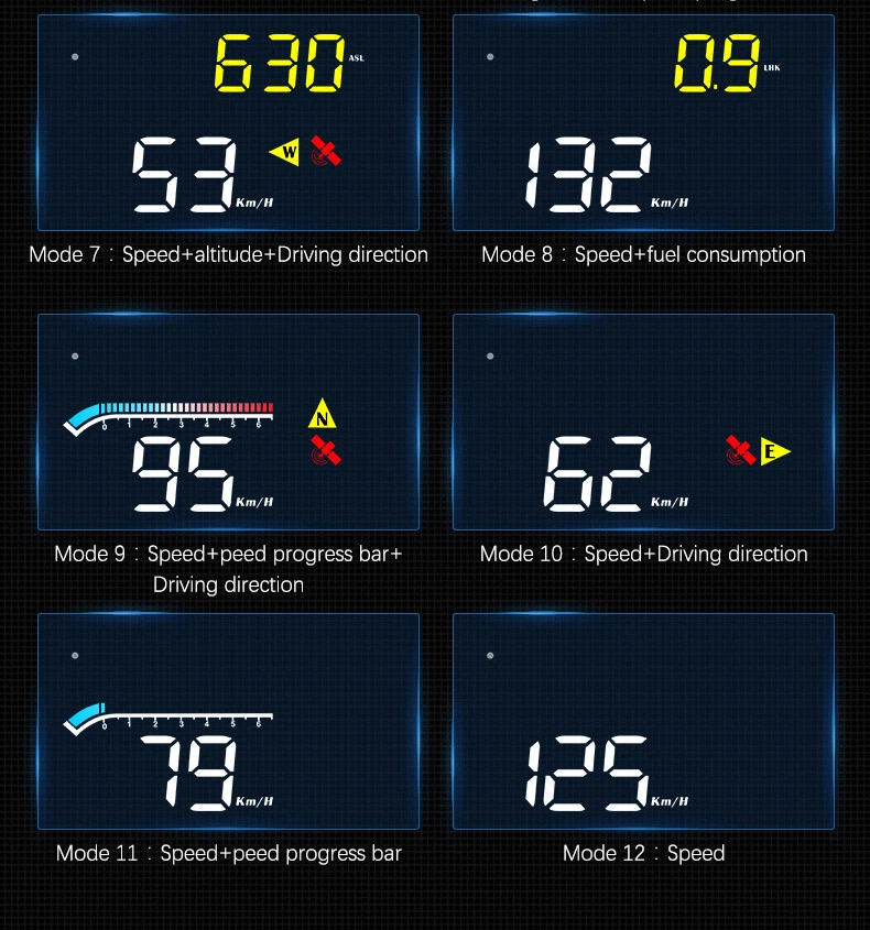 Product Description Multifunctional 3.5 Inch Car HUD Head-up Display OBD2 GPS Speedometer Overspeed Alarm Projection On Car Glass Description: HUD short for Head Up Display,the main function is to reflect the car dashboard information (e.g. speed,RPM,water temperature,voltage,trip distance etc) Main Function: OBD System (For OBD2 car) Functions:Vehicle speed,engine RPM,water temperature,voltage,fuel consumption,altitude,clock, travel time,travel distance,number of compass satellites. GPS System (For all car) Functions:Speed,Voltage,Compass,Number of Satellites,Speed Icon,Decorative bar Features: 1. The hood design, shields the excess light of the head-up display, and does not dazzle the eyes when driving at night. 2. 6 alarm modes: overspeed alarm, speed alarm, voltage alarm, water temperature alarm, fault code clearing, fatigue driving reminder. 3. Support two power supply modes: OBD Cable supply and USB Cable supply. 4. Automatically turn on/off, start and stop with the car, automatically adjust the brightness, 3.5-inch large screen. Specification: Color: Black Material: PC/ABS Size: 90*55*30mm(3.5-inch) Working voltage: 11V~18Vdc (12Vdc/200mA) Please use the USB cable if car voltage > 24V Package Included: 1*Car HUB Displayer 1*OBD2 Cable 1*USB Cable 1*Reflective film 1*English Manual 1*Sticker Note: This product is a dual system:Users can freely choose the mode(press the '+' key to select OBD or GPS system) before the OBD icon on screen stop to flash,it will automatically save and enter your last selected option. Payment Returns Contact Us Shipping We accept payment by PayPal only ! Payment should be completed within 5 days after buyer places the order,or else an unpaid case will be opened in order to cancel the transaction. If you can not pay in time, please contact us. e-check from PayPal will only be processed once the payment clears. All of the items will be shipped to buyer's EBAY address,please confirm your address on Ebay before you buy.Your order will be usually shipped out the same or next business days once the payment is made and cleared. 30-day Warranty with Exchange for defective, malfunctioned, incorrect or parts-missing items. Please notify us and return the item with all parts and accessories packed and marked "FOR EXCHANGE" within 14 days of receipt. If defective, malfunctioned or parts-missing items are no longer available, a refund may be issued. All returning postage costs will be the responsibility of the buyers under all circumstances. If you encounter any problems about anything, please feel free to contact us and we will do our best to assist you solve the issue. If you are not satisfied in anyway, please feel free to let us know and give us a second chance to correct it before you decide to leave any neutral or negative feedback. Please contact us through eBay link if you have any questions. We will reply you within 24- 48 hours. Please check you spam mail if no response for 48 hours. All items will be checked before packing. All items are new and of high quality. Item will be shipped within 1 business days upon receipt of payment, excluding weekends and public holidays. If to USA,we will ship your order by USPS,it will take about 8-12 working days to you,and you can track it on line. If to other country,we will ship your order by China Post or Singapore Registered Air Mail,it will take about 14-21 working days to you,you aslo can track it on line. Delivery time is about 14-28 business days and it may take up to 8 weeks . Payment We accept payment by PayPal only ! Payment should be completed within 7 days after buyer places the order,or else an unpaid case will be opened in order to cancel the transaction. If you can not pay in time, please contact us. eCHECK from PayPal will only be processed once the payment clears. All of the items will be shipped to buyer's EBAY address,please confirm your address on Ebay before you buy.Your order will be usually shipped out the same or next business days once the payment is made and cleared. Returns 30-day Warranty with Exchange for defective, malfunctioned, incorrect or parts-missing items. Please notify us and return the item with all parts and accessories packed and marked "FOR EXCHANGE" within 14 days of receipt. If defective, malfunctioned or parts-missing items are no longer available, a refund may be issued. All returning postage costs will be the responsibility of the buyers under all circumstances. Contact Us If you encounter any problems about anything, please feel free to contact us and we will do our best to assist you solve the issue. If you are not satisfied in anyway, please feel free to let us know and give us a second chance to correct it before you decide to leave any neutral or negative feedback. Please contact us through eBay link if you have any questions. We will reply you within 24- 48 hours. Please check you spam mail if no response for 48 hours. Shipping All items will be checked before packing. All items are new and of high quality. Item will be shipped within 1 business days upon receipt of payment, excluding weekends and public holidays. If to USA,we will ship your order by USPS,it will take about 7-10 working days to you,and you can track it on line. If to other country,we will ship your order by China Post or Singapore Registered Air Mail,it will take about 14-21 working days to you,you aslo can track it on line. Delivery time is about 14-28 business days and it may take up to 8 weeks . Welcome to our Store ~