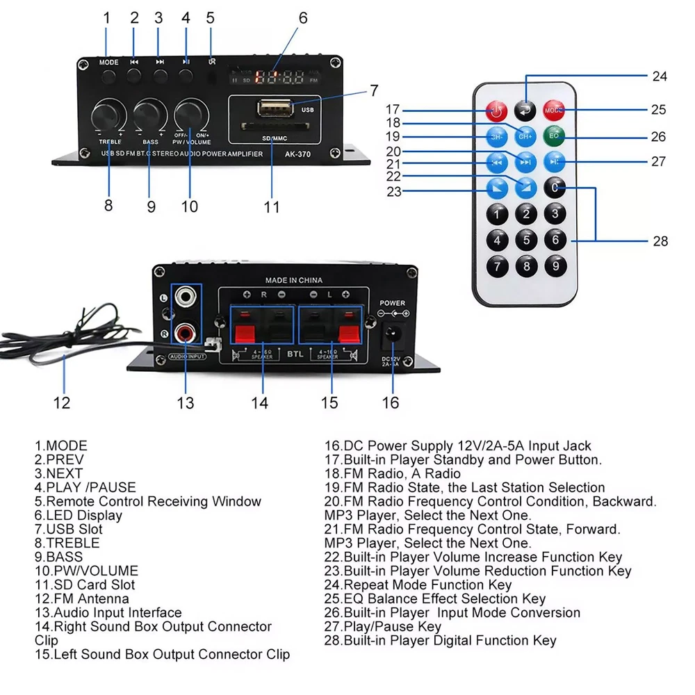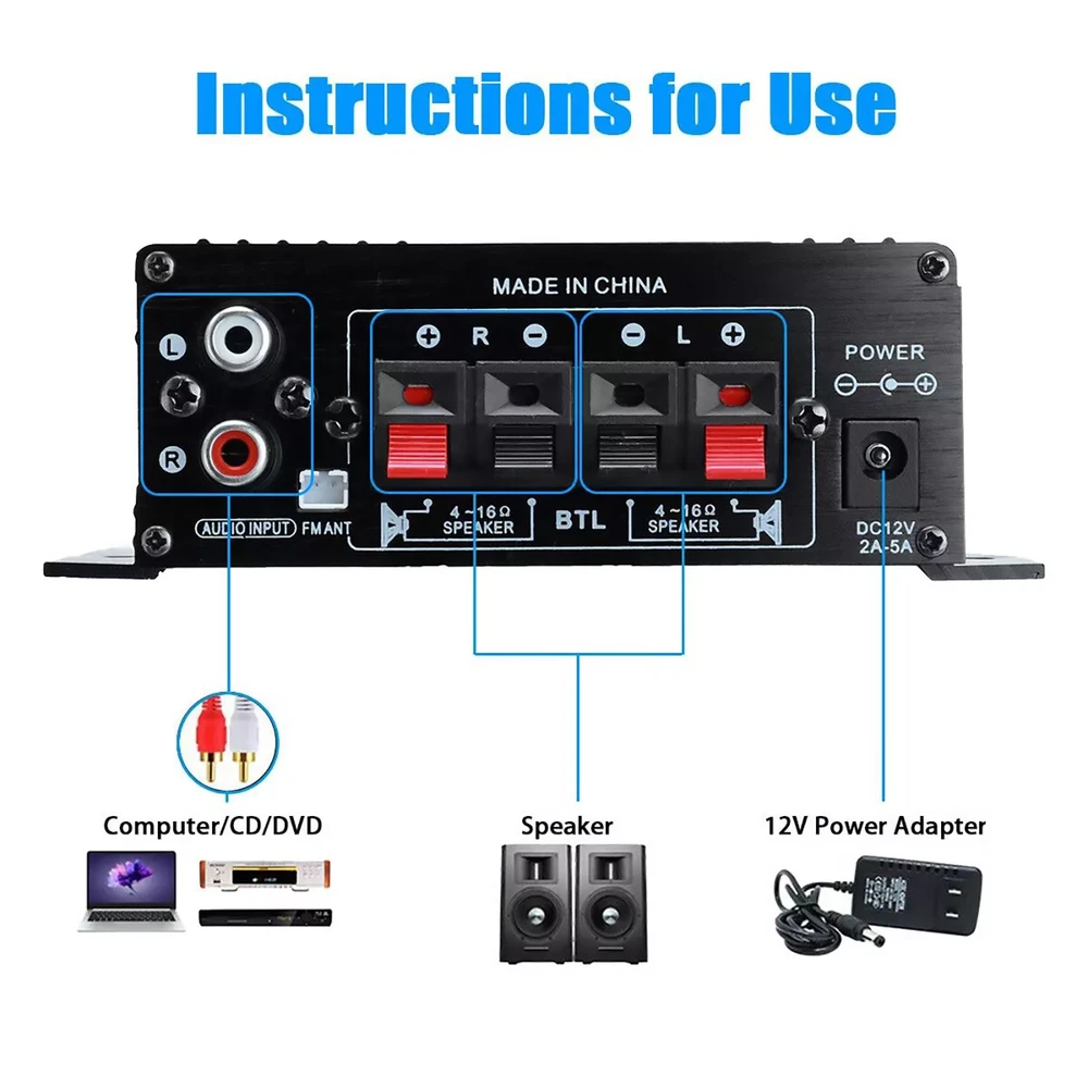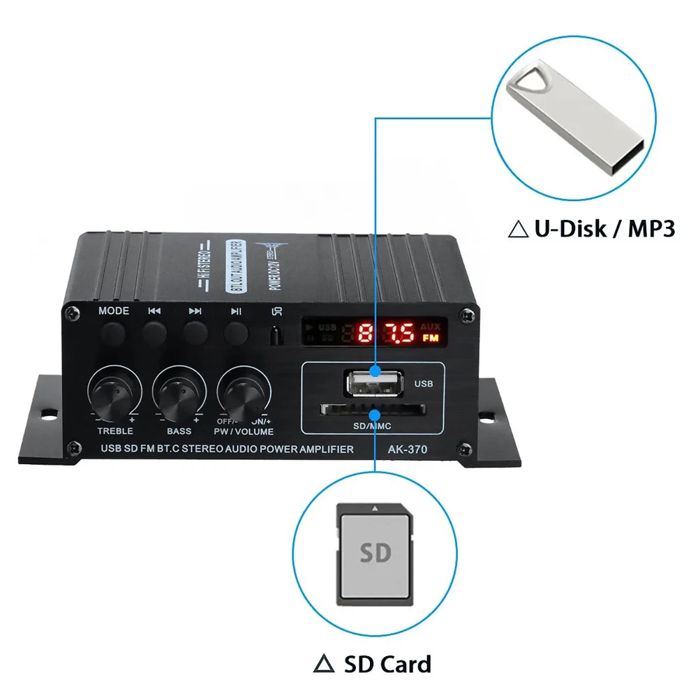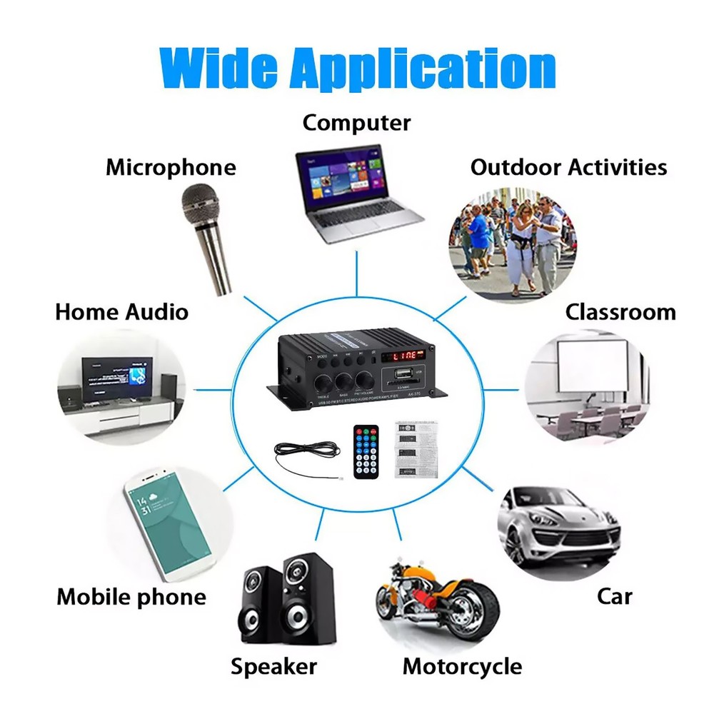 SAFE & SECURE SHOPPING 100% SATISFACTION GUARANTEED FAST SHIPPING Store Categories Store Categories Other DJI & RC Parts Game & Arcades Parts Watch Tools & Parts Auto Parts Headphone Parts Musical Parts Health & Beauty Home & Garden Toys Electronics B & I Military Models Office Suplies Outdoor & Sport You may also like You may also like High Accuracy Quartz Chronograph Watch Wrist Movement VK63A For VK SERIES 35.09 USD 38.99 USD 19.99 USD 10% off 28 in 1 Game Card Case Holder Cartridge Box For Nintendo DS 3DS XL LL DSi MT I 8.81 USD 9.79 USD 19.99 USD 10% off 10Pack Handmade Wooden Fingerboards Lot Tech Deck 30mm x 100mm Maple Wood Board 14.48 USD 16.09 USD 19.99 USD 10% off DIY FM Radio Kit 87-108MHz Electronic Soldering Practice Project for Beginners 15.02 USD 16.69 USD 19.99 USD 10% off Aluminum Alloy Panel Line Accent Pen+ Extra Nib Model Tool For DSPIAE & Gundam 14.12 USD 15.69 USD 19.99 USD 10% off 2pcs VHF/UHF/AM/FM 7 Sections BNC Connector Telescopic Antenna For Radio 9.89 USD 10.99 USD 19.99 USD 10% off Digital Power Amplifier Bluetooth Stereo HiFi Audio 2Channel USB FM Home Product Description Features: Mini HIFI digital bluetooth audio power amplifier. Aluminum alloy body, durable, the body is made of aluminum alloy once, the anode surface treatment, the overall atmospheres, thick, feel is also very good. Suitable for SD Card, U disk, AUX input, MP3 format play, support bluetooth wireless connection. Supports FM stereo radio. Low distortion supplies a clearer, stronger and more powerful sound. With Remote control function. Two main channel output. The machine supports bluetooth operation, and supports line input. Specifications: Model: AK370 Color: Balck Material: Aluminum Alloy Size: 125X75X40MM Bluetooth: Support Input voltage: DC 12V 2A-5A / AC 220V RMS power: 20W+20W Max power: 200W+200W Channel: 2CH Load impedance: 4-16Ω SNR: >90 db Frequency: 20Hz-20KHz Distortion rate: 0.01% Notice: If it is used in a car (12V voltage), please use the car cigarette lighter power supply. Connecting to the car battery will cause noise. If it is used in a truck (24V voltage), you need to use a step-down device to reduce the voltage to 12V before it can be used. Otherwise, the power amplifier will be burned out. If it is for household use, please use a 12V 2A power adapter. Package Included: 1 x Power Amplifier (Not Included Power Adapter) 1 x Remote Control 1 x Antenna 1 x Manual Shipping Returns Contact Us Payment Shipping 1. Items sent from US warehouse. 2.Receiving time = Processing time + Shipping time 3. Processing Time: Around 1-2 business Days 4. Shipping Time: 3-5 business day it may have a little delay during some holiday (such as Christmas),any problem ,please feel free to contact Returns 1. 30 days warranty from the purchased date. Please contact us via email before returning the defective item. 2.Our warranty does not extended to any product that are physically damaged or that are not under normal operating conditions as result of misuse or improper installation on the buyer/user's part. 3.Return items should include the original packaging and all accessories. buyers MUST contact us for the returning address. 4.In all cases, buyers pay shipping fees at their own cost to return products for exchange or refund. We will be responsible for the postage of replacements. Refund will be made upon receipt of the returned item. Contact Us Pls contact us if you have any problems,we will try our best to solve for you Payment We accept all verified payment from eBay. Copyright © 2022 Tongtool