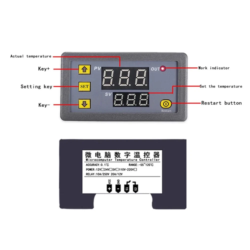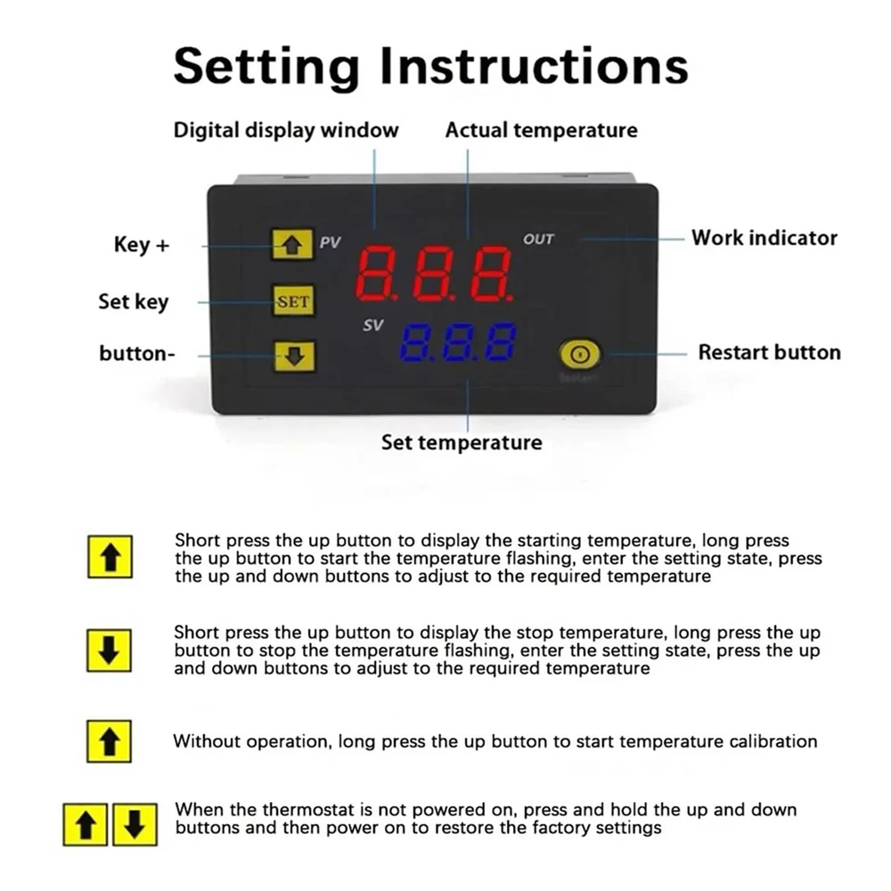 Digital Temperature Controller LED Display Electronic Control Board Temp upgrade Bullet Points: Multiple Modes: With multi-mode work capability, this digital temperature controller is perfect for timing, cycling, and looping. Additionally, it saves your adjustments after 6 seconds, ensuring efficient and accurate temperature regulation Effortlessly Manage Temperatures: Achieve precise temperature control effortlessly with this digital temperature controller. Its button setting and four-terminal wiring make it easy to use, and the small dimensions of 79x42x26mm ensure convenient installation. Advanced Timing and Control: Take advantage of our digital temperature controller's advanced timing and control capabilities, featuring two timing times with a time range of 1 second to 998 hours, and six working modes to choose from. Perfectly tailored for enhanced performance in a range of applications Double Monitoring Screen: Equipped with an onboard double green-red LED display module and responsive tactile button, this digital temperature controller provides precise monitoring Three Timing Modes: Set your customized timing mode in seconds 0-998s, minutes 0-998min, or hours 0-998h with the digital temperature controller's P0—0:T 1 timing second, P0—1:T 1 timing minute, and P0—2:T 1 timing hour settings Upgrade your thermostat game with our digital thermostat control board! Featuring a double LED display and button setting for ease of use. Wait 6 seconds after setting the data for optimal results. Can be used in various applications to meet different needs. Specification: Product name: Digital Temperature Controller Temperature control range: -50-120°C Resolution: 0.1°C at -9.9-99.9, 1°C at other temperature ranges Temperature measurement accuracy: 0.1°C Control accuracy: 0.1°C Hysteresis accuracy: 0.1°C Refresh rate: 0.5s Input powering supply: DC 12V Measurement input: 10K 0.5% Waterproof sensor Output: 1 relay output, 12 20A, 220V 10A Environmental requirements: - 10-60°C humidity 20%-85% Product size: about 7.9x4.3x2.6cm/3.11x1.69x1.02 inches Packing List: 1 x Digital Temperature Controller Note: Due to different lighting and screen settings, the item color may be slightly different from the picture. Due to different manual measurements, please allow a 1-2cm difference in size. 1.You can make a Credit payment via Paypal.Paypal will let you use MasterCard,Visa to pay. 2.Payment should be completed within 5 days after auction closed, or unpaid dispute will be filed for an closing auction.An unpaid case will be filled after 4 days. ● We strive for 100% customer satisfaction ! ● Positive Feedback is very important to us. ● We hope that you contact us immediately BEFORE you give us neutral or negative feedback, so that we can satisfactorily address your concerns. ● We promise to offer the lowest price and high quality produce. Dear buyers : ● Welcome to my store ! ● Your satisfaction is our top goal,we appreciate your patronizing. ● If you have any questions, please contact us before leave negative or neutral feedback, we will try our best to solve the issue to your satisfaction, thanks ! ● If you are satisfied with our service, please rate the details of the transaction (Detailed Seller Ratings) on eBay. ● Please always talk to us via ebay Message. ● We appreciate your business and look forward to growing our e-Bay sales with satisfied customers.