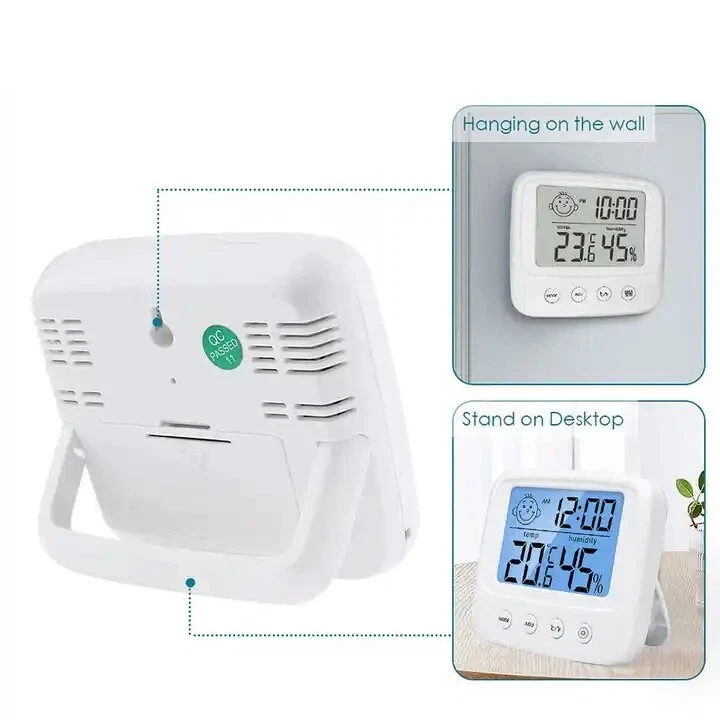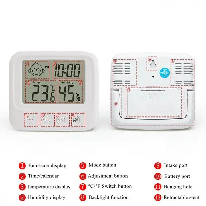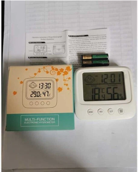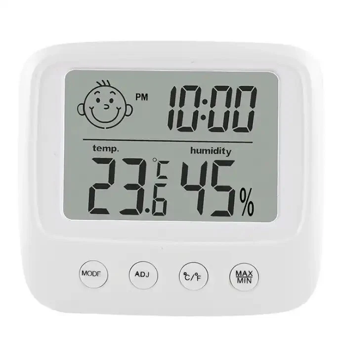 LCD Digital Temperature Humidity Meter Home Indoor Electronic Hygrometer Thermometer Baby Room E0828 Product Description Description: This thermometer hygrometer can display temperature and humidity in real time. This digital thermometer hygrometer is accurate and the temperature range is -50℃ to 70℃, humidity range is 10% to 99%. This digital thermometer hygrometer features a cartoon indicator to show comfort. This room temperature humidity meter allows you to switch between two units: ℃ or ℉. This digital thermometer has 3 buttons that make you can easily set the time and mode. Specifications: Color: White. Material: ABS. Temperature measurement range: -50℃ to 70℃. Humidity measurement range: 10% to 99% (RH). Temperature measurement accuracy: 1℃. Humidity measurement accuracy: 5%RH. Temperature measurement error: ±1℃. Humidity measurement error: ±5%RH. Temperature resolution: 0.1℃. Power supply: 1.5V AAA Battery.(Not included) Size: 82x78x21mm. Note: There might be a bit color distortions due to different computer resolutions. There might be a slight errors due to different hand measurement. Package included: 1x Electronic digital thermometer. Temperature range: -50 ~ +70℃ (-58 ~ +158 ℉) Humidity range: 10% -99% RH (relative humidity) Temperature resolution: 0.1 ℃ (0.2 ℉) Accuracy: ± 1 ℃ (1.8 ℉) Resolution: 1% RH Humidity Accuracy: ± 5% RH (40% -80%) Power Supply: 1 x 1.5V (AAA type) (included)