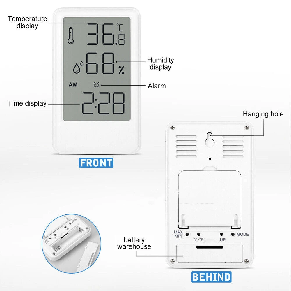 Wooden Thermometer Indoor Outdoor Glass Wall Hanging Room Sensor 13.55 USD Free shipping Indoor Outdoor Jumbo Thermometer Temperature Wall Hanging Room Sensor 7.65 USD Free shipping 2Pcs Wall Thermometer Indoor Outdoor Mount Garden Greenhouse Home Humidity Meter 7.1 USD Free shipping Outdoor Thermometer Garden Patio Outside Wall Greenhouse Sun Terrace 13.25 USD Free shipping Product Description Description: 100% Brand New Large LCD display simultaneously showing indoor & outdoor temperature and indoor humidity. Clear display, simple and easy to read. Temperature units °C/°F changeable. Records MAX/MIN temperature and humidity. Has a back stand and hanging hole on the back. Application: Widely used in your office, living room, kitchen, baby room, Wine Cellar etc. Function Introduction: Clock function Month/Date viewing function Temperature and humidity display Check the maximum and minimum temperature and humidity values Alarm clock function Specification: Two Clock style: 12/24 hour digital clock Temperature measurement range: -50~70°C Temperature measurement precision: ±0.1° (0.2°) Humidity measurement range: 10%RH-99%RH Humidity measurement precision: ±5%RH Battery: 1* AAA battery 1.5V (Not Included) In the Package: 1x Home thermometer (Not Included battery) 1x Manual Payment Shipping Terms Returns Contact Us Policies 1.We accept PayPal only. 2.All major credit cards are accepted through secure payment processor PayPal. 3.Payment must be received within 7 business days of auction closing. 4.We ship to your eBay or Paypal address. Please make sure your eBay and Paypal address is correct before you pay. Feedback will be left automatically after we receive your feedback. Please contact us before leaving a Negative feedback or Neutral feedback. We would try our best to help you solving any problem. 1.We ship to your eBay or Paypal address. Please make sure your eBay and Paypal address is correct before you pay. 2.Items will be shipped within 1-3 business day when we received payment. 3.Delivery time depends on destination and other factors; 4.International buyers please note: a.Import duties, taxes and charges are not included in the item price or shipping charges. These charges are buyer’s responsibility. We will try our best to reduce the risk of the custom duties. b.Please check with your country's customs office to determine what these additional costs will be prior to buying. We offer full refund 100% from the price you buy. You can return item within 30 days after items received. We do our best to value every customer a 5-star positive eBay experience by working hard and professional. We also provide accurate information for our products, prompt communication and reasonable and fair price (the balance between price and quality) to our customers. We are welcome and happy if you have any issues, problems or suggestions. Please feel free to email us thru eBay. If there is no response after contacting us several times, please check your email spam folder. Please DO NOT Leave us Neutral or Negative Feedback without telling us in advance. We will do our best to help you to resolve your problems. We reply any email messages within 1 business / working days; Our Business hours: Mon-Fri 9:00-18:00, UTC/GMT +8 hours. 1.We are not responsible for any custom duty or import tax. 2.We will leave POSITIVE FEEDBACK after receiving the payment. Please contact us if you are not satisfied with the item after receive it. 3.All messages will be answered within 1 business day. If you do not receive our reply, please kindly re-sent your message and we will reply to you as soon as possible. 4.Serious Buyer Only! Please place bid only if you agree with all the terms. Payment 1.We accept PayPal only. 2.All major credit cards are accepted through secure payment processor PayPal. 3.Payment must be received within 7 business days of auction closing. 4.We ship to your eBay or Paypal address. Please make sure your eBay and Paypal address is correct before you pay. Feedback will be left automatically after we receive your feedback. Please contact us before leaving a Negative feedback or Neutral feedback. We would try our best to help you solving any problem. Shipping 1.We ship to your eBay or Paypal address. Please make sure your eBay and Paypal address is correct before you pay. 2.Items will be shipped within 1-3 business day when we received payment. 3.Delivery time depends on destination and other factors; 4.International buyers please note: a.Import duties, taxes and charges are not included in the item price or shipping charges. These charges are buyer’s responsibility. We will try our best to reduce the risk of the custom duties. b.Please check with your country's customs office to determine what these additional costs will be prior to buying. Terms Returns We offer full refund 100% from the price you buy. You can return item within 30 days after items received. Contact Us We do our best to value every customer a 5-star positive eBay experience by working hard and professional. We also provide accurate information for our products, prompt communication and reasonable and fair price (the balance between price and quality) to our customers. We are welcome and happy if you have any issues, problems or suggestions. Please feel free to email us thru eBay. If there is no response after contacting us several times, please check your email spam folder. Please DO NOT Leave us Neutral or Negative Feedback without telling us in advance. We will do our best to help you to resolve your problems. We reply any email messages within 1 business / working days; Our Business hours: Mon-Fri 9:00-18:00, UTC/GMT +8 hours. Policies 1.We are not responsible for any custom duty or import tax. 2.We will leave POSITIVE FEEDBACK after receiving the payment. Please contact us if you are not satisfied with the item after receive it. 3.All messages will be answered within 1 business day. If you do not receive our reply, please k