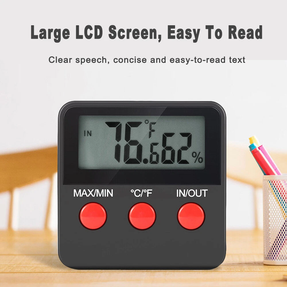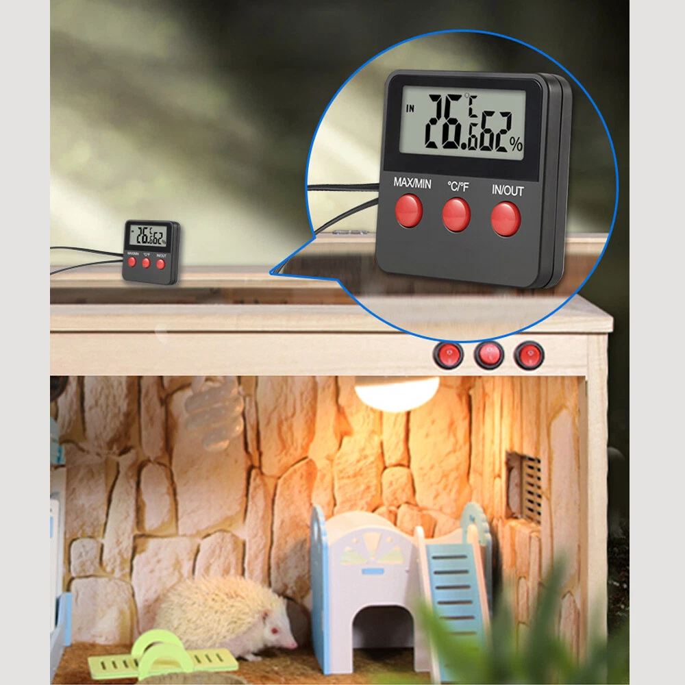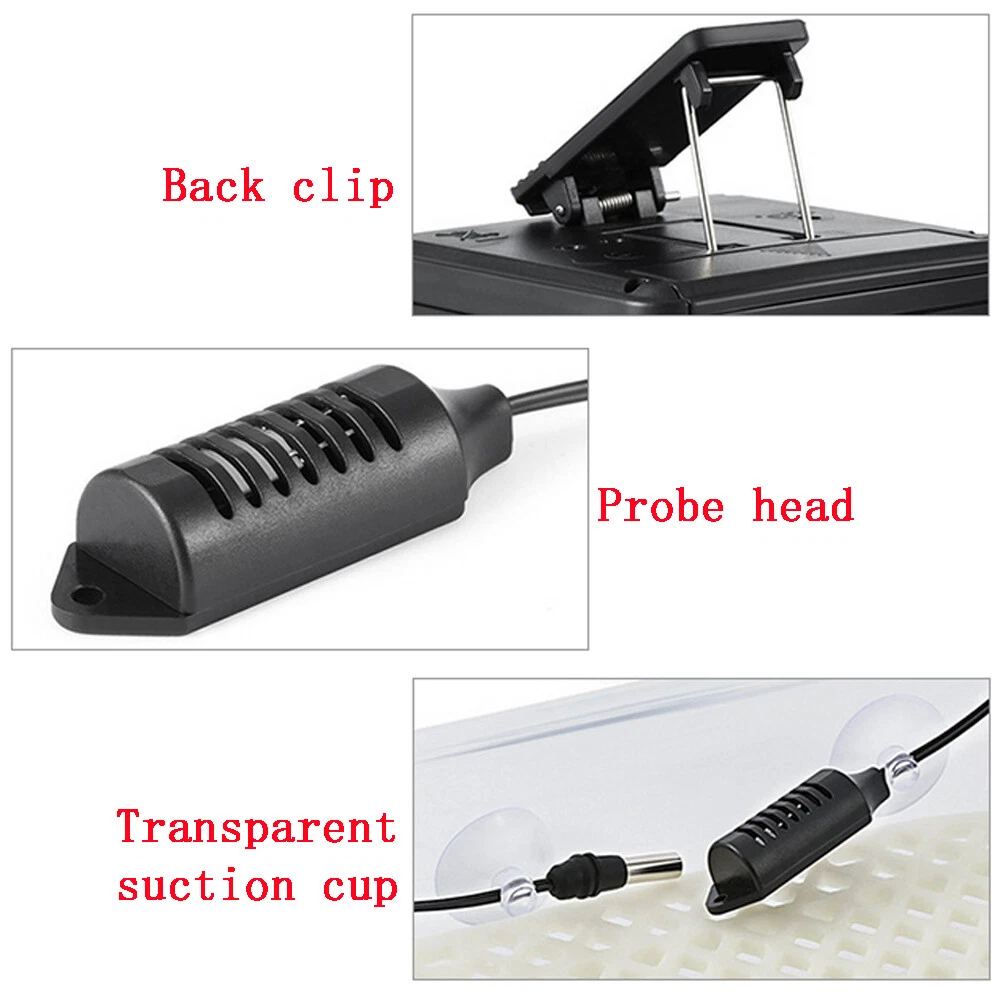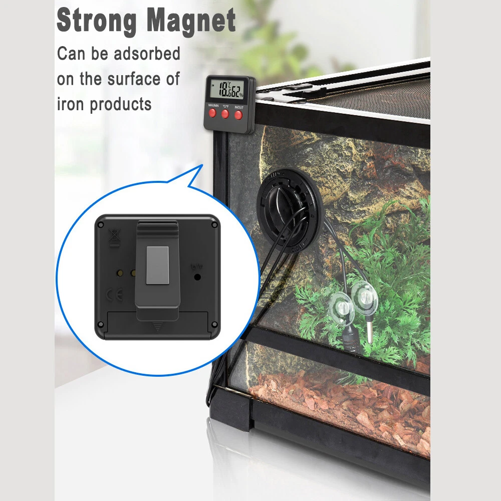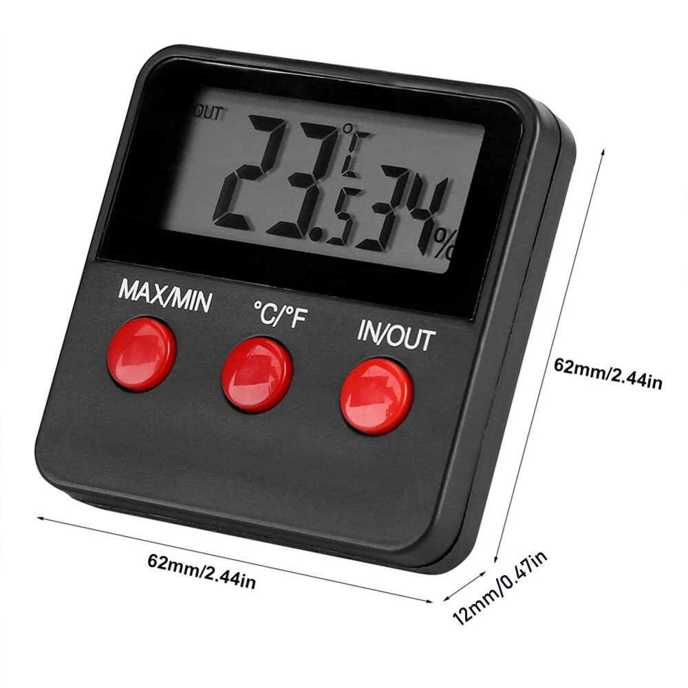Digital Thermometer Hygrometer Humidity Meters W/ Probe for Egg Incubator Note: Not used for Fish Aquariums. Description: 🔹 ESSENTIAL REPTILE THERMOMETER HYGROMETER - Monitor temperature and humidity of reptile tanks and terrariums with this easy to use digital thermometer and humidity gauge. 🔹 COMPLETE WITH TWO PROBES – Easy to use digital reptile thermometer hygrometer with two external probes, one for temperature and one for humidity monitoring. WHERE TO USE IT – This accurate digital thermometer hygrometer can be used anywhere temperature and humidity needs to be monitored. For example: terrariums, reptile tanks and humidors. 🔹 MAX/MIN MEMORY: Temperature and humidity recording digital thermometer / hygrometer consecutively stores the minimum and maximum values, so you are always up to date on any deviations in the terrarium. (Please note: The max min function is for temperature, not humidity. The humidity level is measured using the remote humidity probe and will NOT store max min values.) 🔹 COMES WITH TWO (2) 4.9ft Probes: which allows for maximum flexibility during installation for larger terrariums, Each external probe has a cable length of 1.5 meter/4.9ft with suction cup,for mounting the probes on the terrarium glass. 🔹 3 In 1 MOUNTING (3 Versatile Positions): 1. Large strong magnet on the back to attach to a metal surface 2. Large spring mounted retractable clip to attach to clothes or visor 3. Pinch the retractable stand and it will sit on a table top 🔹 AAA BATTERY: Runs on one 1.5V AAA battery for hours of running time ( Not Included ) 🔹 Buttons: MAX/MIN: Current / Highest / Lowest Temperatures and Humidity Levels °C/°F : Switch from Celsius to Fahrenheit IN/OUT: Switch from Room Temperature / Probe Temperature Features: This product is used to measure temperature and humidity of indoor and outdoor. Perfect for home supplying,egg incubator, pet keeping ect. ℃/℉ display is switchable, convenient to operate. The IN/OUT button can switch IN/OUT display. With MAX/MIN temperature & humidity and automatic memory function. Each external probe has cable length of 1.5M with suction cup. Simply installed on the glass/acrylic board or just placed on the table. With magnet , can be hung on metal material. Specifications: Material: Plastic Shell Type: LCD Digital Thermometer and Hygrometer Thermometer Deviation: ±1℃ Hygrometer Deviation: ±5% Indoor Temperature Range:-10C~50C (14F~122F) Outdoor Temperature Range: -50~70C(- 58F~158F) Outdoor Humidity Measuring Range:-10~ 95%RH Battery:1 * 1.5V AAA (not included) Updating Frequency: 10S Size:63x63x12mm Package Included: 1 * Digital Temperature and Humidity Meter 【Service Guarantee】Welcome to My Store^_^ If you like the product, you can add it into your cart, and you can also add me to favourite seller^_^ IWe try to accurately describe our item to the best of our knowledge, if there is any incorrect, Please contact us via message firstly before leaving neutral or negative feedback or opening return request or case. We will reply to you as soon as possible when we see your email at work. ^_^ Brand Unbranded MPN Does not apply Display Type LCD Size 63x63x12mm Model Digital LCD indoor/outdoor Thermometer Indoor-Outdoor Use Indoor/Outdoor Material Plastic Shell Type LCD Digital Thermometer and Hygrometer Thermometer Deviation ±1℃ Hygrometer Deviation ±5% Indoor Temperature Range -10C~50C (14F~122F) Outdoor Temperature Range -50~70C(- 58F~158F) Outdoor Humidity Measuring Range -10~ 95%RH Battery 1 * 1.5V AAA(not included) Updating Frequency 10S Features LCD Display Color Black Manufacturer Warranty 6 Months