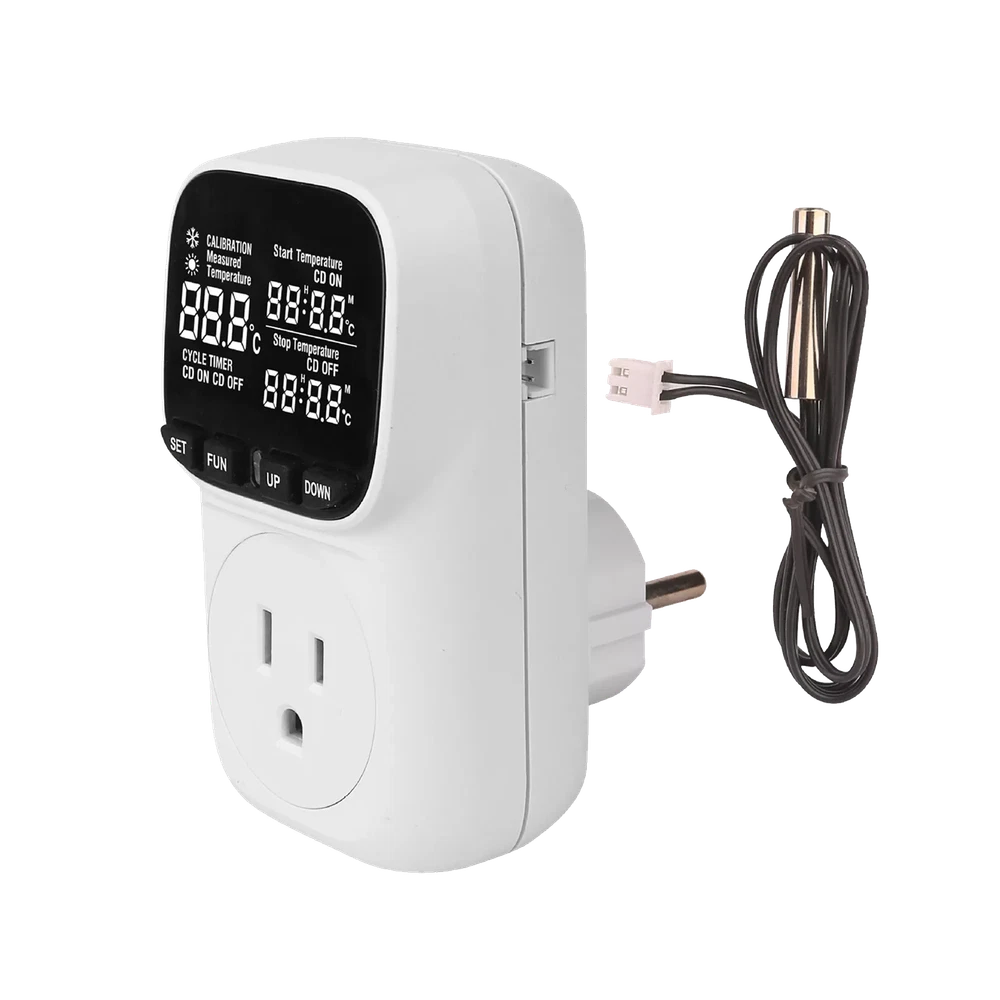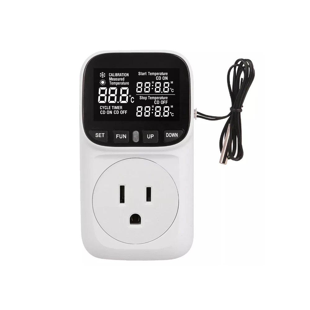 Product Detail: Note:If you have any questions, please contact us before open any case, we promise will solve the problem for you. Thanks! This thermostat plug has temperature control function and timing function. It is widely used for aquarium, reptile, incubator, terrarium, freezer, refrigerator, heater, fridge, homebrew, vivarium, fermentation, pet breeding, heat mat, industrial equipment and other temperature-controlled system. Features: Temperature control function: Heating/cooling. Timing function: F01-F04 4 Modes, Cycle timing and Countdown. Memory function: all current settings will be saved after power off. Factory reset. Specification: Power Supply: AC 110V±15% 60Hz Temperature control range: -40~248℉ (-40℃~120℃) Control accuracy: ±1% Sensor: 2 meters Output: Max 15A/110V Timing accuracy: MAX 1 minute Local power consumption: <0.8W Note: 1. Please allow minor deviation due to manual measurement. 2. Due to the difference between different monitors, the picture may not reflect the actual color of the item. 3. Communication is the best way to solve the problem. If you have any problems after purchasing, please contact us in time, before opening return or case. Payment: We accept PayPal ONLY currently. Payment must be made within 3 business days. Shipping: 1. Item will be shipped within 1-5 business days from CN Stock or US Stock according to the item location. 2. Sometimes the ship date will be delayed due to a shortage. We will inform you via message. 3. Please leave available address and phone # in delivery information. Seller are not responsible for wrong address. 4. Please indicate your personal requirement such as colors, packages, value of declaration etc. at PayPal's message when make payment. 5. We will NOT responsible for any delay during delivery including but not limited to customs postage checking, strike, force measure etc. Customs Declaration: Import duties, taxes and charges are not included in the item price or shipping charges. These charges are the buyer’s responsibility. Please check with your country’s customs office to determine what these additional costs will be prior to biddingying. Return & Refund: Returns are accepted within 30 days. Please read the item description and check the pictures carefully before bidding. Return or refund is available only if item DOA or there's error in item description causing the item not fitting your need. In such cases, seller pays for all related shipping cost if any. Returns are also acceptable if buyer purchased this by mistake and item still in good condition for reselling. Buyer is responsible for all related shipping cost. Feedback: As long as you are happy with your purchase, please kindly leave us for it is very important for our store performance. If there is any problem with your order, please contact us and give us a chance to resolve your problem Before leaving us a negative feedback.