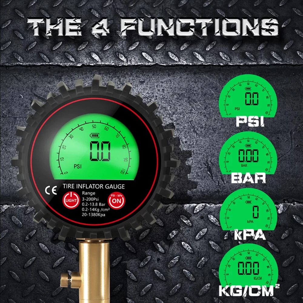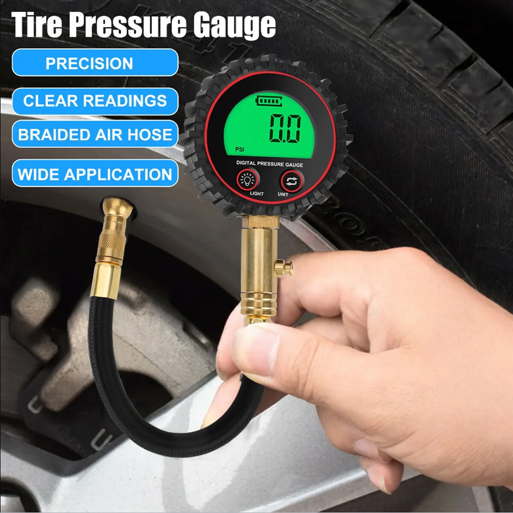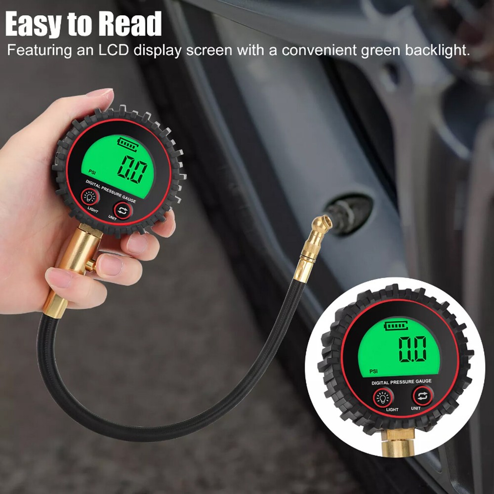 Accurate Digital Air Pressure Tire Gauge 3-255 PSI LCD Screen for Truck Car Bike Product Features ✨RUGGED & RELIA BLE: Our tire pressure gauge is constructed from heavy-duty steel and brass, ensuring long-term durability. The brass head swivels with an extended 6mm chuck tip, making it easy to connect regardless of the valve stem's position. ✨ACCURACY: Our digital tire pressure gauge is meticulously calibrated to provide tire pressure readings within a (±1%) margin of error. It measures a range from 3-255 PSI. ✨SWITCHABLE DESIGN: The tire pressure gauge offers the flexibility to switch between four units of measurement at will: PSI, KPA, Bar, and Kg/cm². ✨EASY TO READ: Featuring an LCD display screen with a convenient green backlight, our tire gauge ensures perfect visibility even in the dark. Additionally, it includes an auto shut-off function. ✨EASY TO USE: Equipped with a built-in air bleeder valve, the digital tire pressure gauge allows for pressure reduction in overinflated tires. The 360-degree rotation chuck enables easy access to the tire valve from any angle. Power is supplied by 2 AAA batteries (batteries not included). ✨APPLICATION: Widely used for cars, trucks, SUVs, motorcycles, bikes, trailers, and RVs, our tire pressure gauge delivers excellent performance in all weather conditions. Product Specification Type:Tire Pressure Gauge Material:ABS+Brass+Steel Measurement Units:PSI, KPa, Bar, Kg/cm² Measurement Range:3-255PSI, 0.2-18Bar, 20-1758KPa, 0.2-18kg/cm² Accuracy:±1% Working Temperature:-20-60℃ Battery:2 x AAA 1.5V Battery (not included) Package Included 🎁1 x Tire Pressure Gauge Location Descriptions To improve your buying experience and ensure fast delivery, Your order will be shipped from the warehouse located in either new jersey or california that is closest to your address. If you have any questions, Please contact us. Thank you for your support !